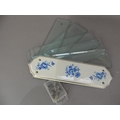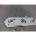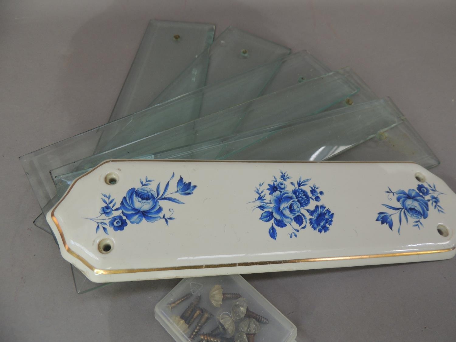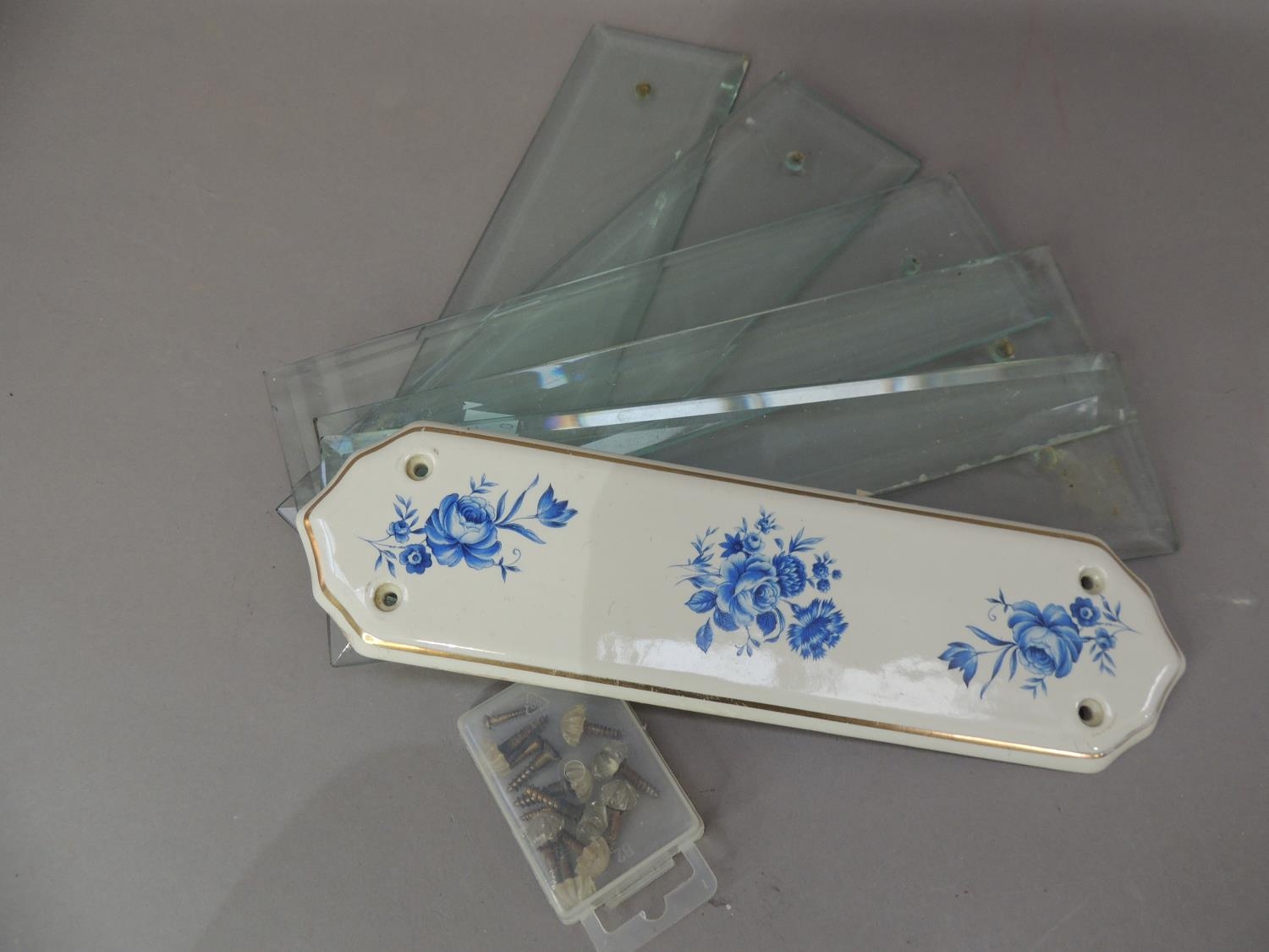 Five vintage bevelled glass door plates with faceted screw heads together with a later blue and white floral printed door plate