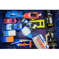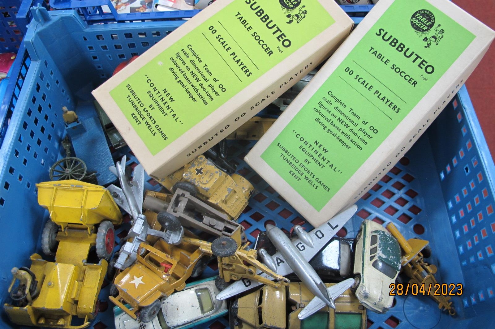 A Collection of Playworn Diecast Model Vehicles, by Corgi, Dinky, Lone Start, Ben Bros, to include Corgi Car Transporter, Dinky Muir Hill Dumper, Benbros U.S Army jeep, Lone Star Small Mobile Fighting Unit; together with two boxed Subbuteo Teams:- red and white striped shirts with black shorts (damages), yellow shorts with black shorts (glue marks noted).