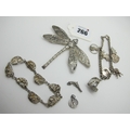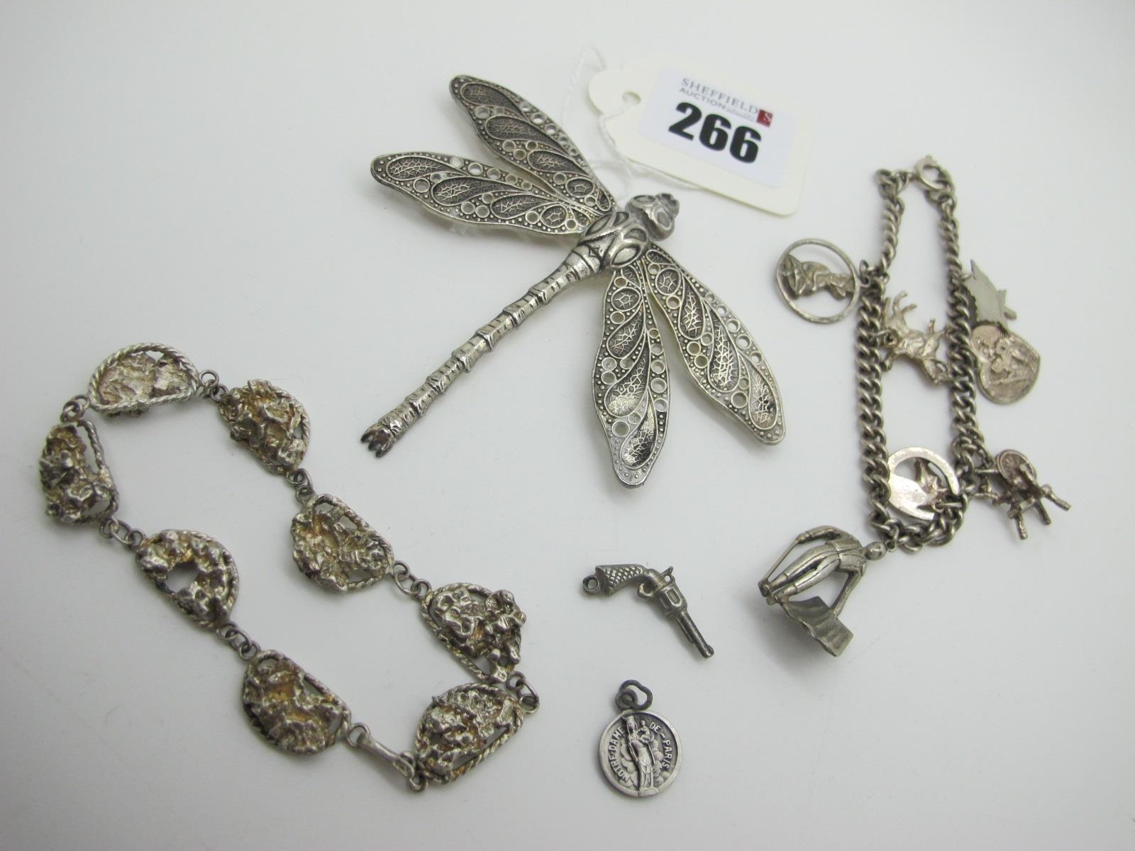 A Curb Link Bracelet, suspending novelty "Sterling Silver" and other charms, another panel style bracelet and a large textured dragonfly brooch, etc.