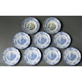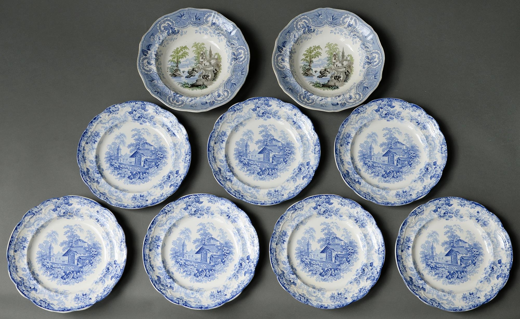 A pair of Davenport multicolour printed Muleteer pattern soup plates, c1835-1839, 26cm diam, impressed and printed marks and a set of seven Minton blue printed earthenware Genevese pattern plates (9)