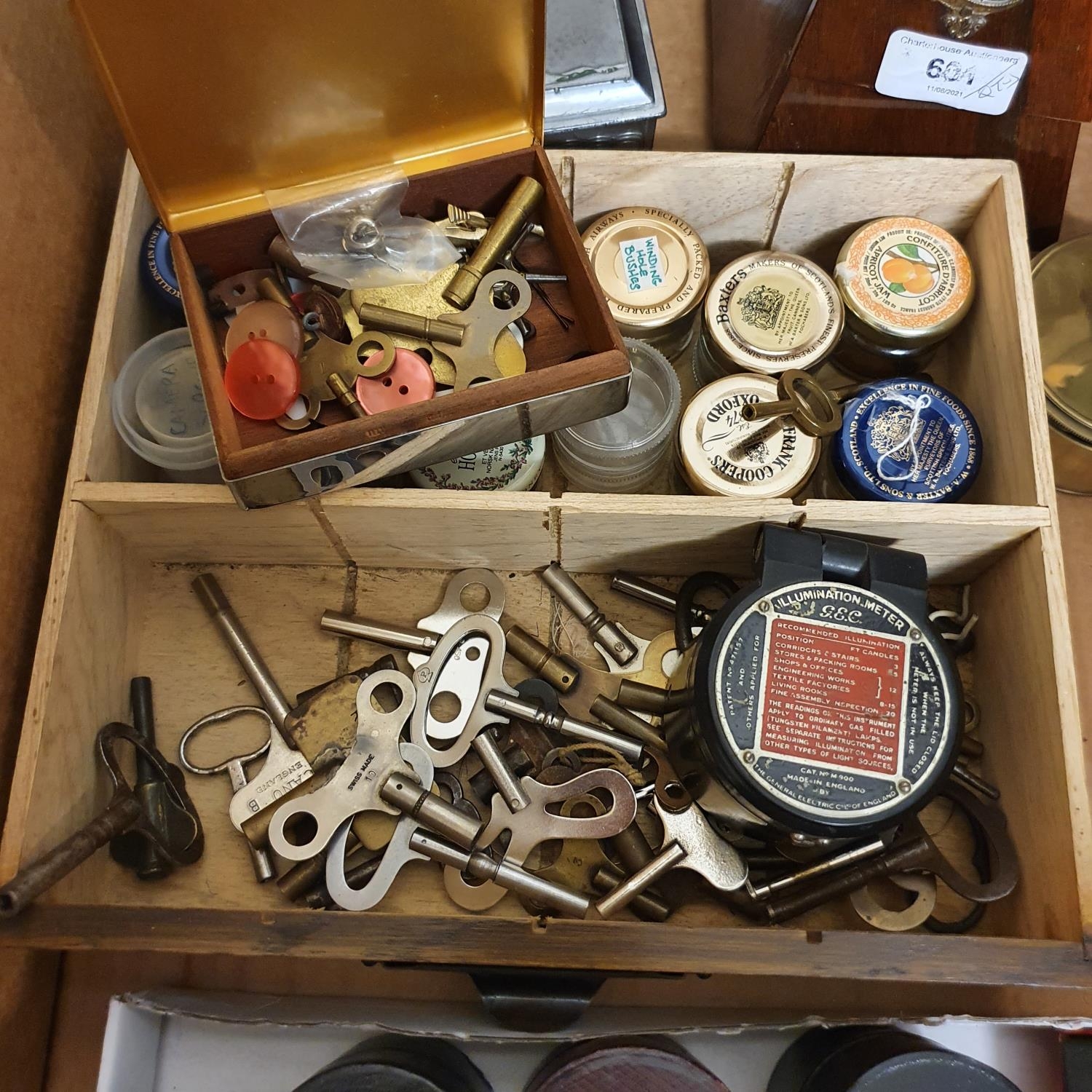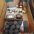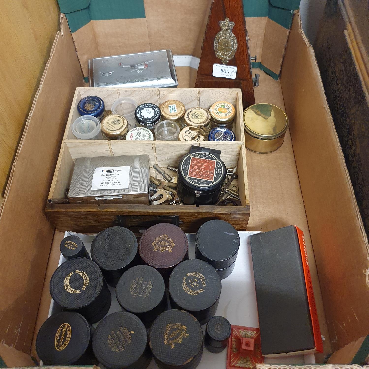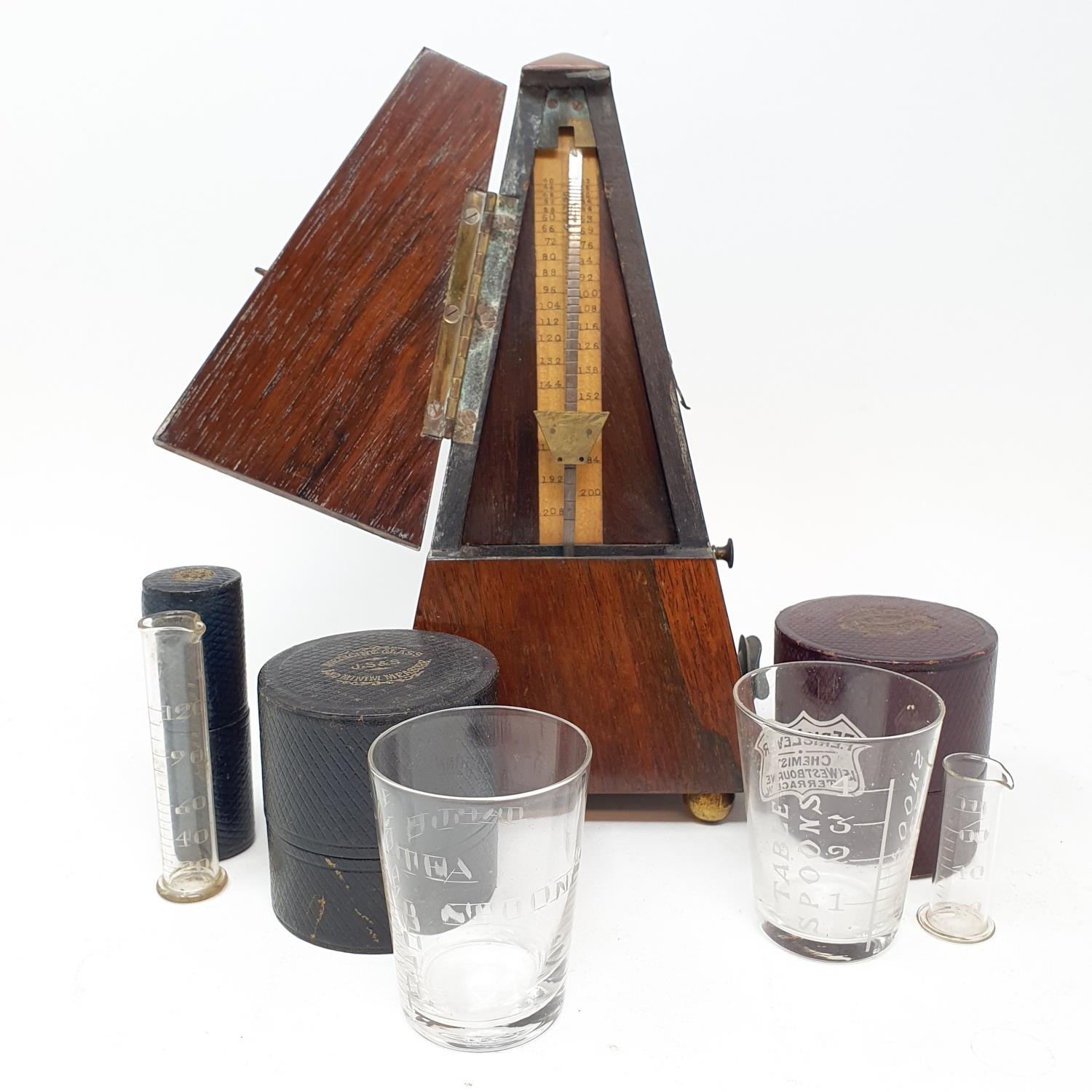 An early 20th century metronome, in a rosewood case, nine glass measures in leather cases and other items (box)
