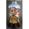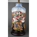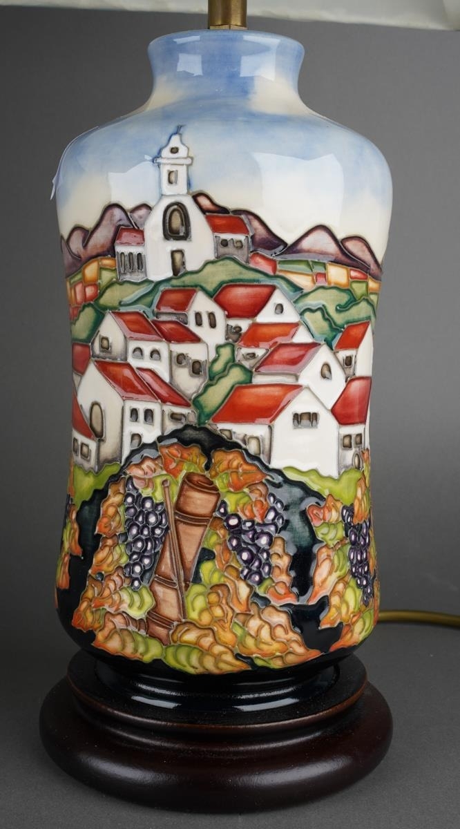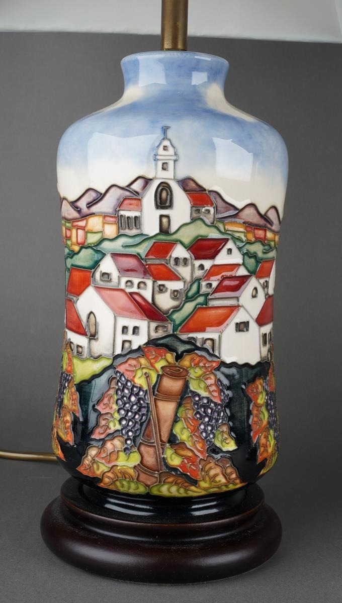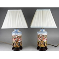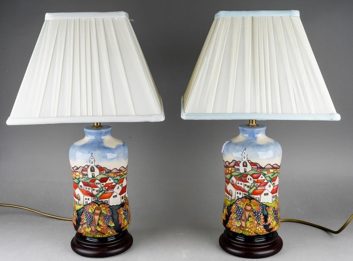 A pair of tube line decorated table lamps with shades in the style of moorcroft, each approx. 32 cm tall including base and fittings, complete with cream shades