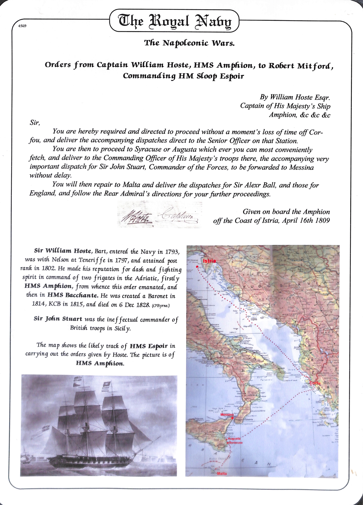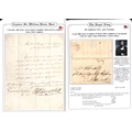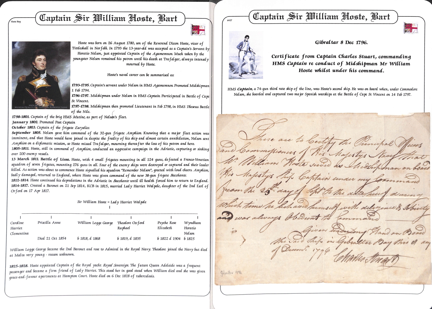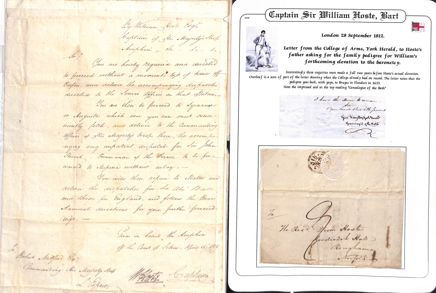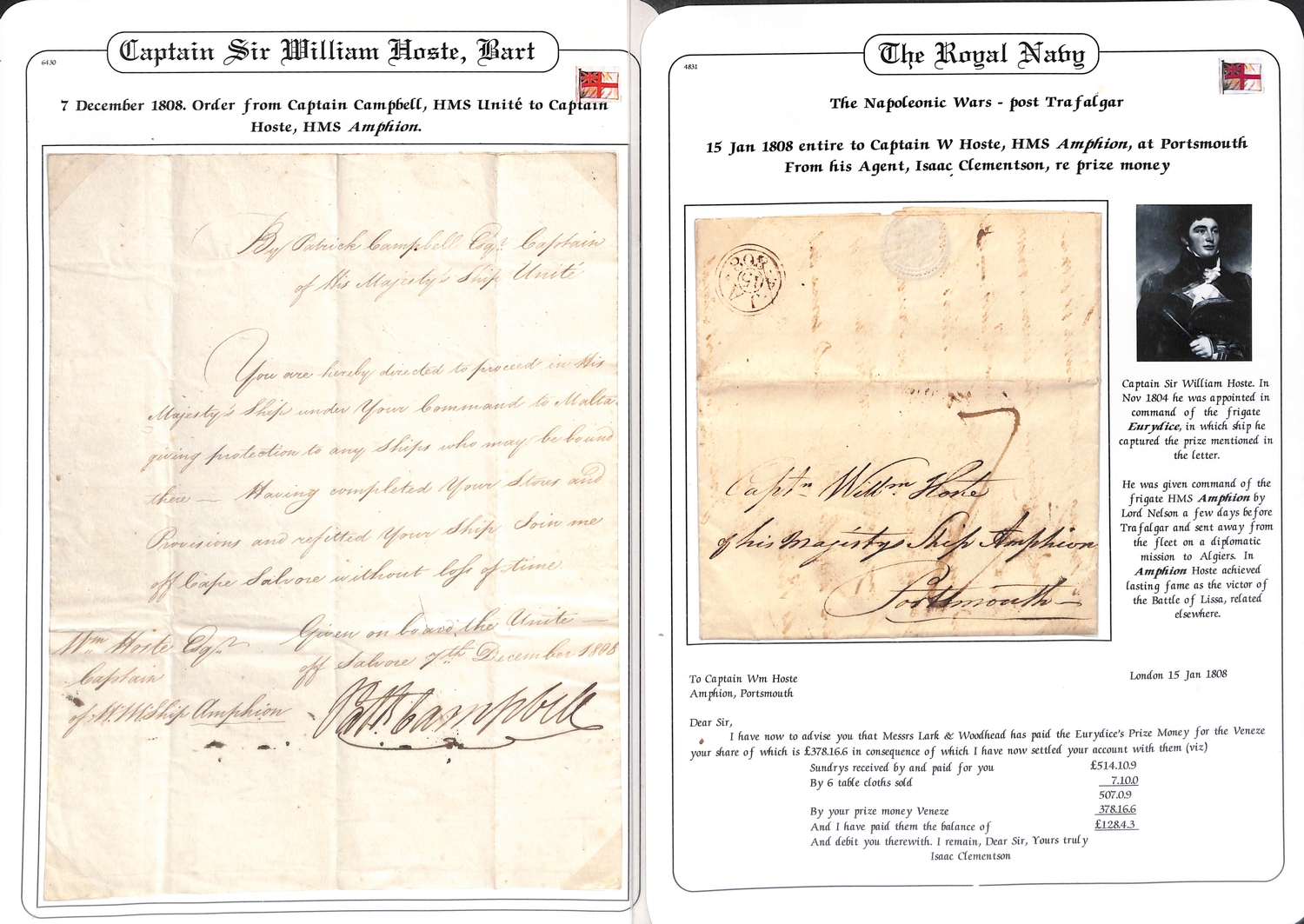 Captain William Hoste. 1796-1812 Letters and orders, comprising 1796 (Dec 8) Certificate of Good Conduct from Capt. Charles Stuart on H.M.S "Captain" at Gibraltar for Hoste, then a 14 year old Midshipman; 1808 (Dec 7) order from Capt Patrick Campbell of H.M.S "UnitÈ" to Capt. Wm. Hoste on H.M.S "Amphion" ordering the Amphion to Malta to take on stores and refit then rejoin Campbell of Cape Salvore; 1808 (Jan 15) letter to Hoste on H.M.S "Amphion" at Portsmouth, posted from London by his agent, concerning prize money for the "Veneze"; 1809 (Apr 16) order from Hoste on H.M.S "Amphion" off the Coast of Istria, to Robert Mitford of H.M Sloop "Espoir" ordering him to Corfu with despatches, to then proceed to Syracuse or Augusta with further despatches for the army, finally to go to Malta with despatches for Sir Alexander Ball; 1812 (Sep. 28) letter posted from London to Hoste s father in Norfolk, from the College of Arms asking for the family pedigree for William Hoste s forthcoming elevation to Baronetcy (which did not occur until 1814). Hoste was promoted by Nelson to Captain in 1798 aged just 18 having served at the Battles of St. Vincent and the Nile; as Captain of the "Amphion" he captured or destroyed over 250 enemy vessels, being severely wounded at the 1811 Battle of Lissa where he defeated a greatly superior squadron, and later captured the forts of Cattaro and Ragusa. (5).