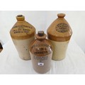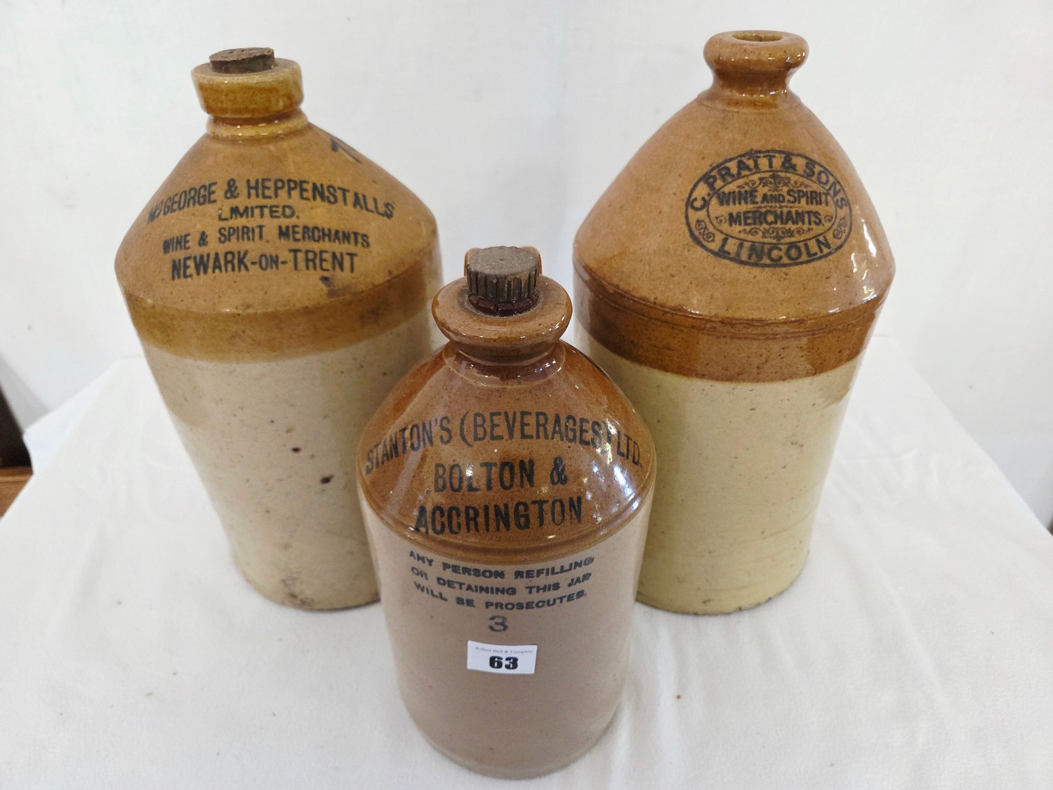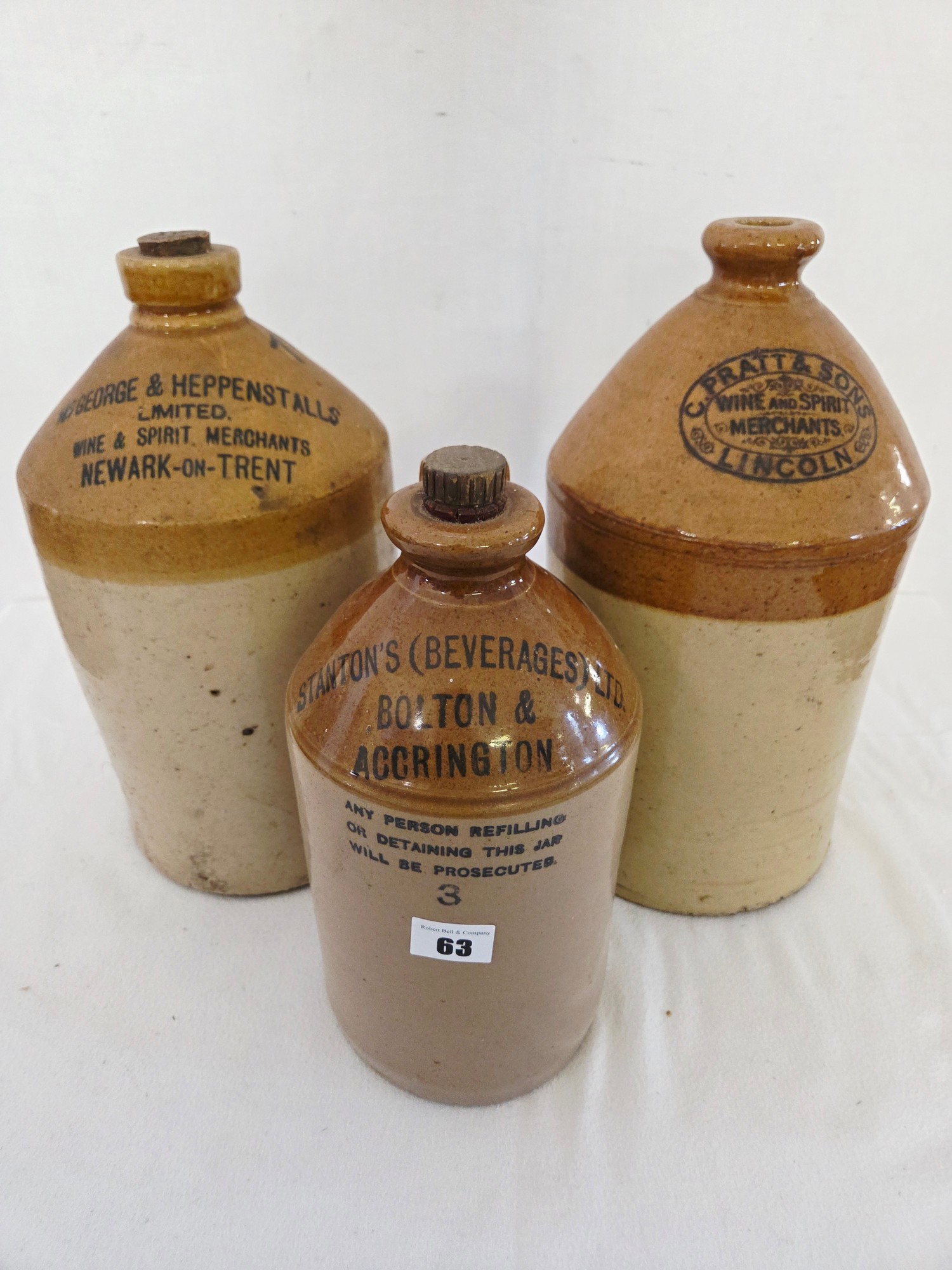 Three various stoneware flagons with printed names incl. Pratt and Sons, Lincoln, Stanton's, Bolton and McGeorge & Heppenstalls, Newark