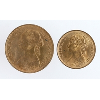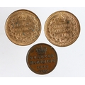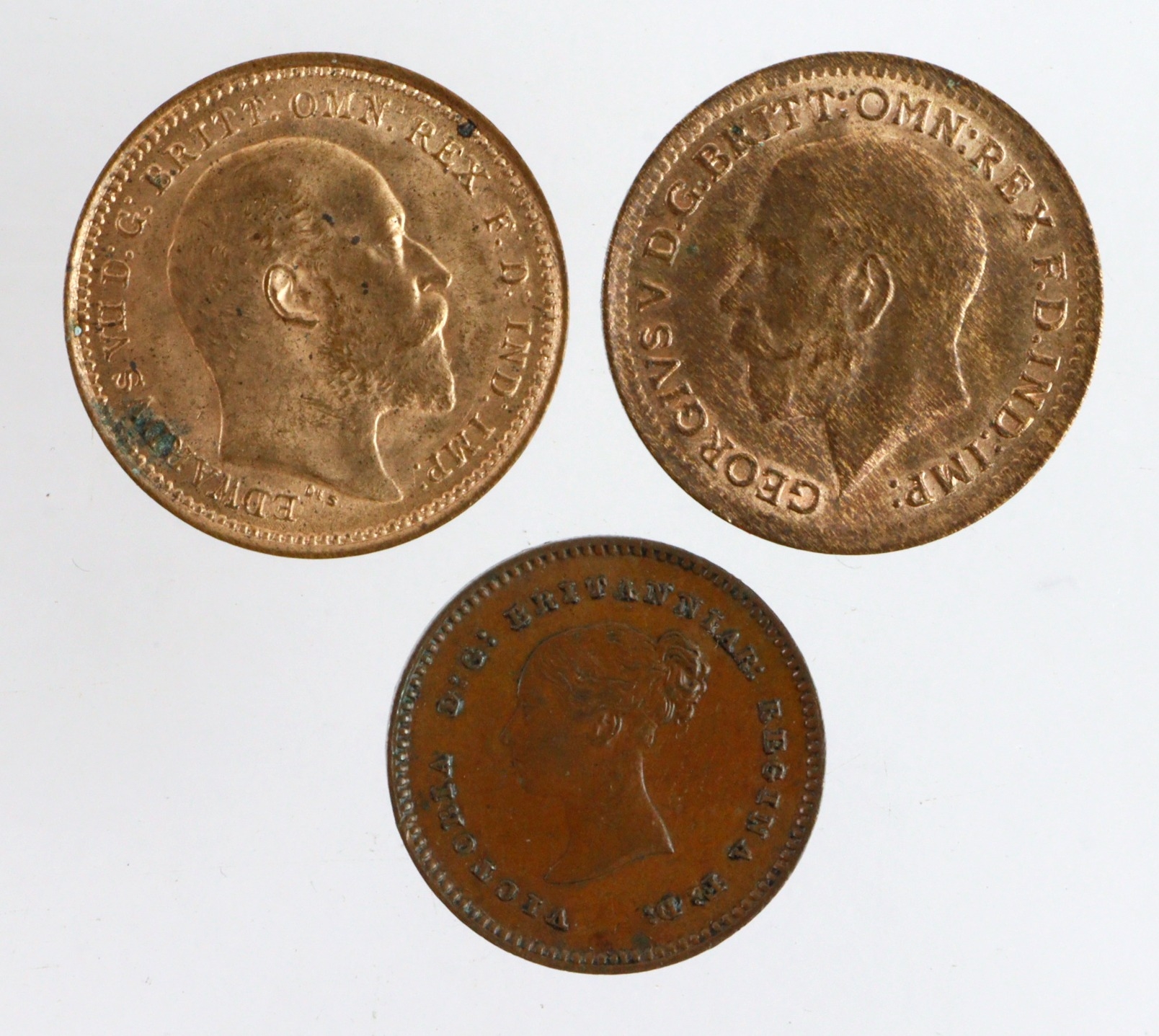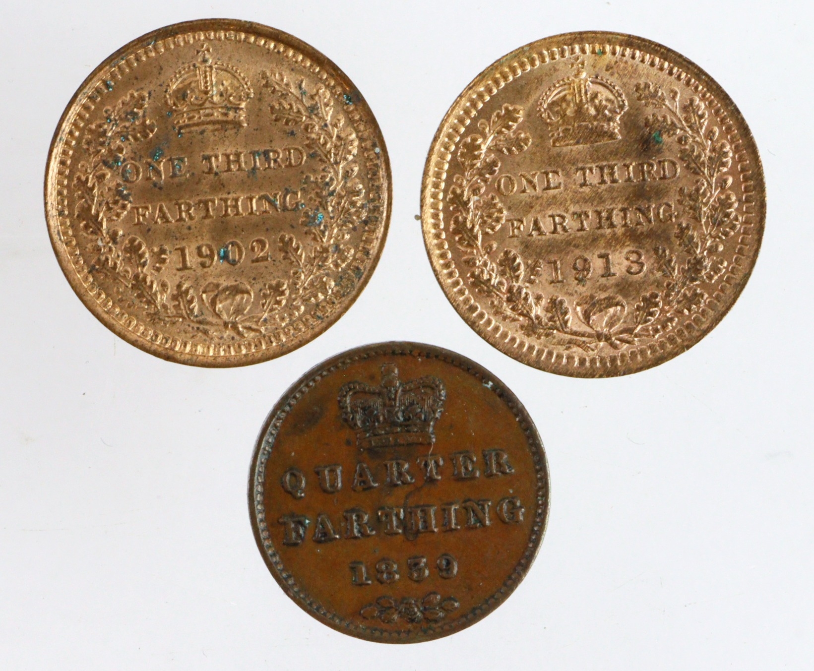 Fractional Farthings (3): 1/4 Farthing 1839 nEF; Third Farthings: 1902 GEF spots, and 1913 EF/GEF.