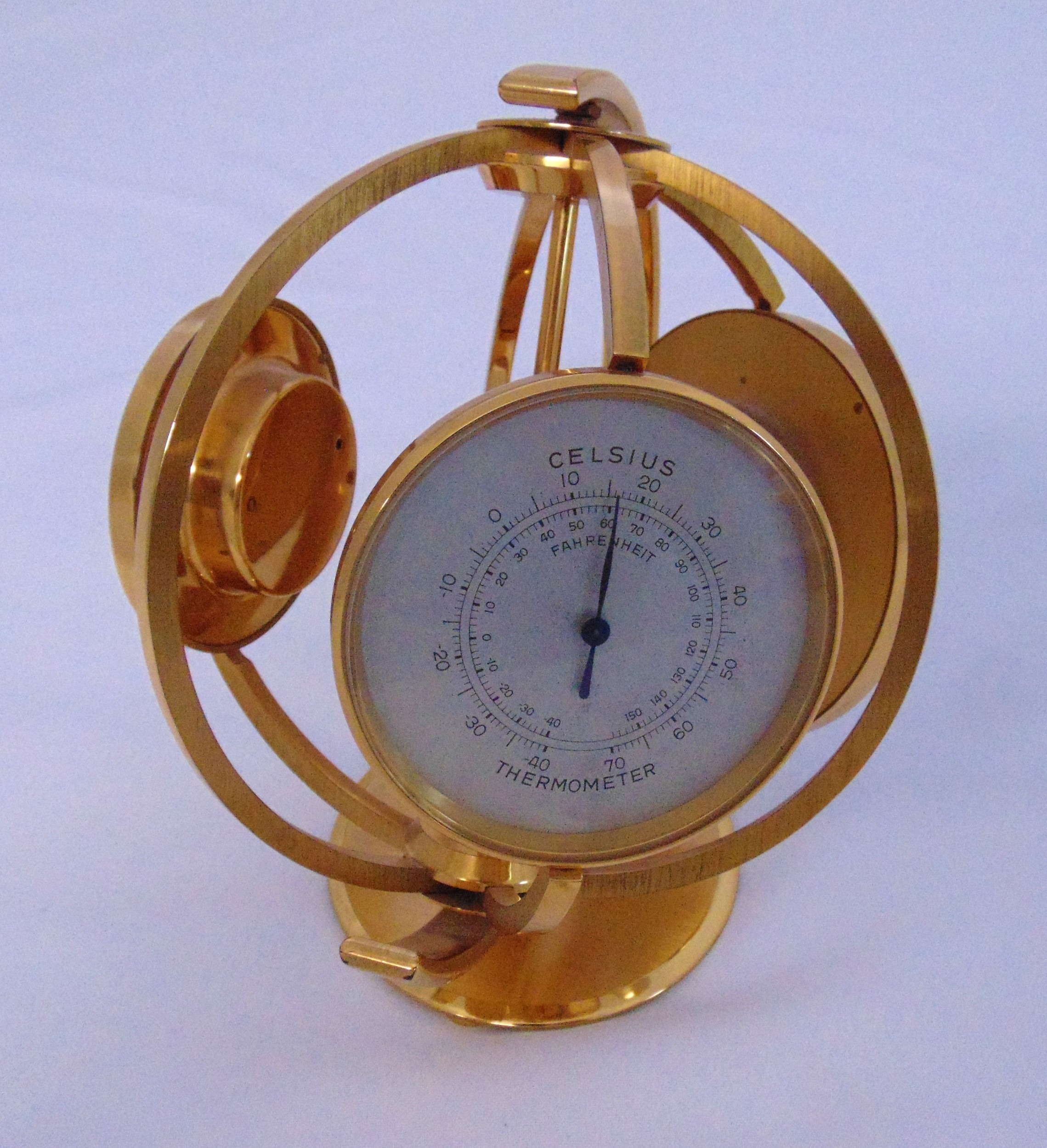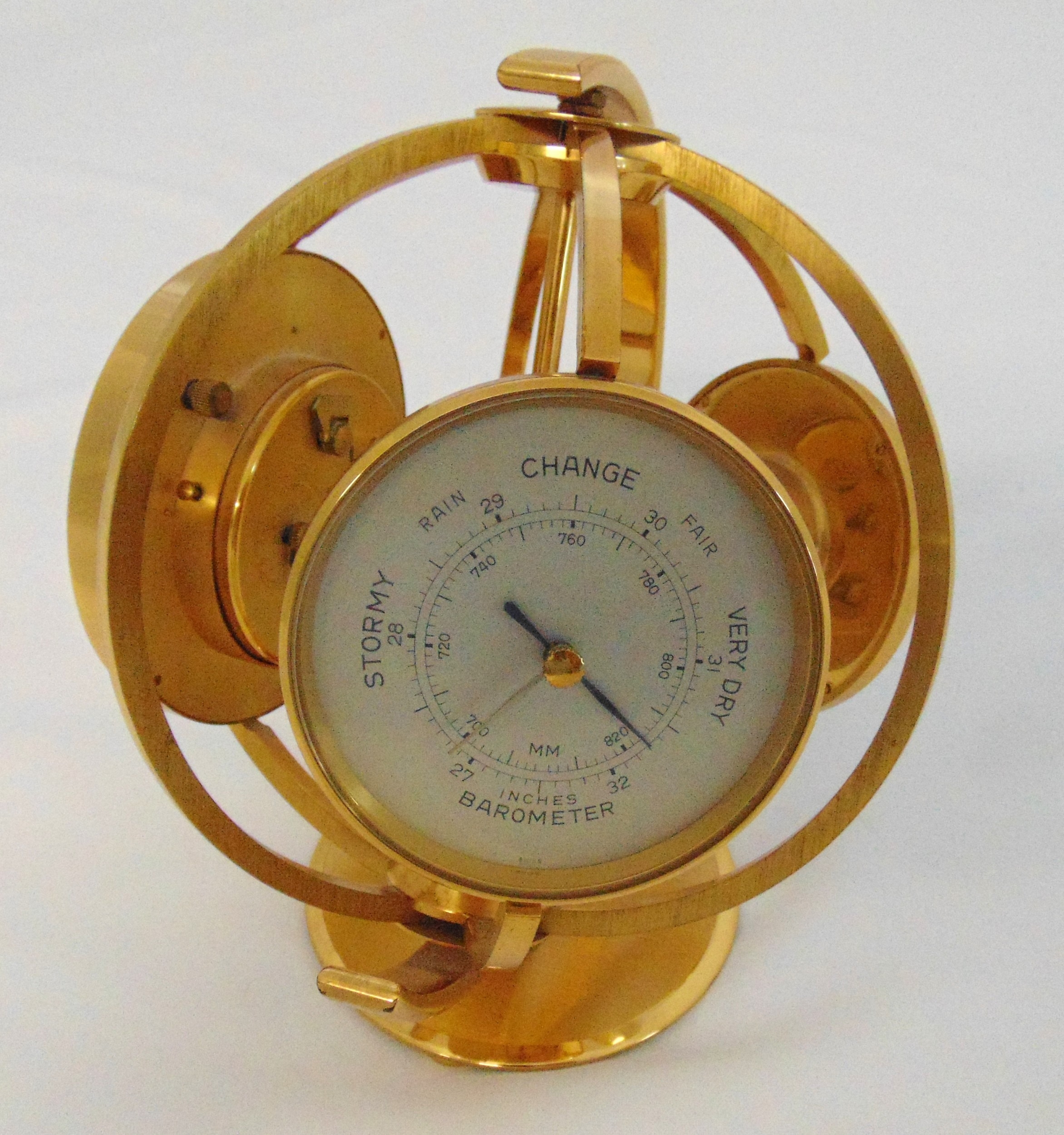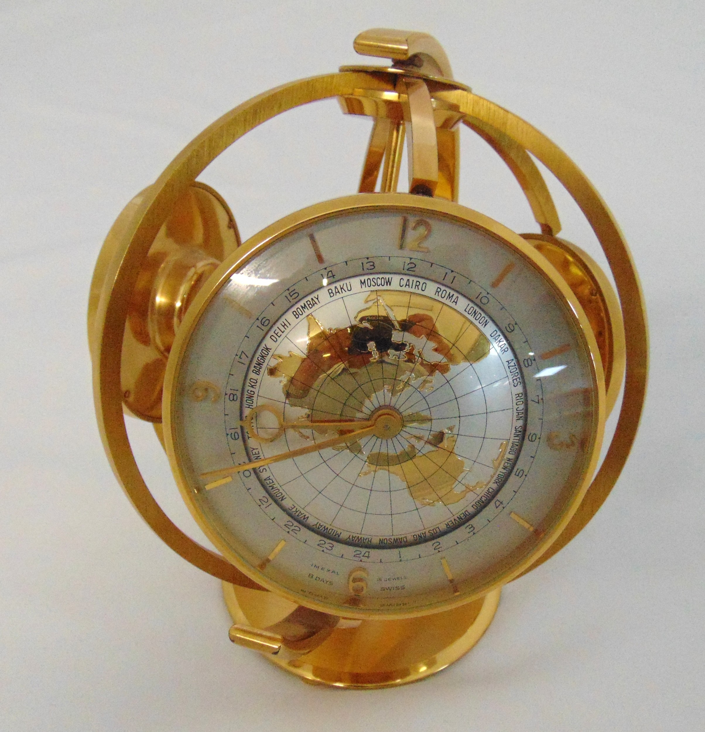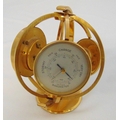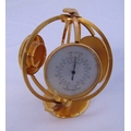 Imexal 8 day gilt metal world clock, barometer and thermometer on revolving stand, 20cm (h)