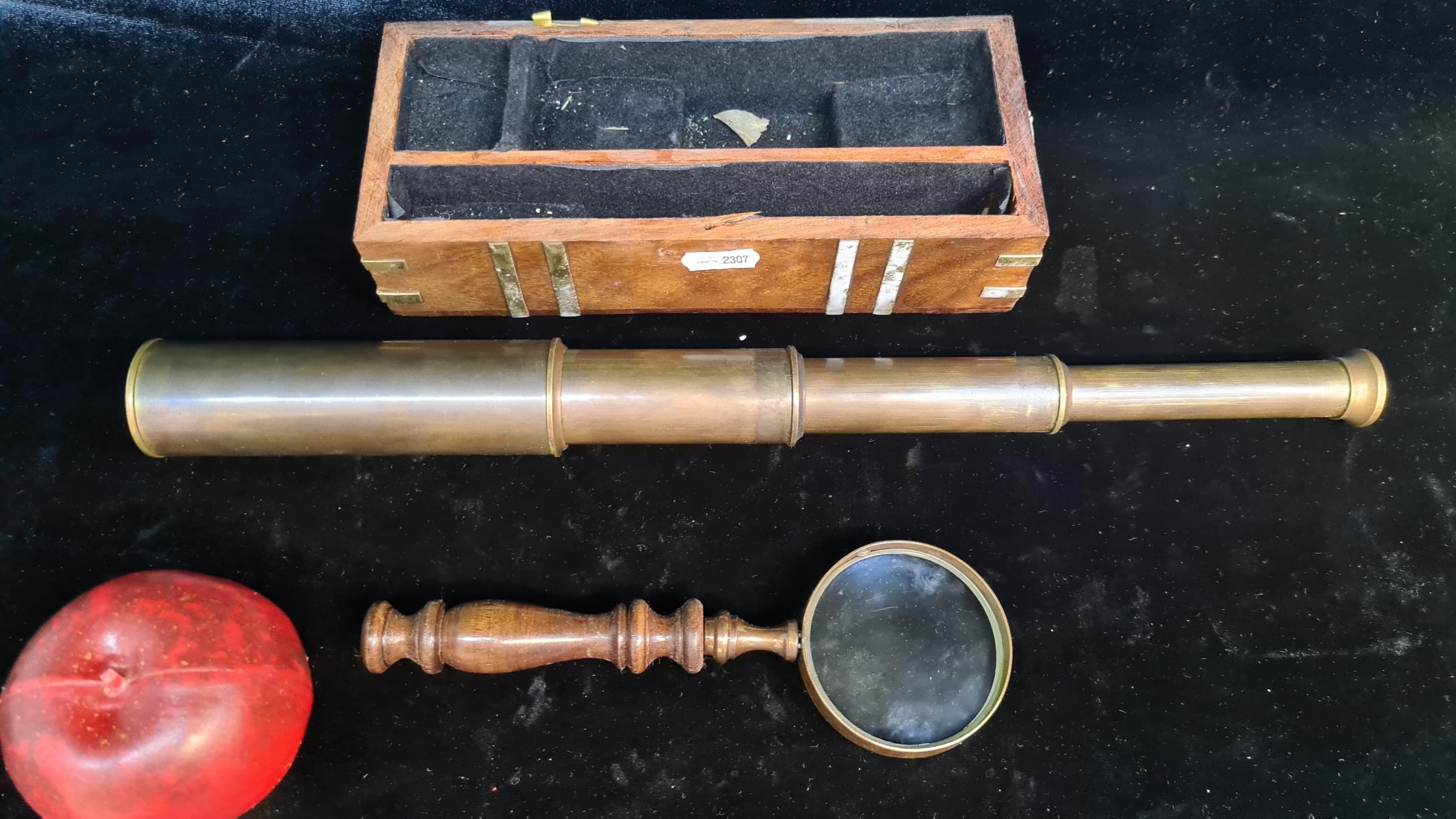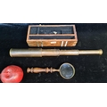 A lovely set comprising of a magnifying glass with turned wooden handle and a brass toned telescope.