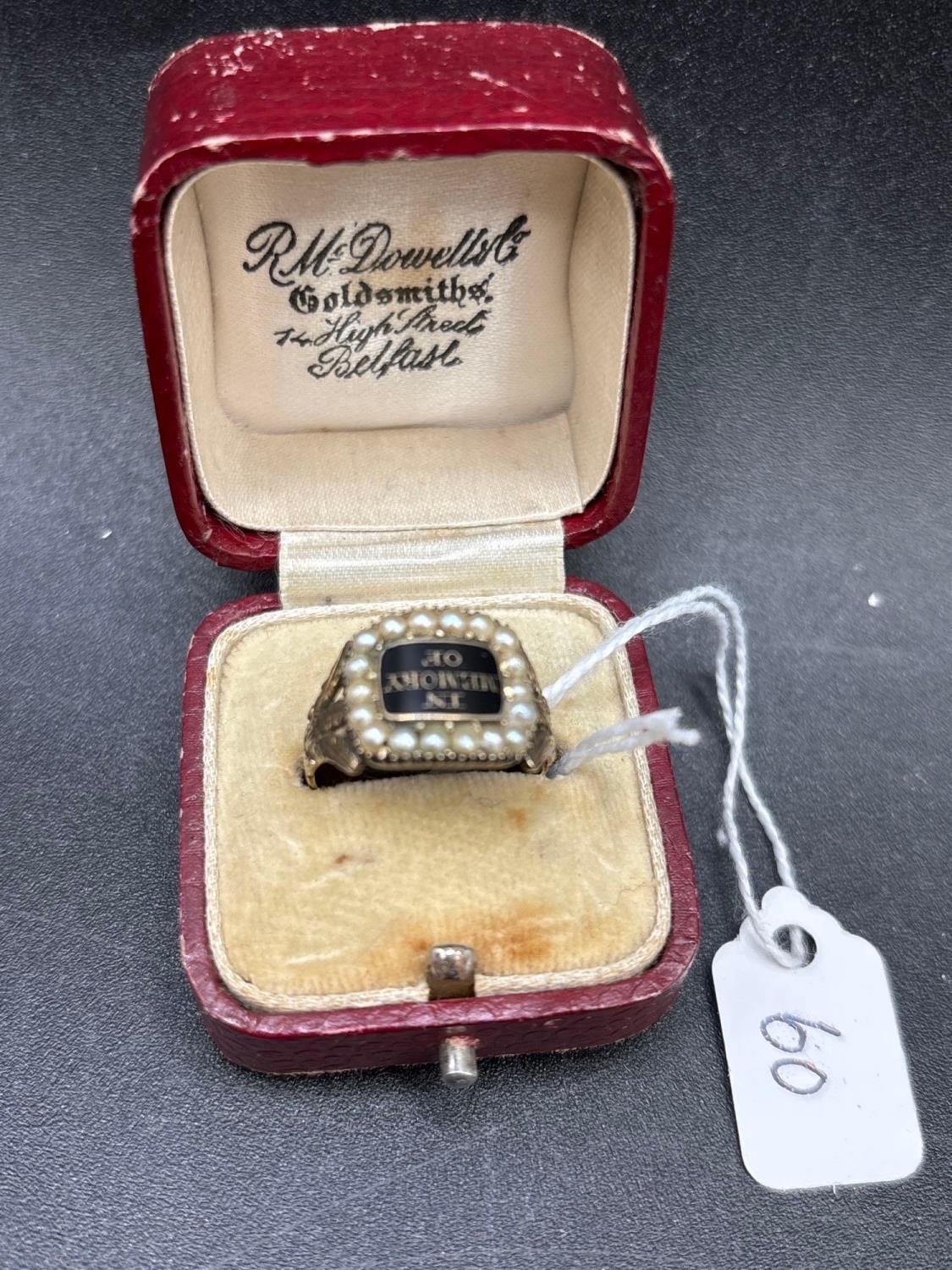 A GEORGIAN GOLD ENAMEL AND PEARL MEMORIAL RING DEDICATED TO JOHN AND ANN MOORE DIED 1835 AND 40 SIZE N BOXED