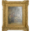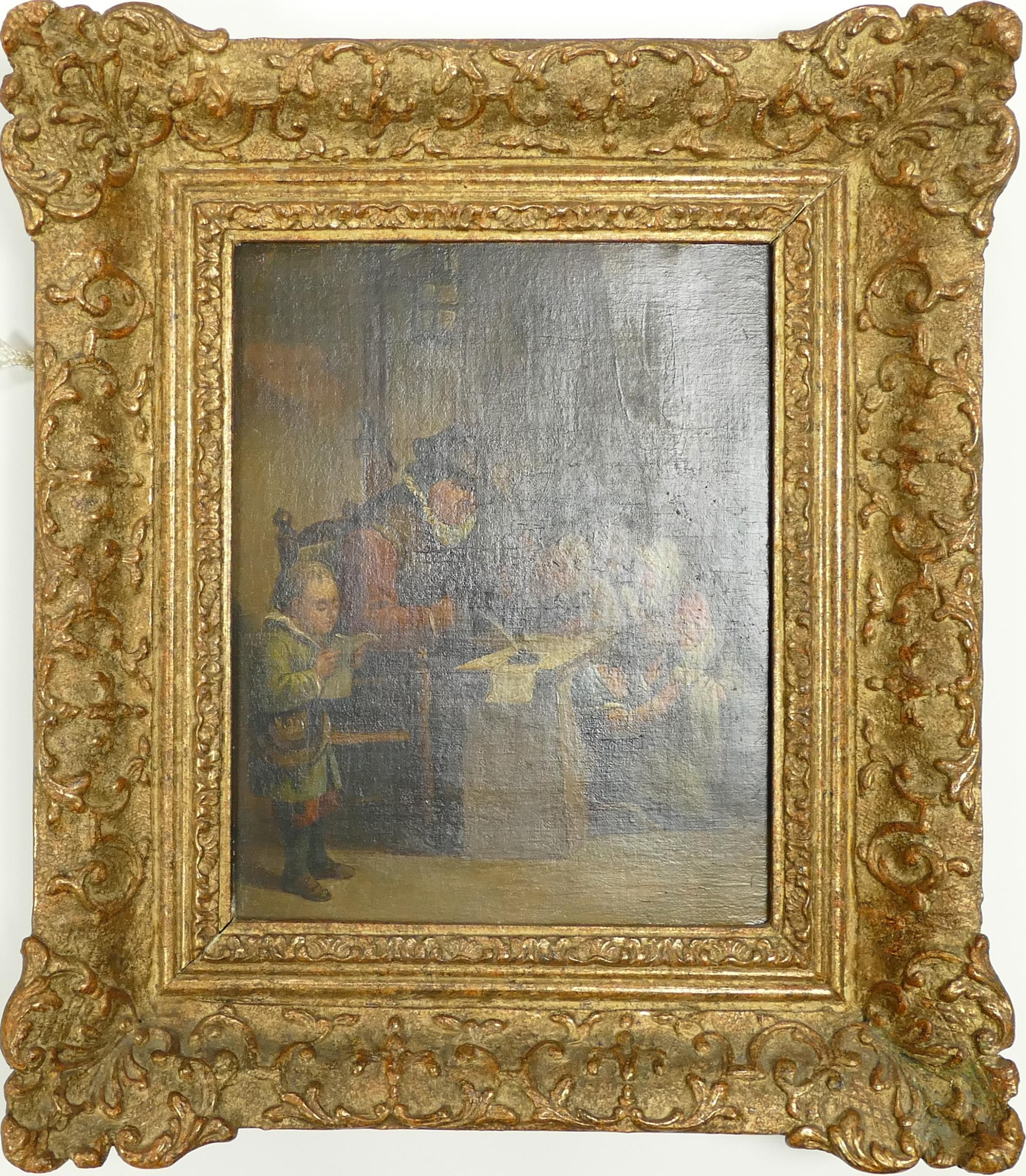 Painting. 18th century style or earlier, oil on canvas. School scene. Measures 25 x 20.3 cm.