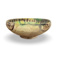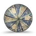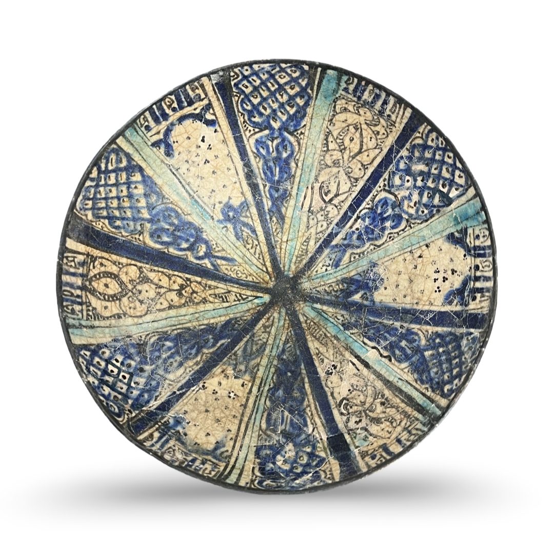 This footed conical bowl is attributed to Kashan, Persia, dating to the 13th or 14th century. The object is constructed of fritware with a polychrome underglaze decorative scheme in cobalt blue, turquoise, and black on a cream ground. The interior decoration consists of twelve radiating wedge-shaped panels originating from a central dark hub. These panels alternate between cobalt blue lattice cross-hatching and stylized foliate motifs, separated by radiating bands of turquoise glaze. The interior rim features a continuous band of pseudo-calligraphic characters in dark pigment, mimicking the rhythm of Kufic or Naskh scripts. The exterior is decorated with vertical radiating blue lines and rows of black dots below a dark rim band.