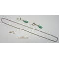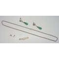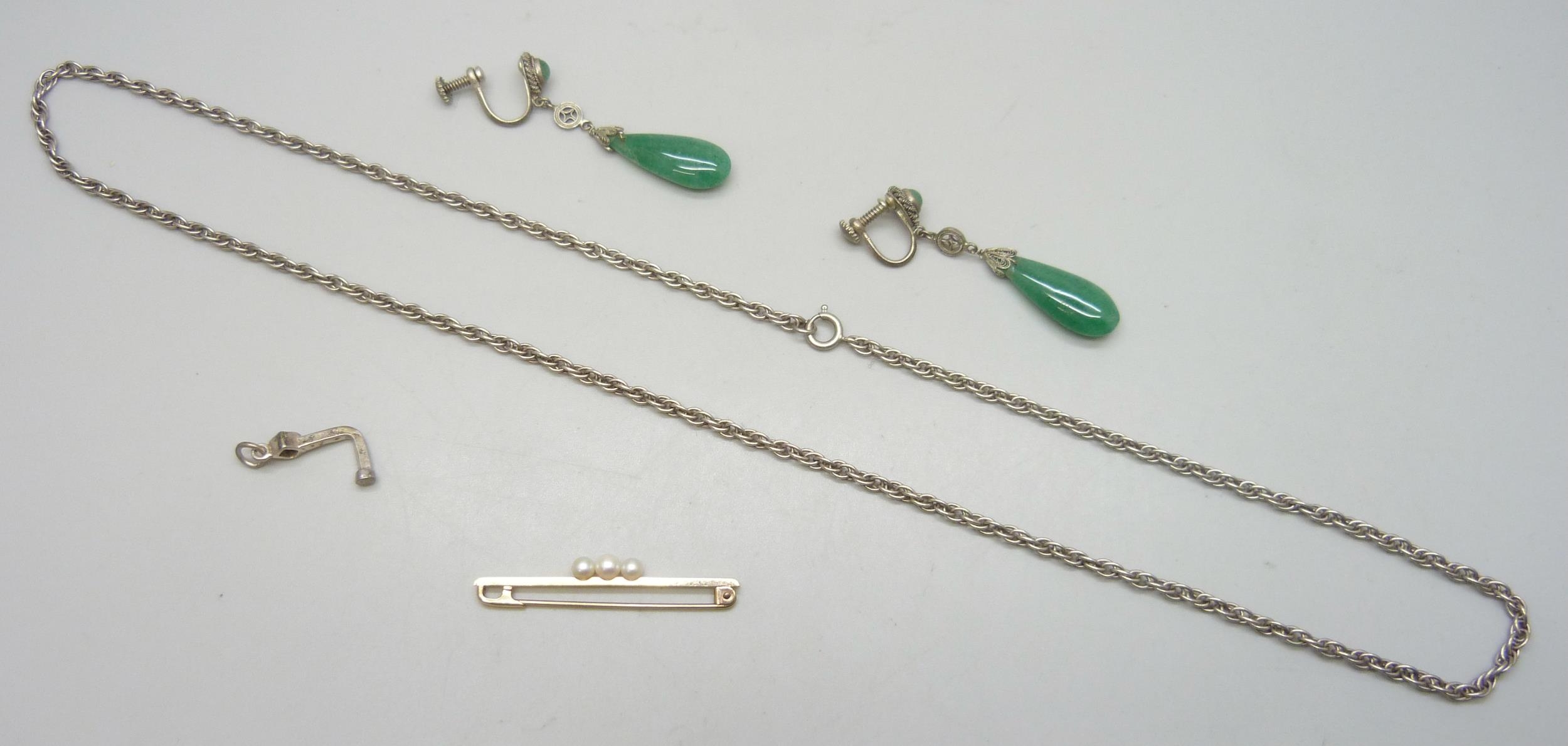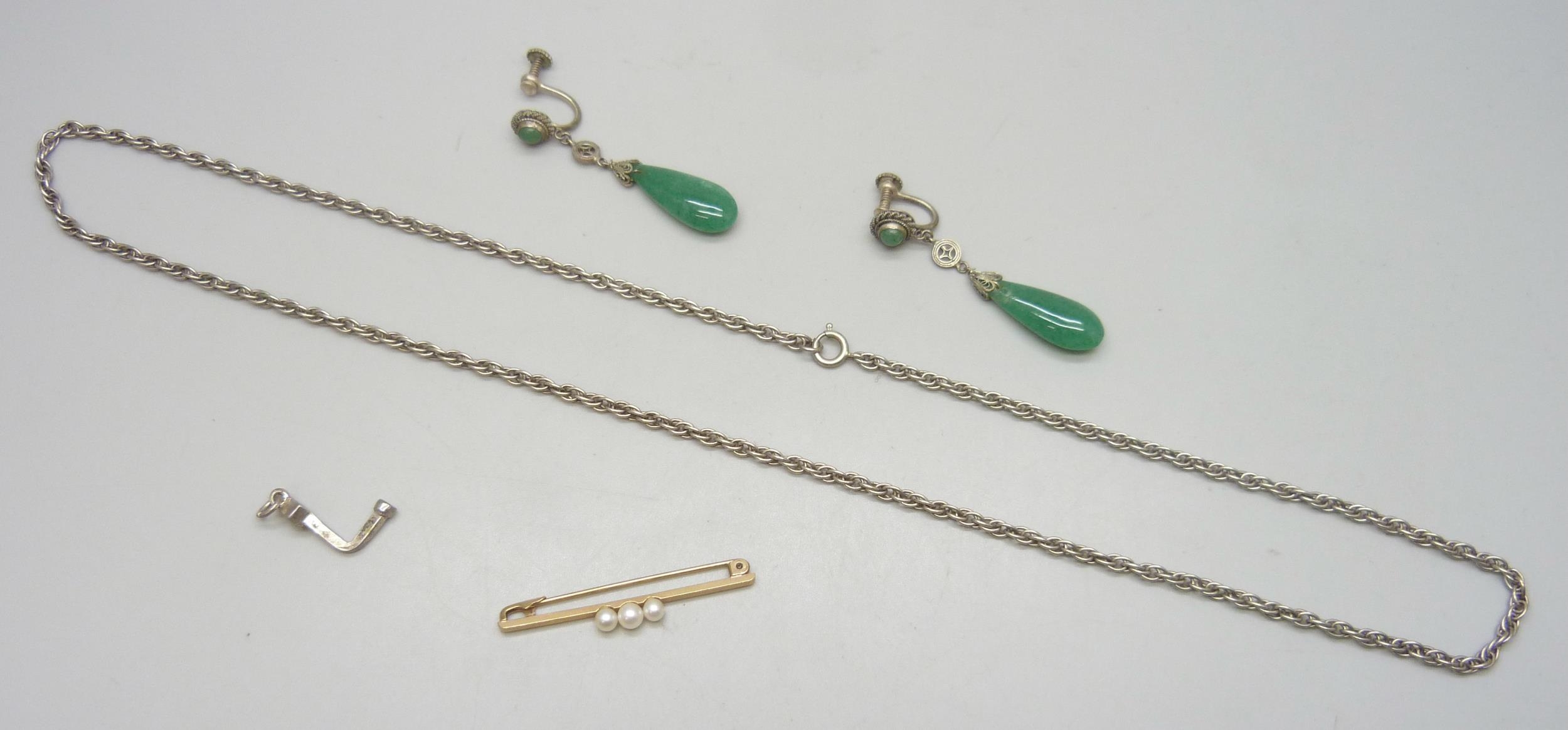 A 9ct gold pearl bar brooch (glue residue to pearls), 1.7g, 4.3cm, a pair of Eastern earrings set with jade/jadeite, and a silver rope chain, 13g