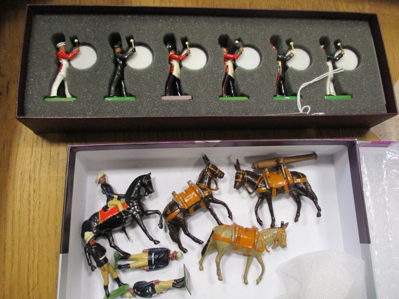 Collection with Drums and Bugles of the Line No 30, The Princess Charlotte of Wales 95th Dragoon Guards No 8821 and 25th Cavalry Frontier Force No 8844, plus ranges from Britains mountain artillery, cavalry, highlanders, horse-mounted, marching bandsmen, etc, some plastic, generally good plus to excellent, mostly reproduction or unrelated boxes. Qty 73 approx. (3B)