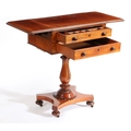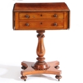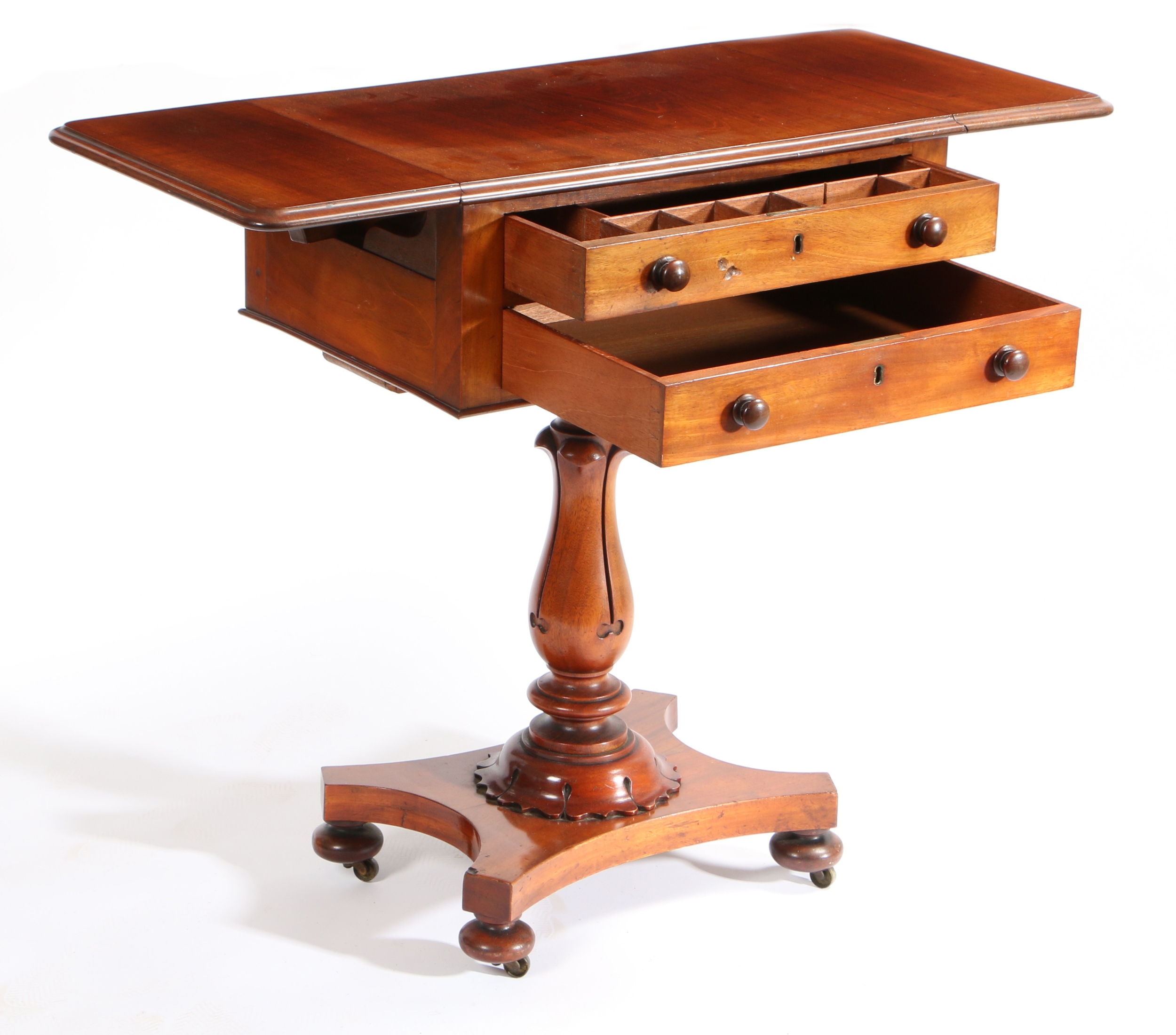 A VICTORIAN MAHOGANY SEWING TABLE. having a rectangular top with drop sides above two drawers raised on a baluster column and an X frame base raised on bun feet with castors, 73cm high, 53cm wide when in smallest form.
