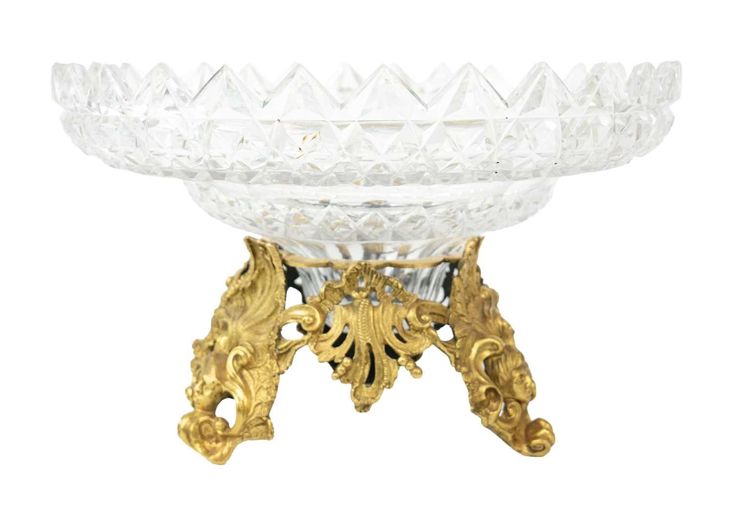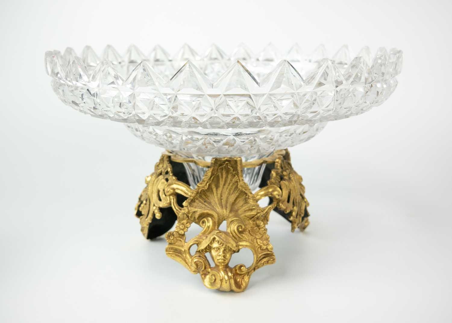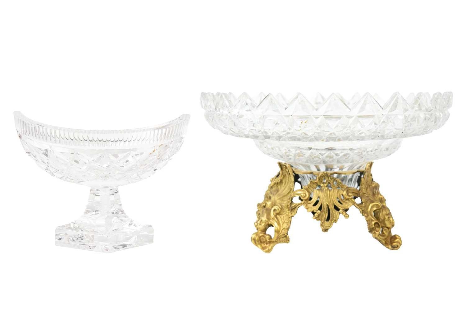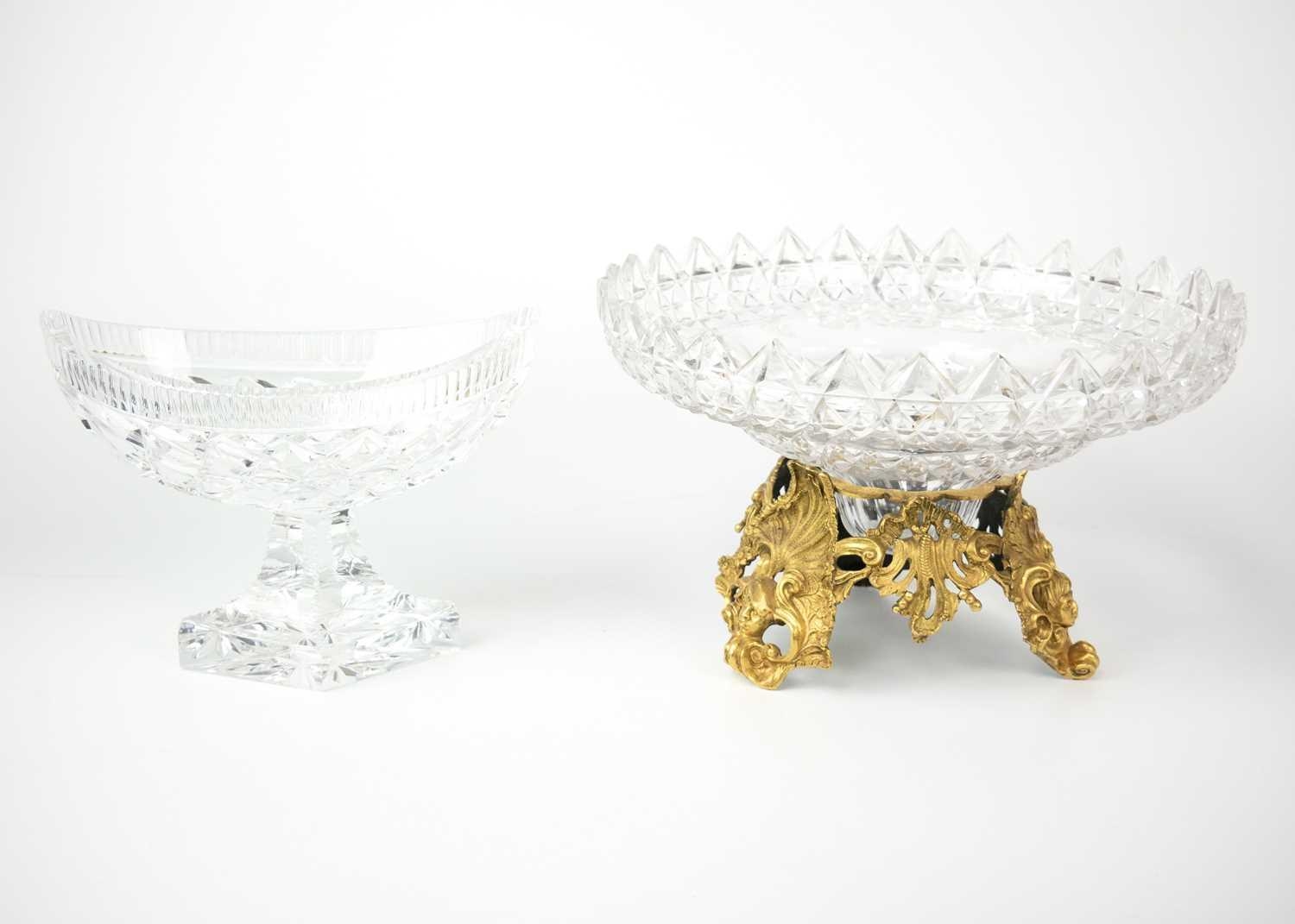 A fine cut glass centre piece on gilt metal stand. Diameter 28.5cm together with a cut glass boat shape centre piece. (2)