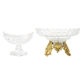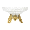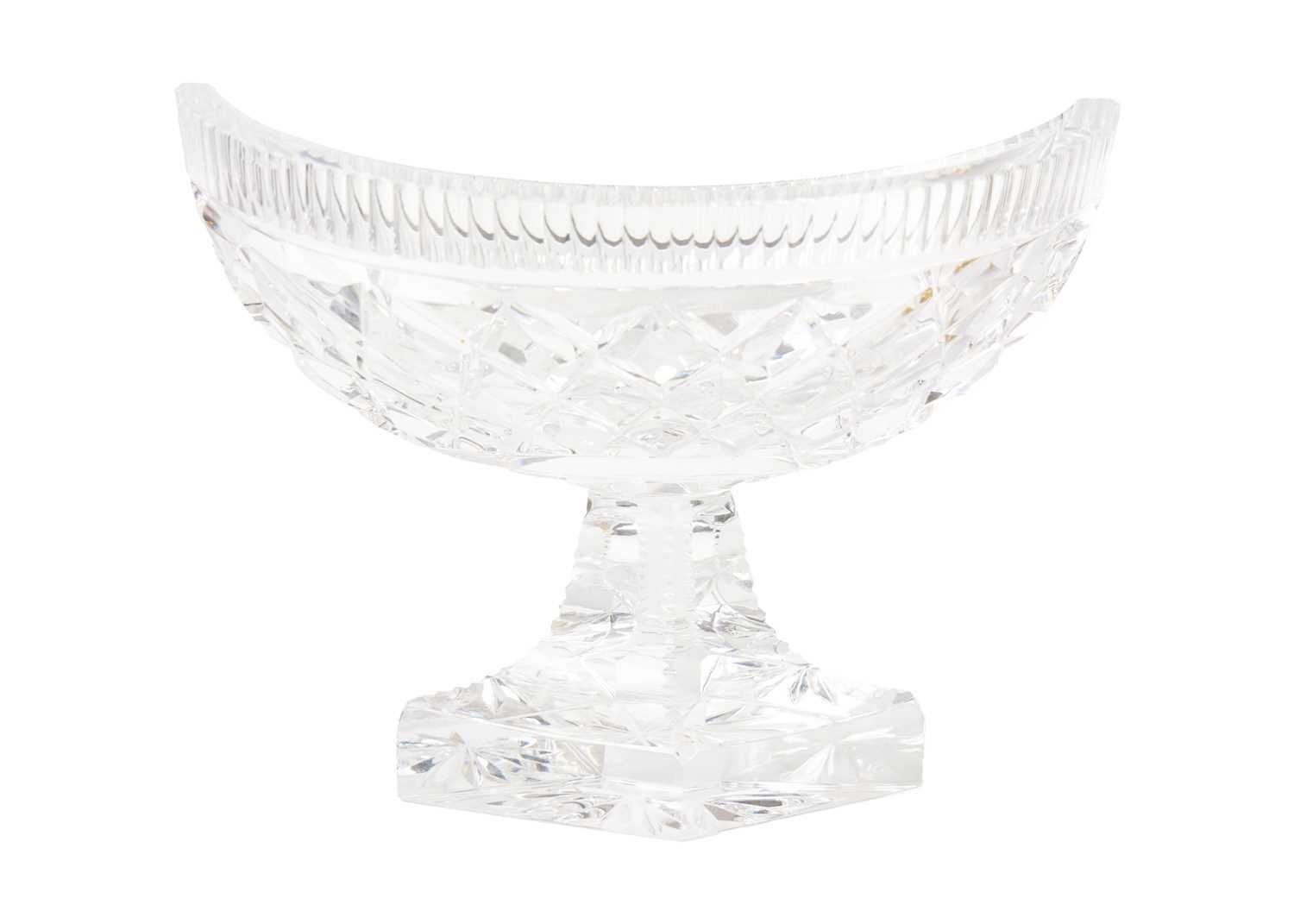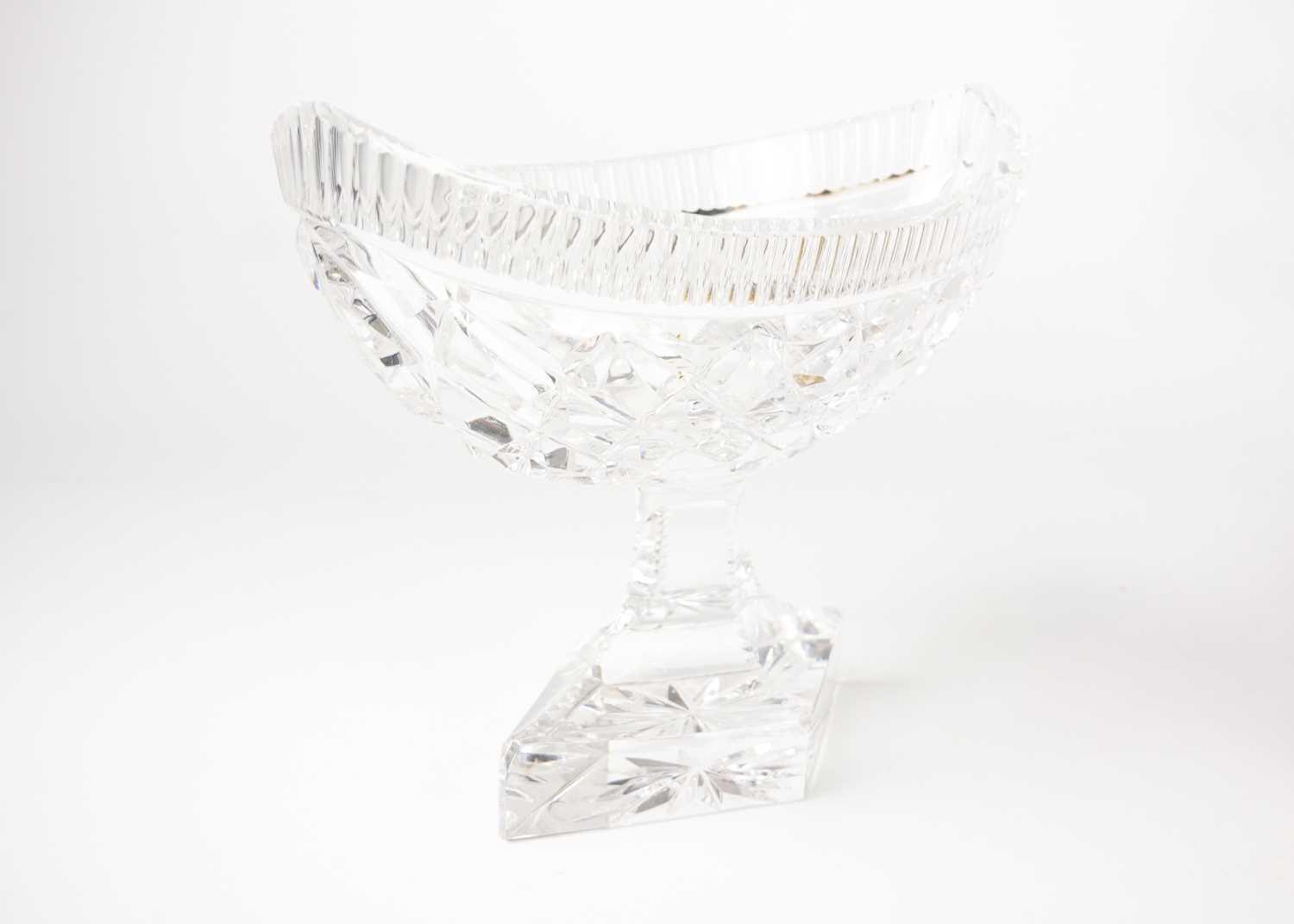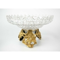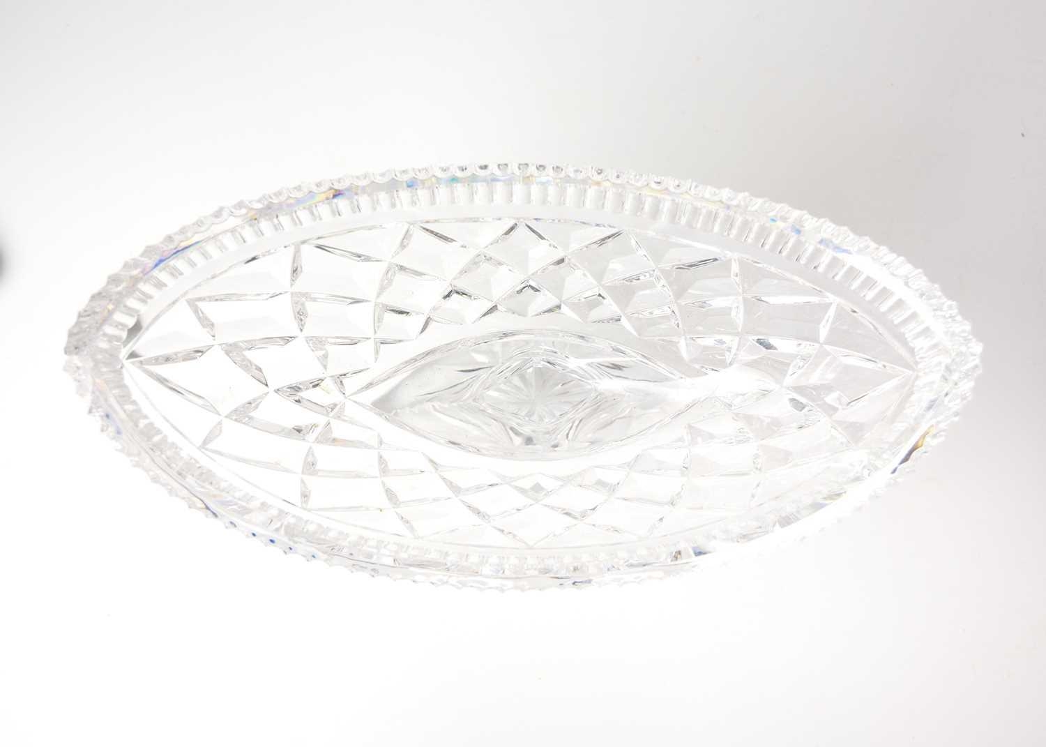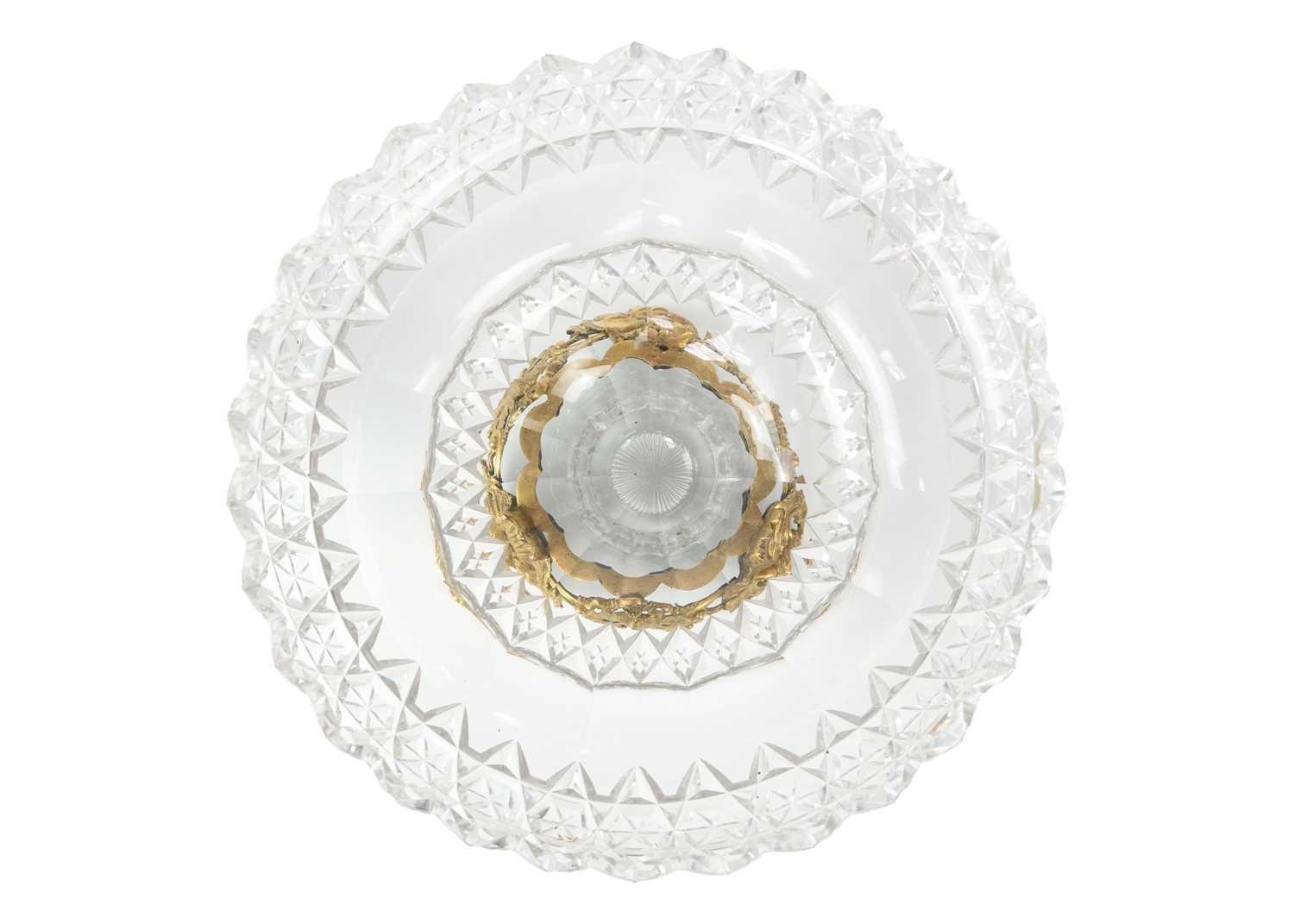 A fine cut glass centre piece on gilt metal stand. Diameter 28.5cm together with a cut glass boat shape centre piece. (2)