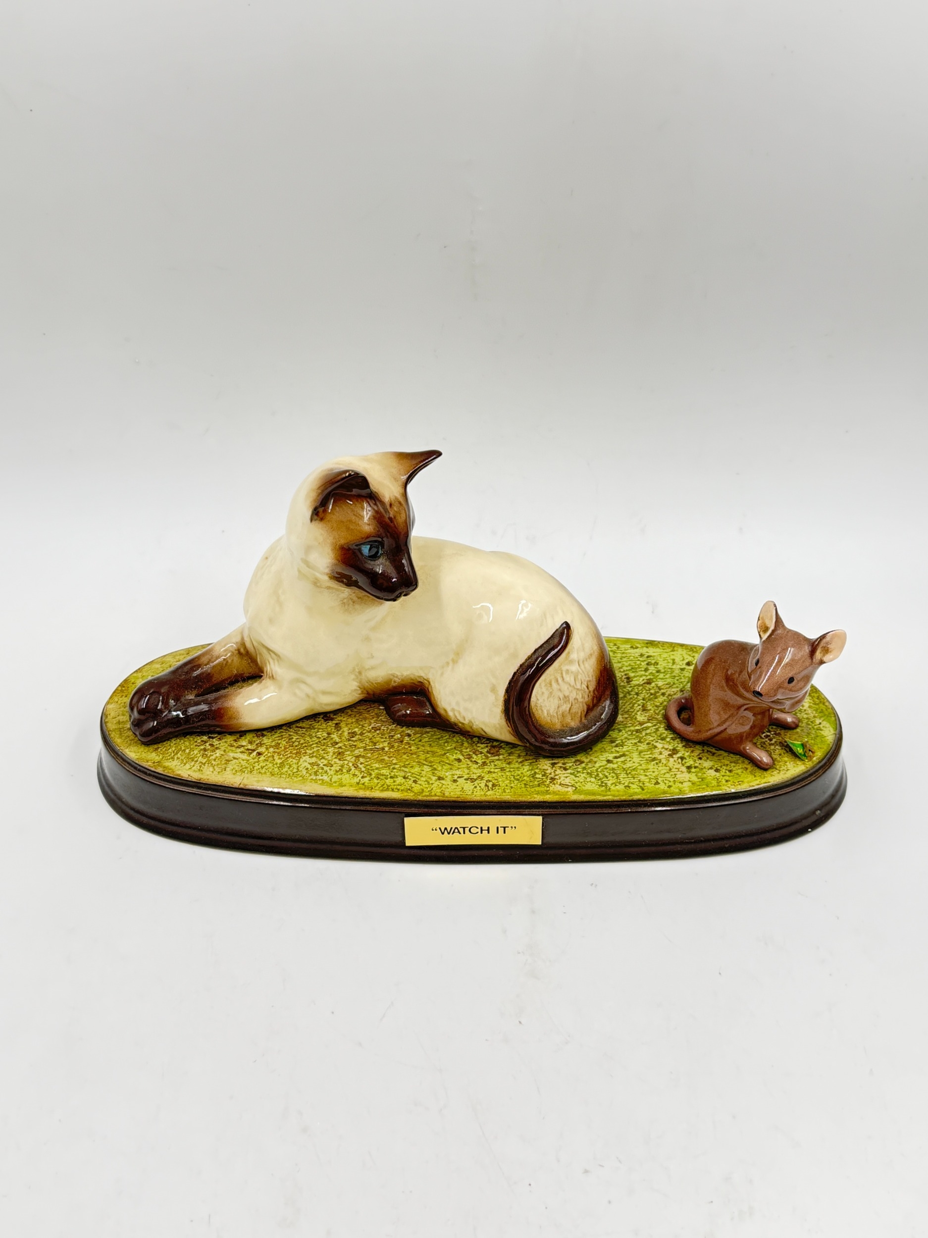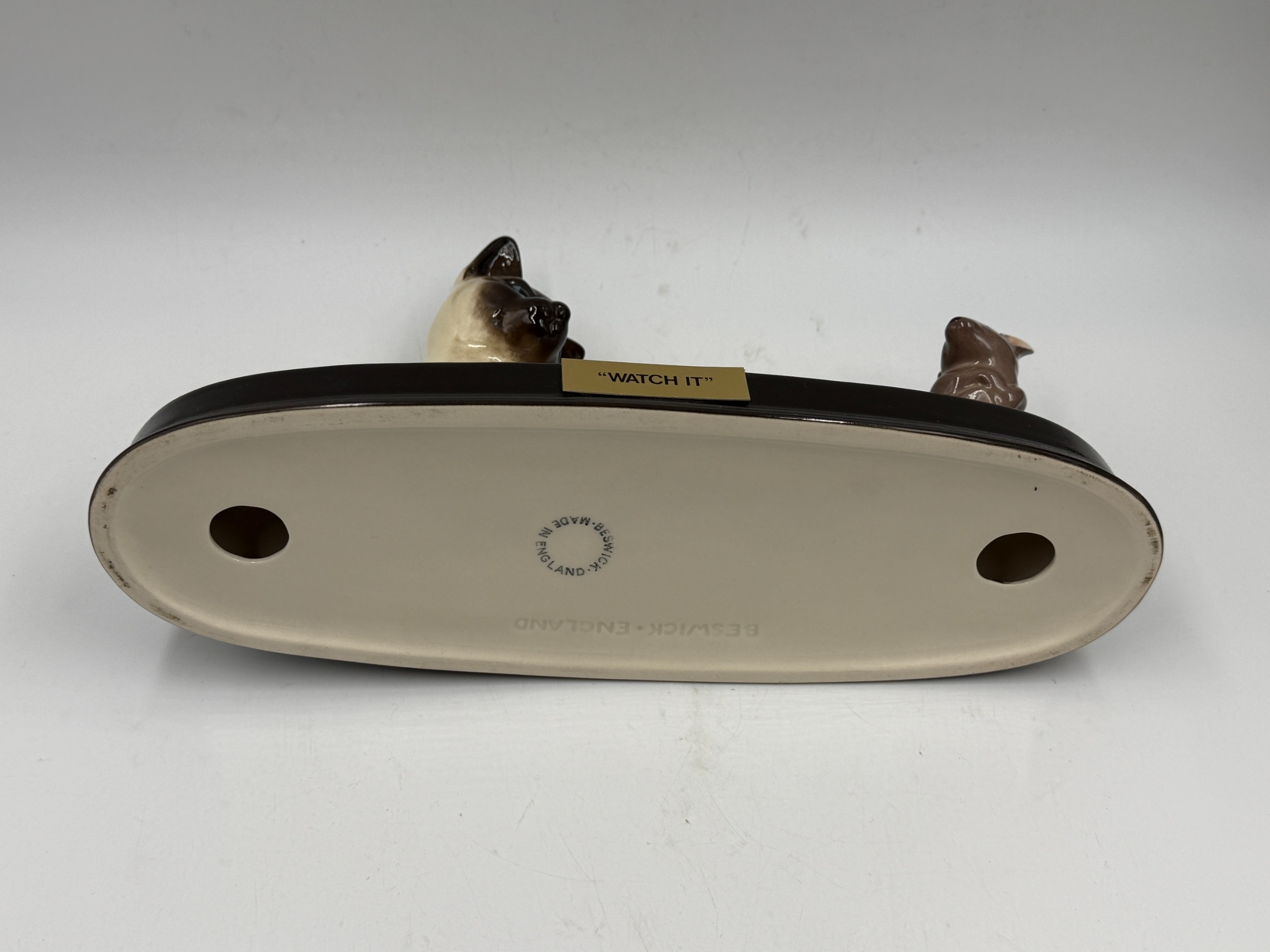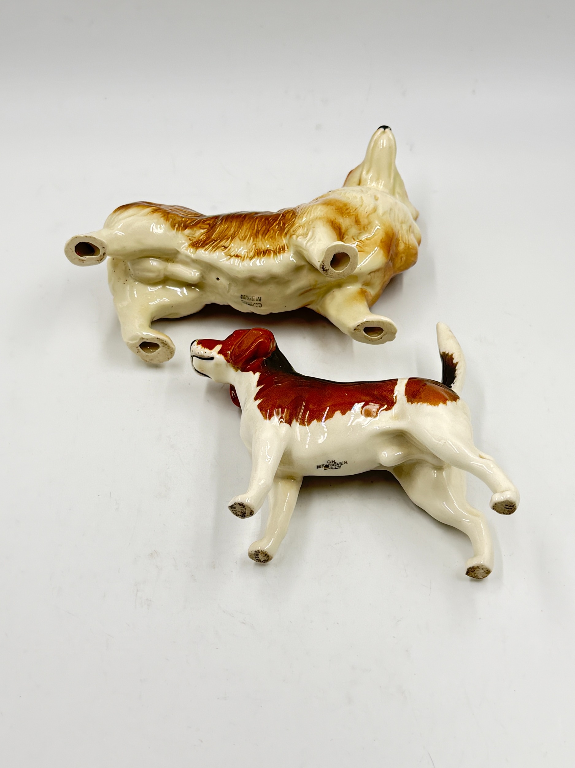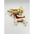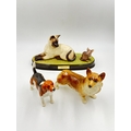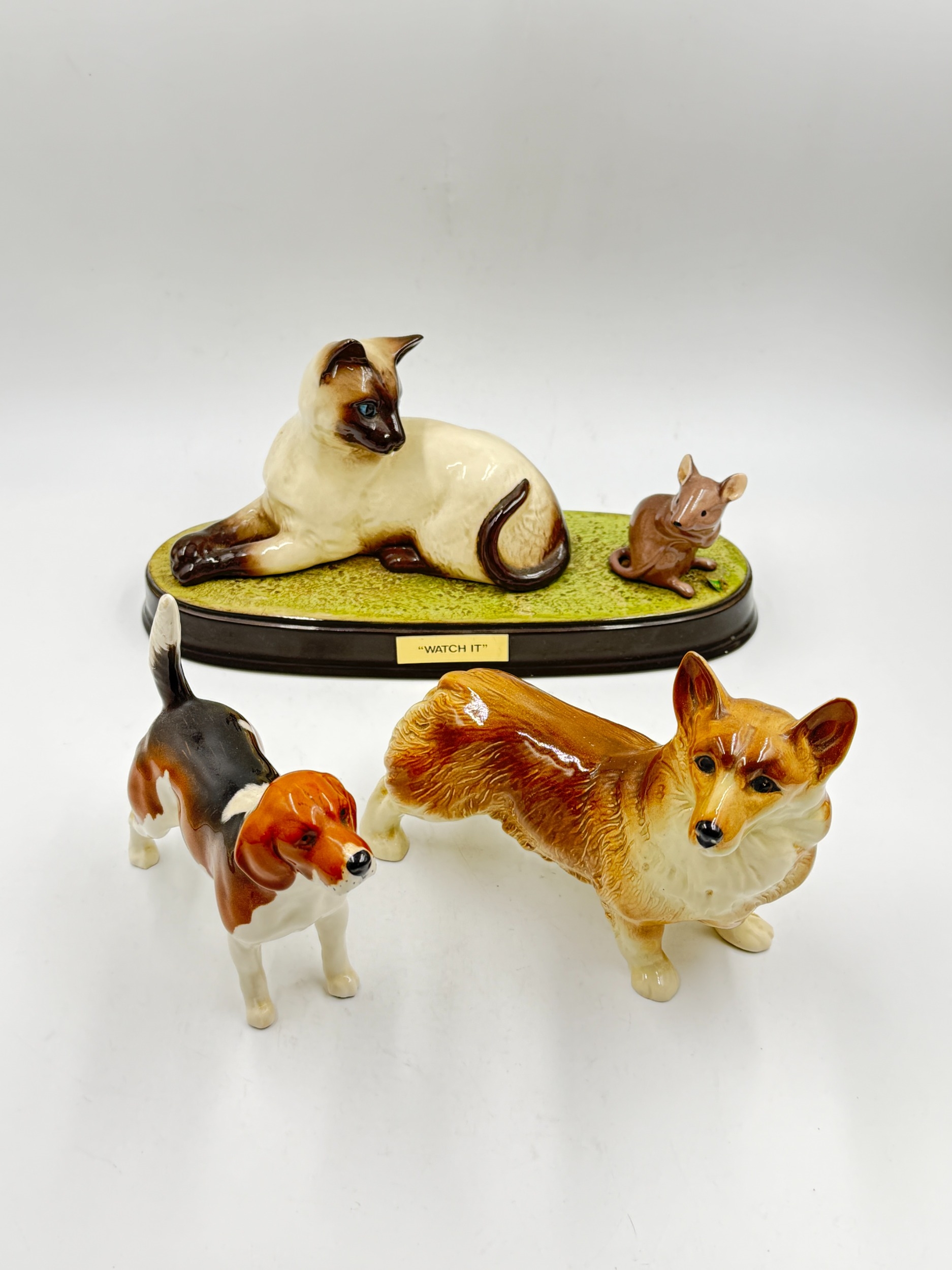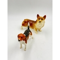 Three ceramic animal figurines, one Beswick Ch. Wendover Billy beagle dog, one Beswick 'Watch It' cat and mouse and one Corgi dog, made in England possibly by Coopercraft - largest approx. 15.5cm high x 28cm wide