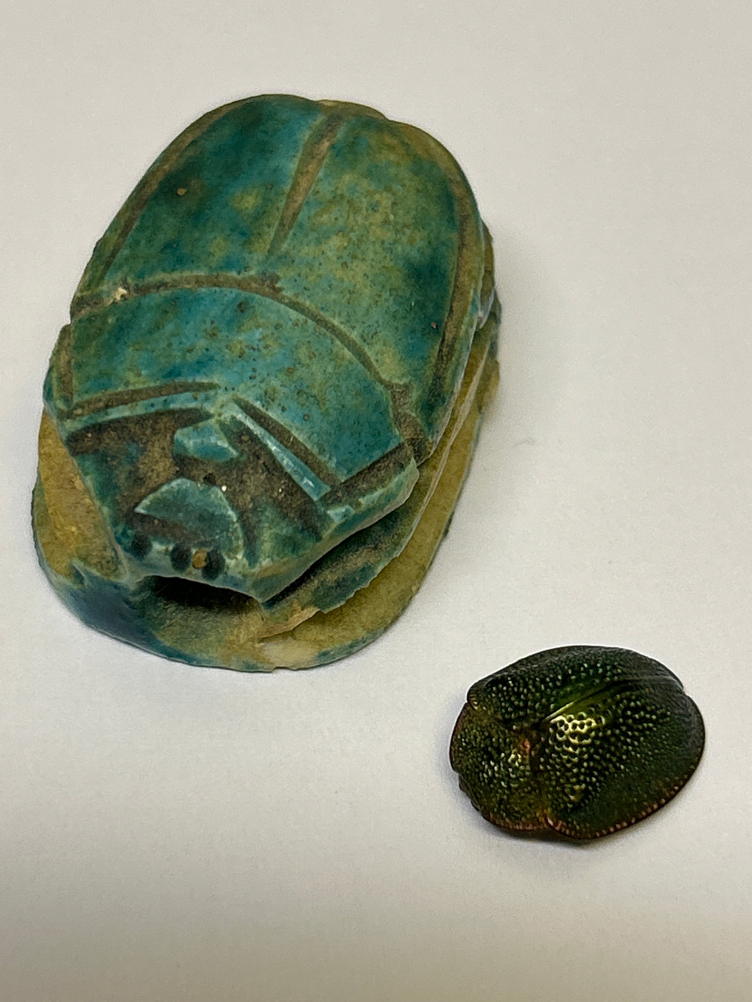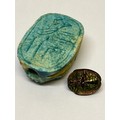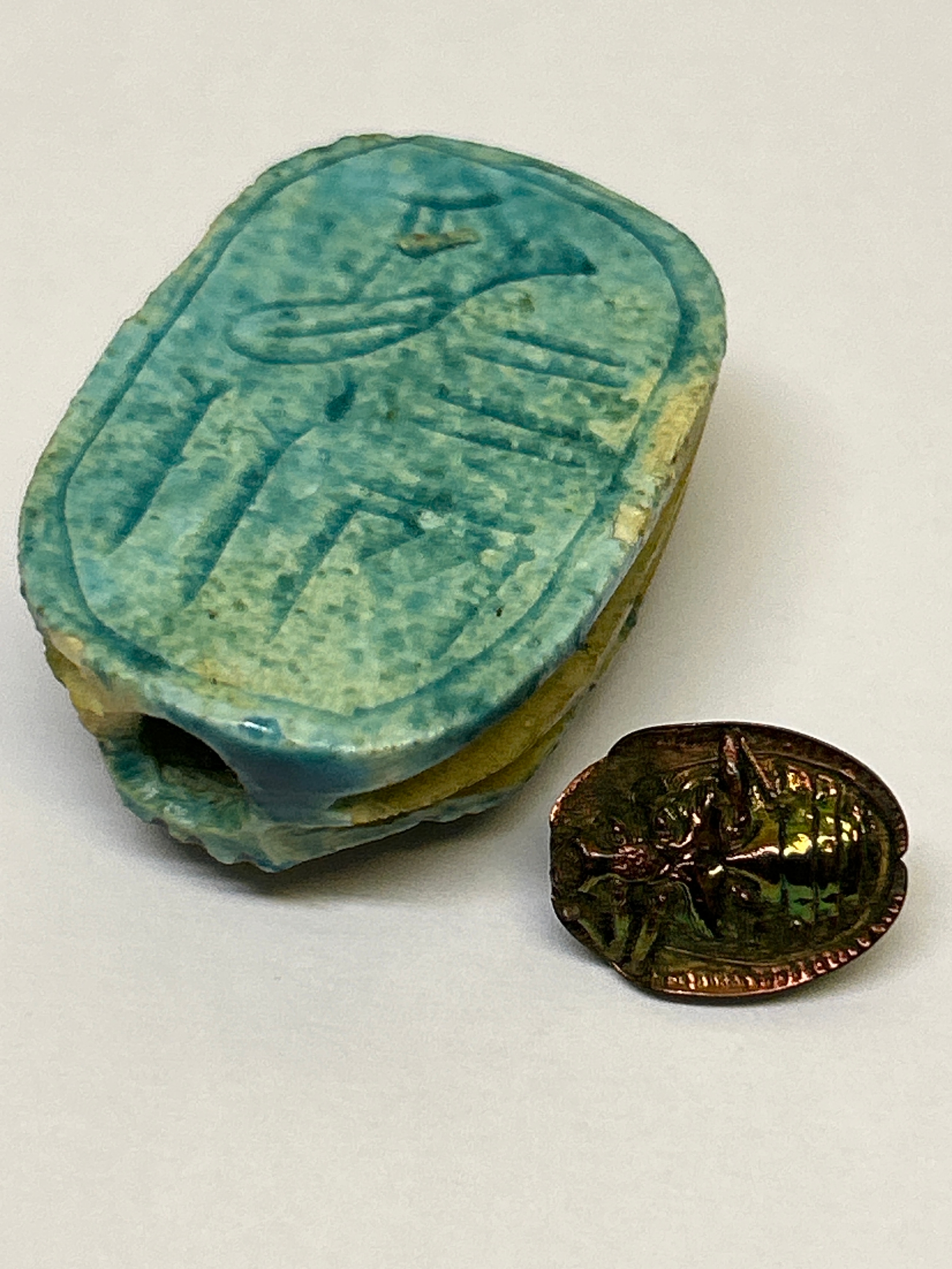 Two scarab beetle pieces, one in ceramic with Egyptian Hieroglyphs, the other in patinated gilt metal