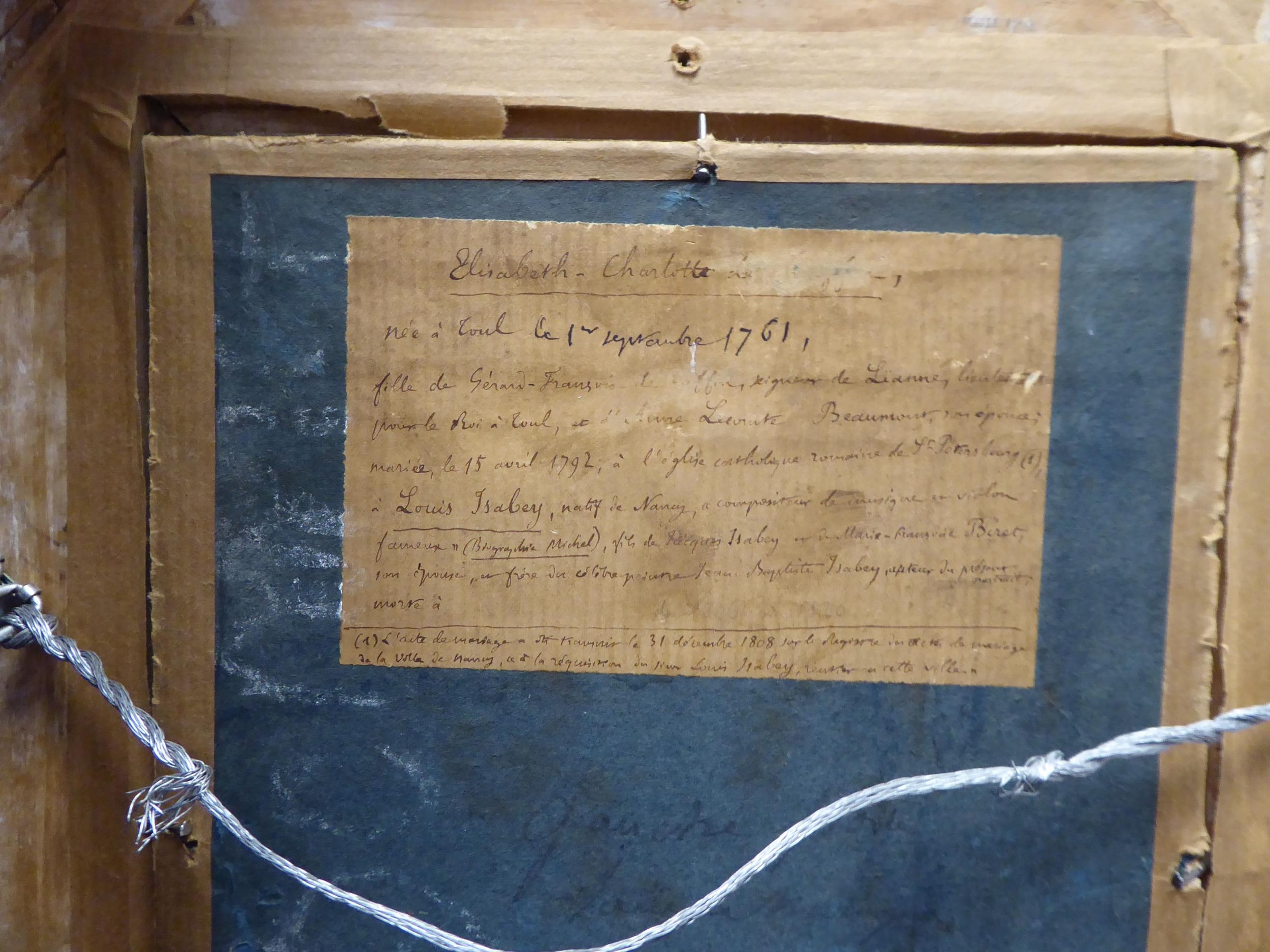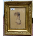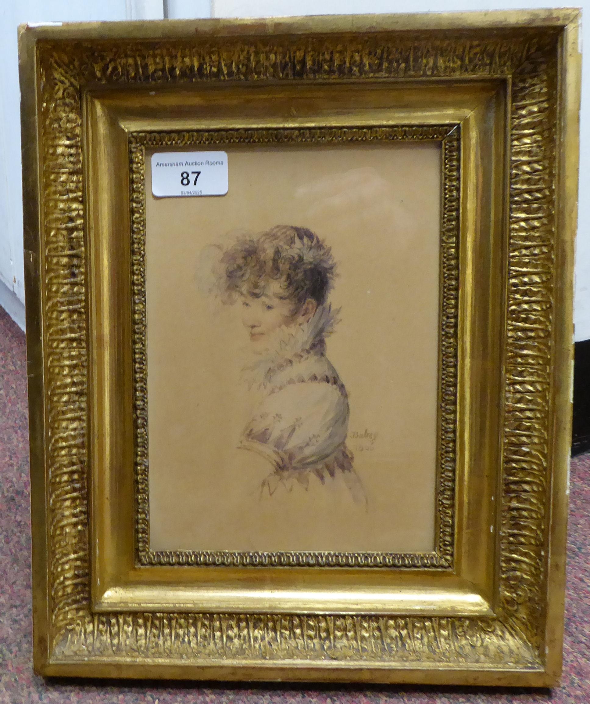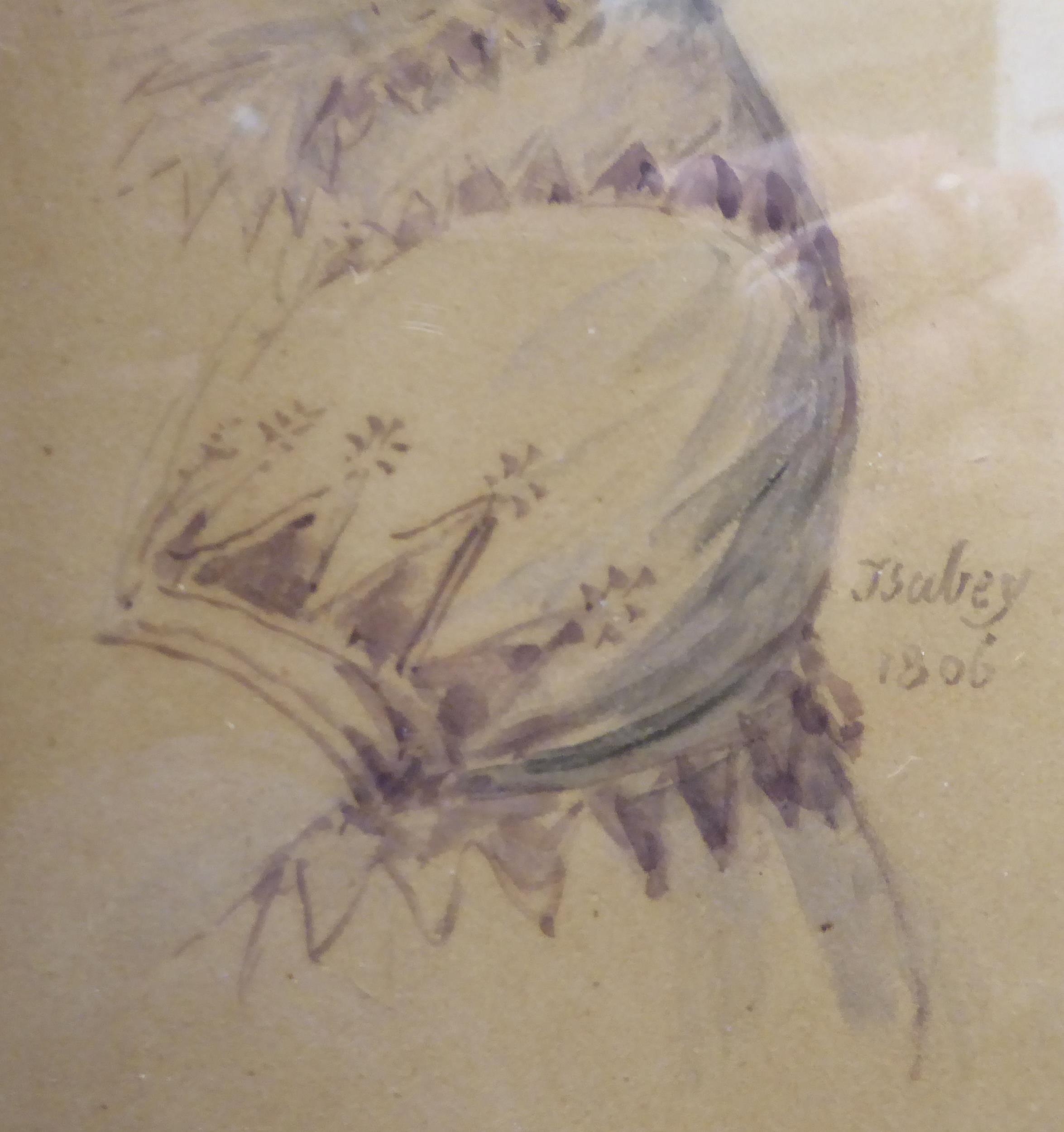 I Sabey - an early 19thC head and shoulders portrait, a girl wearing an upstand ruff watercolour bears a signature & dated 1806 with attendant handwritten verso (in French) 8" x 5.5" framed