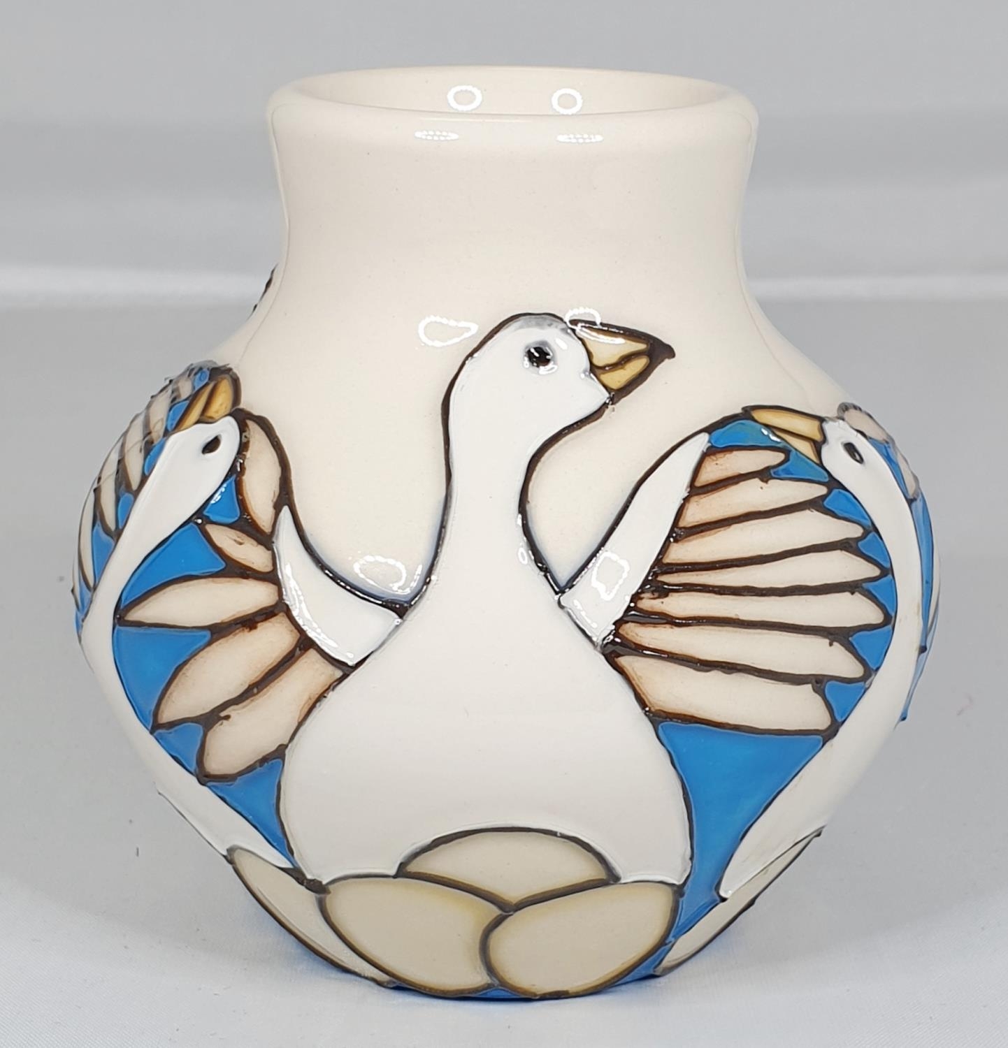 MOORCROFT H 7.50 x W 8.00 x D 8.00 cm VASE (Shape No 35/3) "SIX GEESE A LAYING" FROM THE TWELVE DAYS OF CHRISTMAS SERIES By Designer Kerry Goodwin R.R.P. £255.00