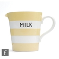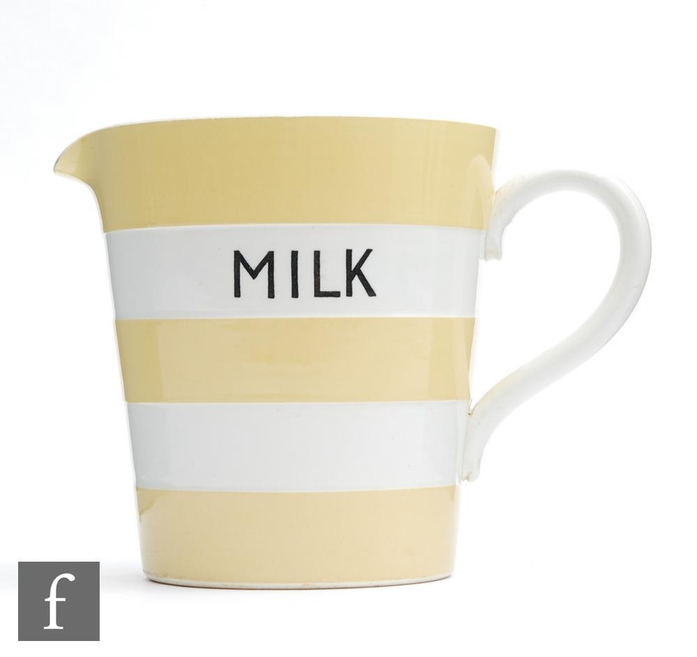 A T.G Green Cornish Kitchen Ware milk jug with yellow bands, printed to the interior Half Pint, Pint, Pint & Half and Quart with MILK to the front, green printed mark, height 15cm.