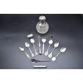 An S Mordan & Co white metal propelling pencil, 69mm; together with a 925 silver pill box; a silver and onyx thimble; two silver mounted items; and eight silver or 925 teaspoons.