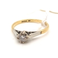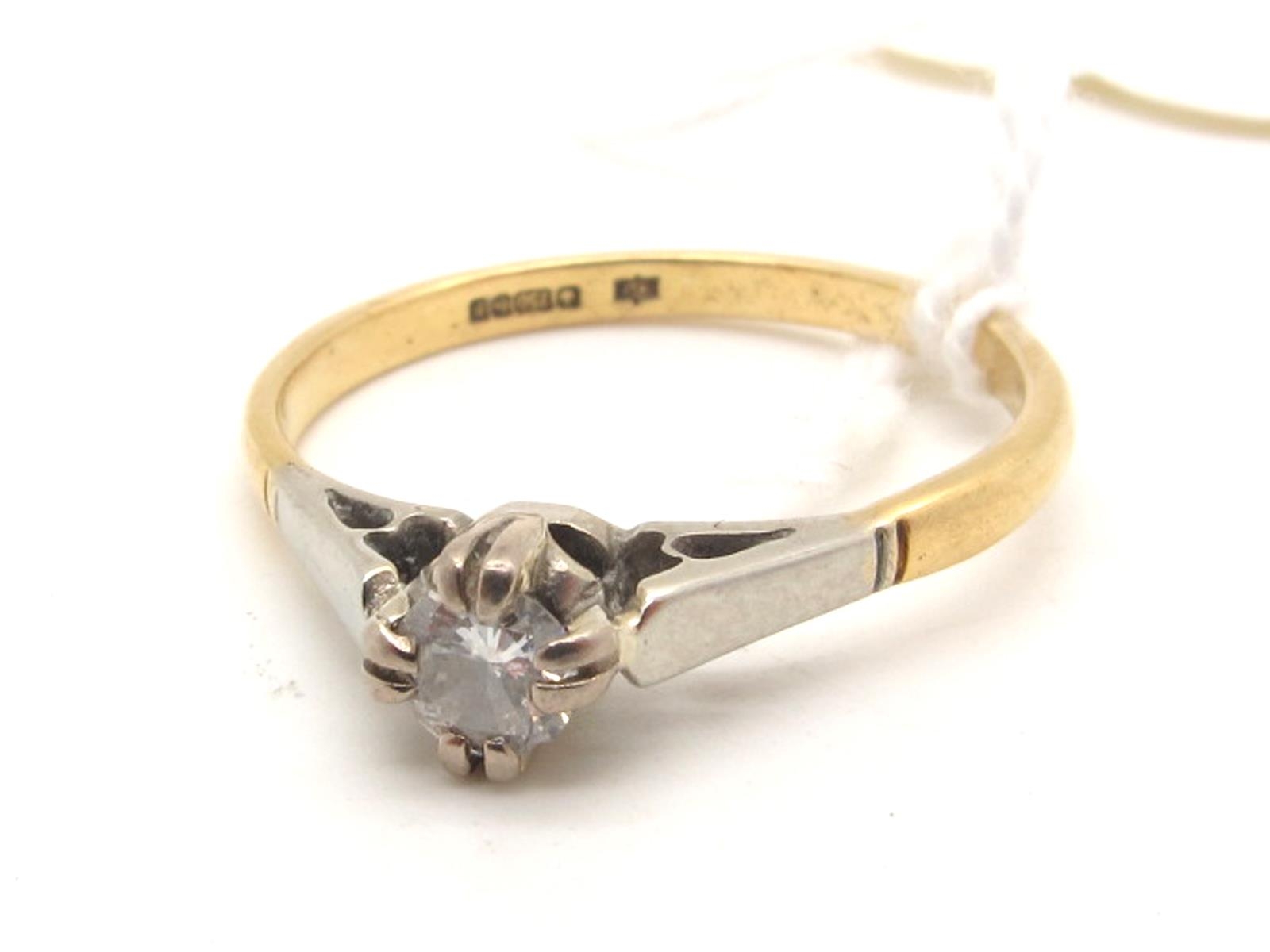 An 18ct Gold Single Stone Diamond Ring, the brilliant cut (chipped) stone claw set, between white shoulders and yellow band (finger size M) (1.8grams).