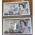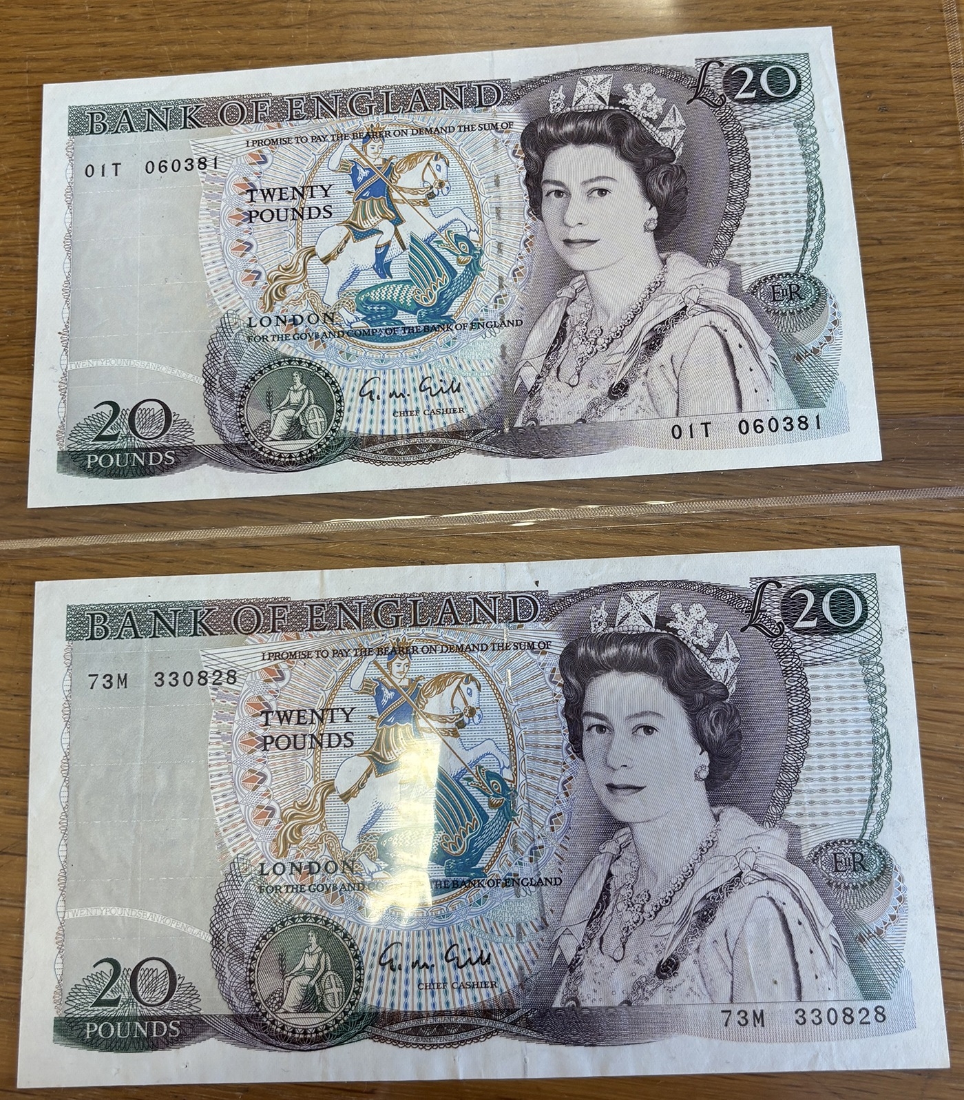 G.M. Gill. Pair of £20 in plastic wallets, uncirculated, including 01T and 73M. Qty 2. (Duggleby B355). (N)