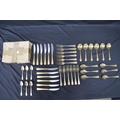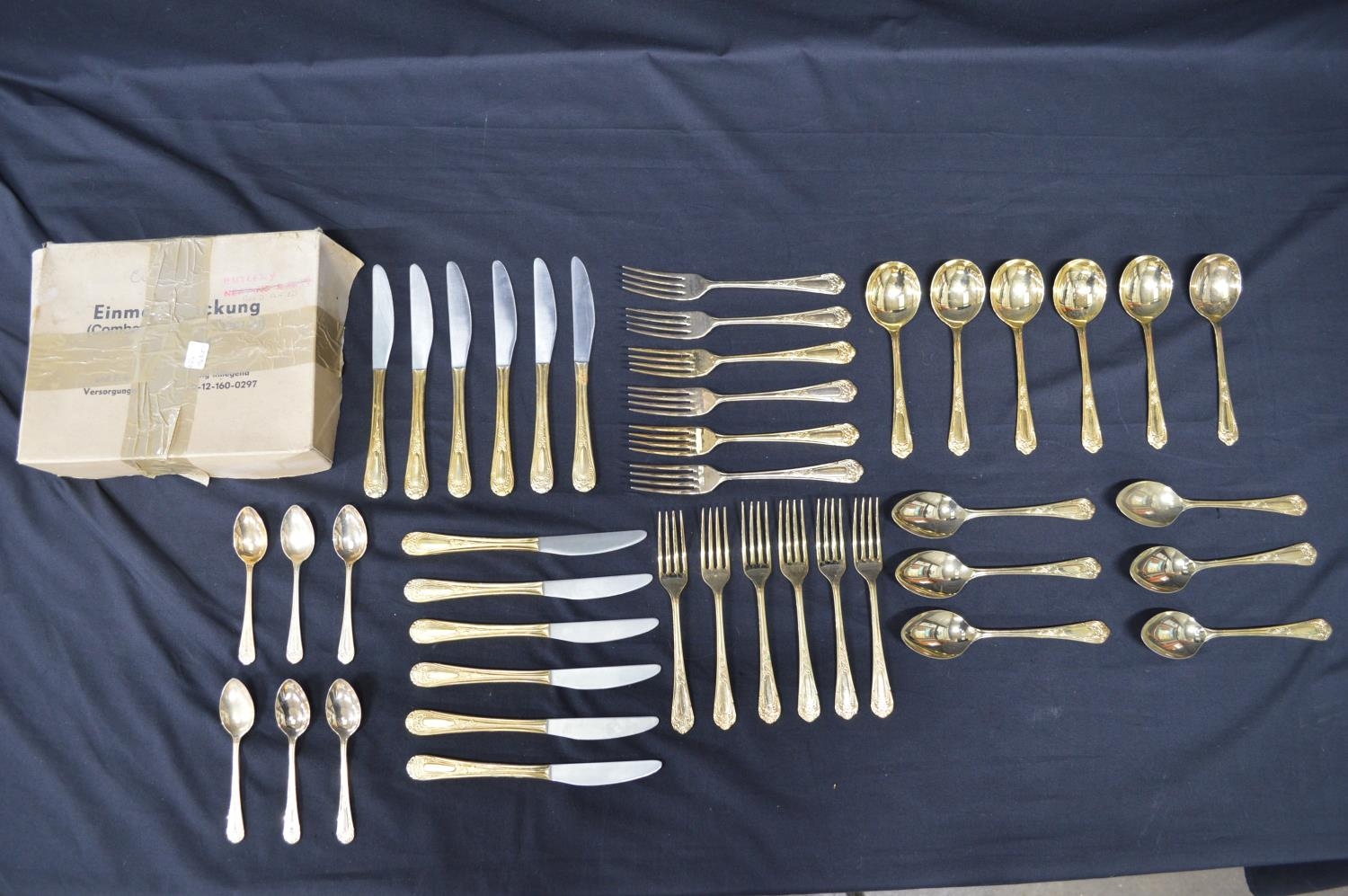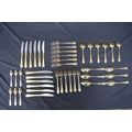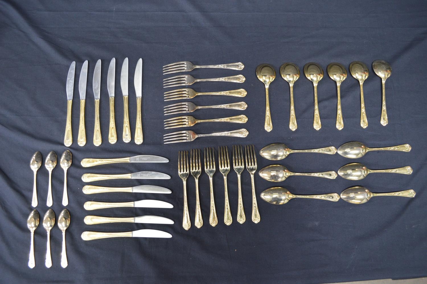 Hiram Wild Sheffield gold plated cutlery set to comprise: six dinner forks, six dinner knives, six dessert forks, six dessert knives, six dessert spoons, six tea spoons and eight soup spoons