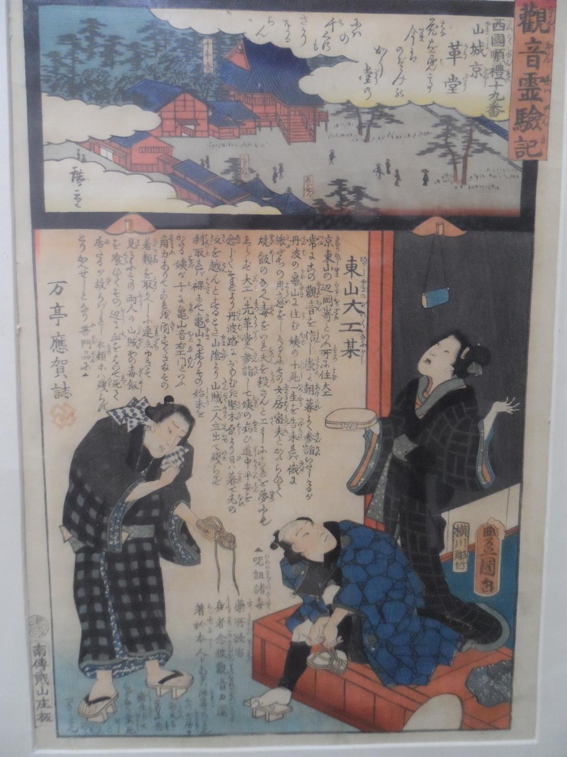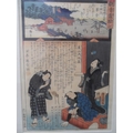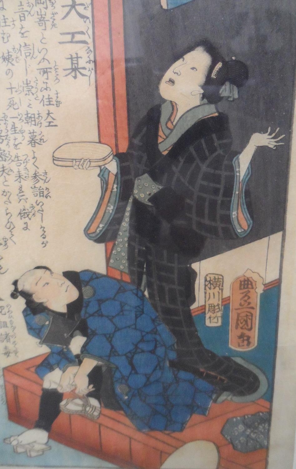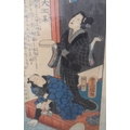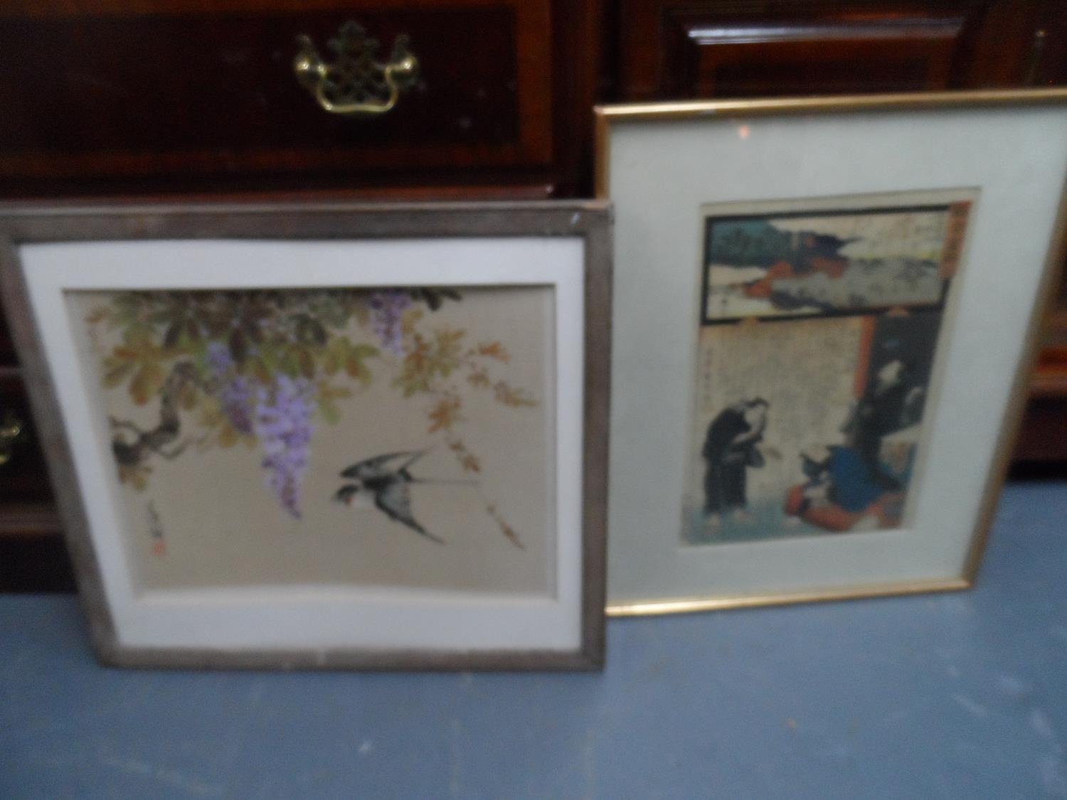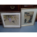 Signed antique Japanese woodblack print together with a signed Japanese watercolour (2)