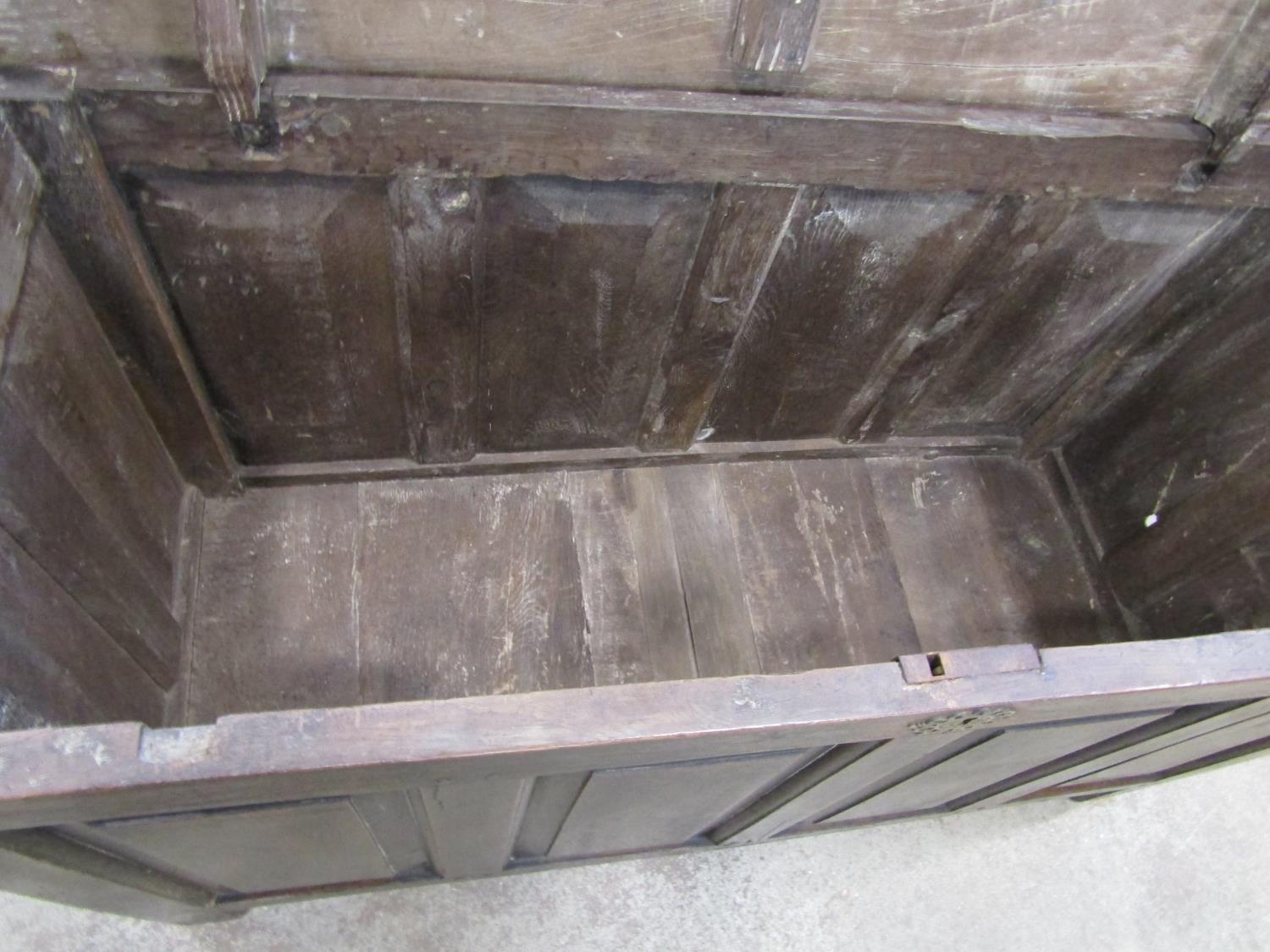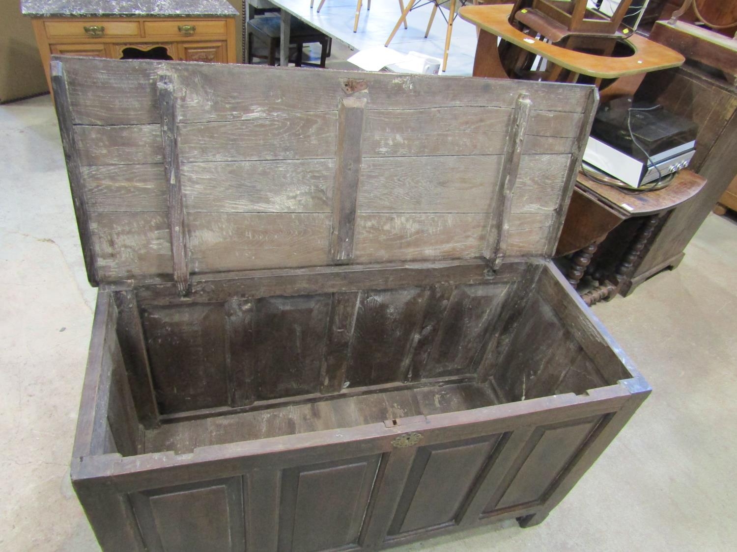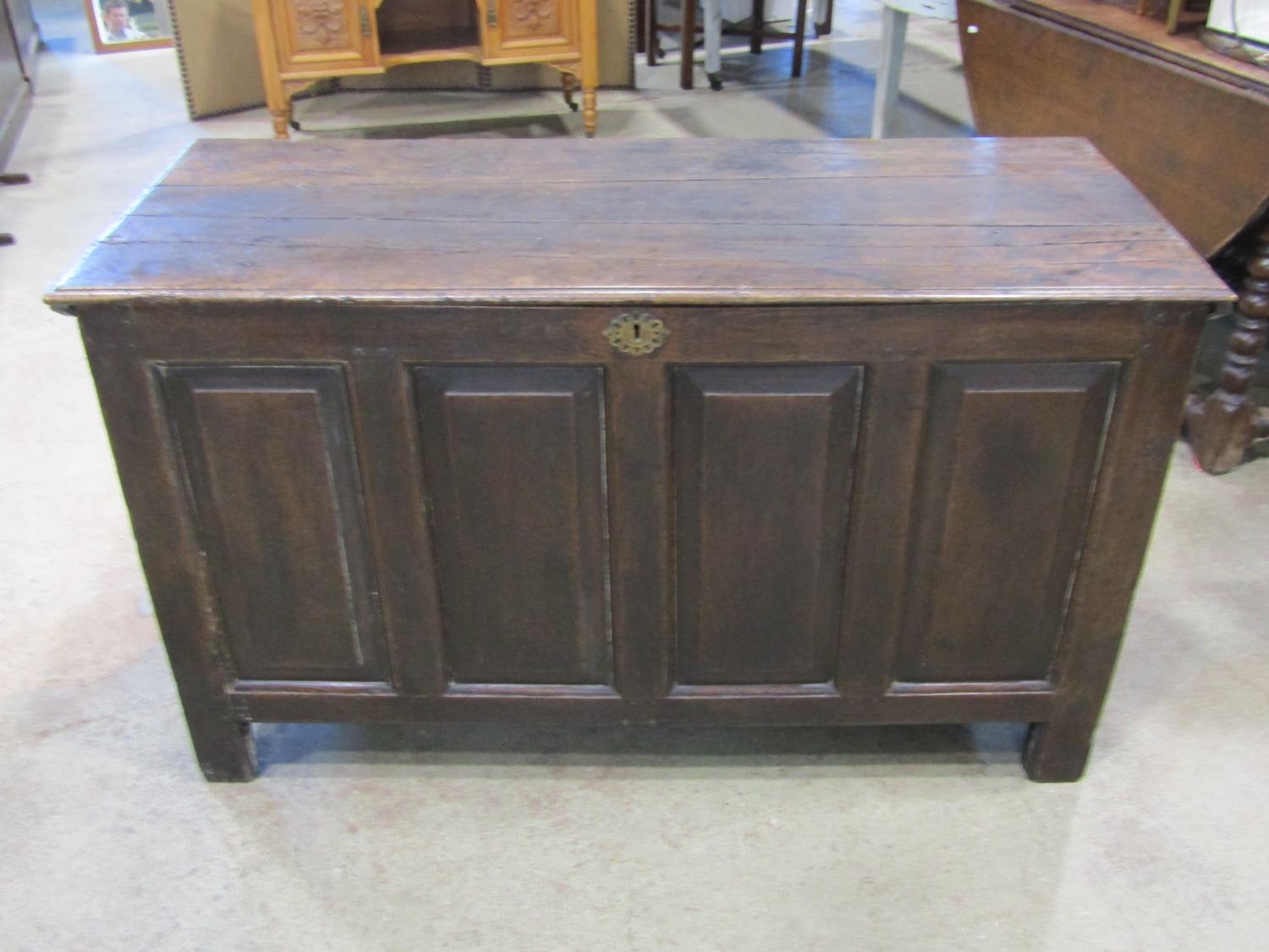 18th century oak panelled coffer, the front with four fielded panels, 130cm wide