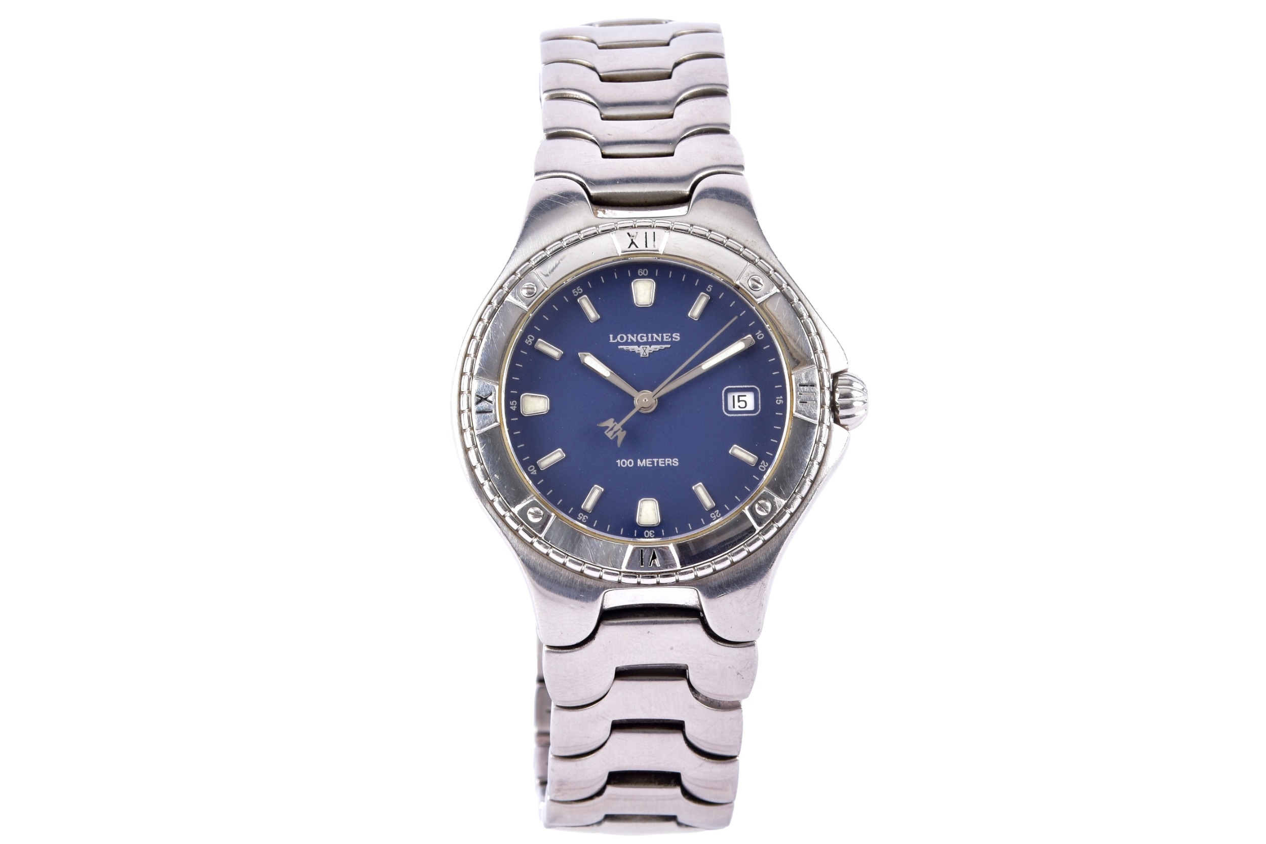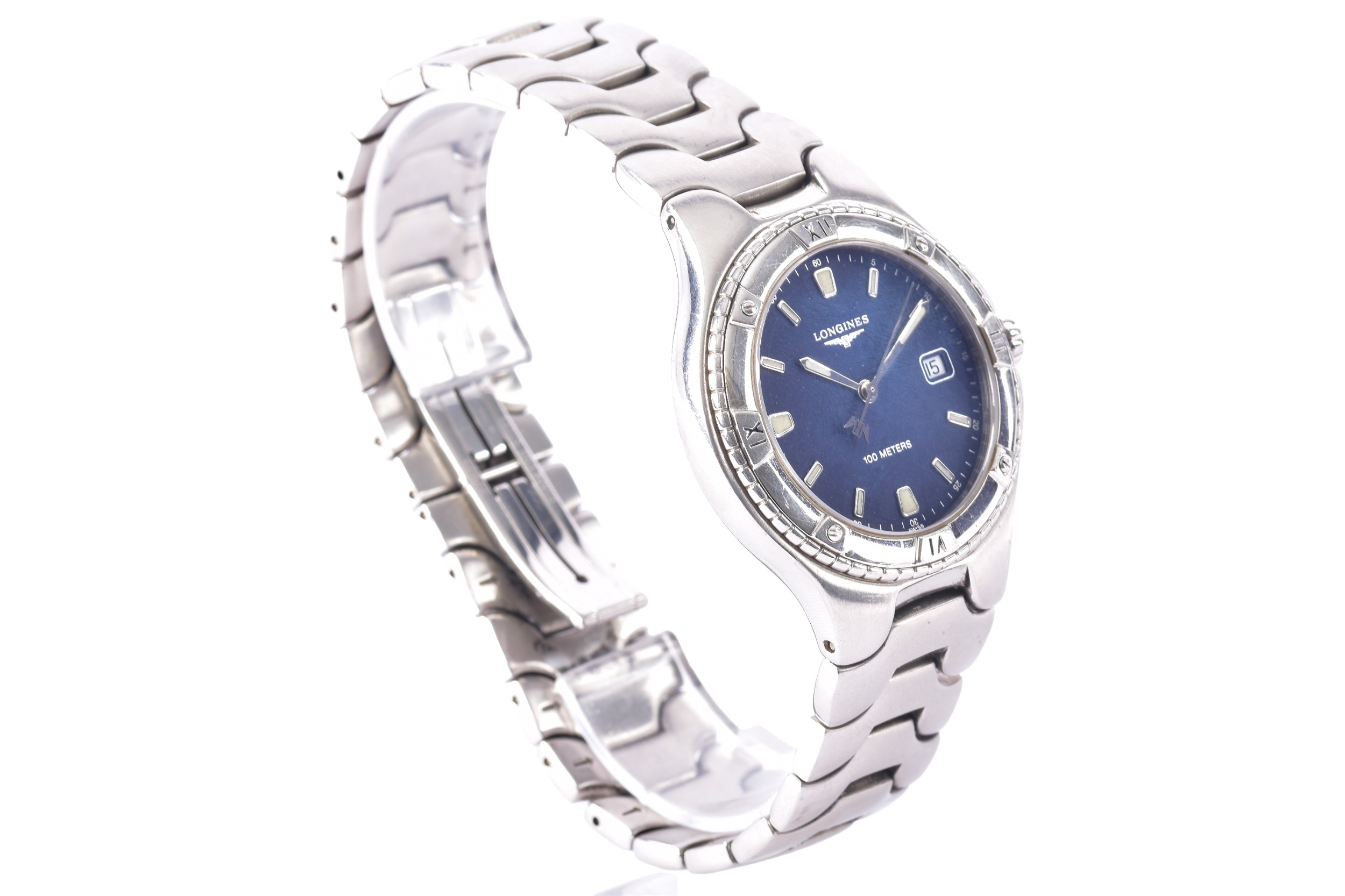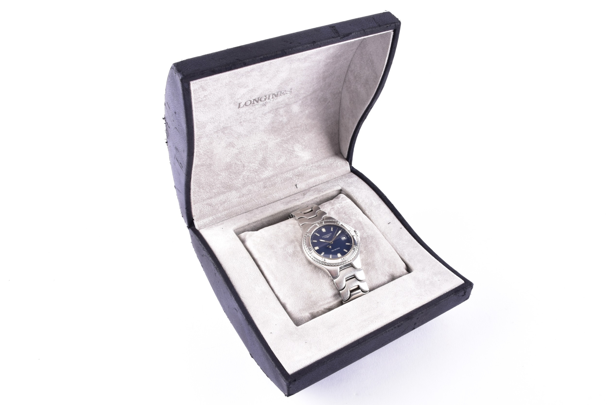 A Longines Conquest S100, quartz stainless steel wristwatch, the blue dial having baton markers and a date aperture at 3, on an original Longines bracelet, the caseback numbered L3 612 4 28549005, case size 37.5 mm, with original box.