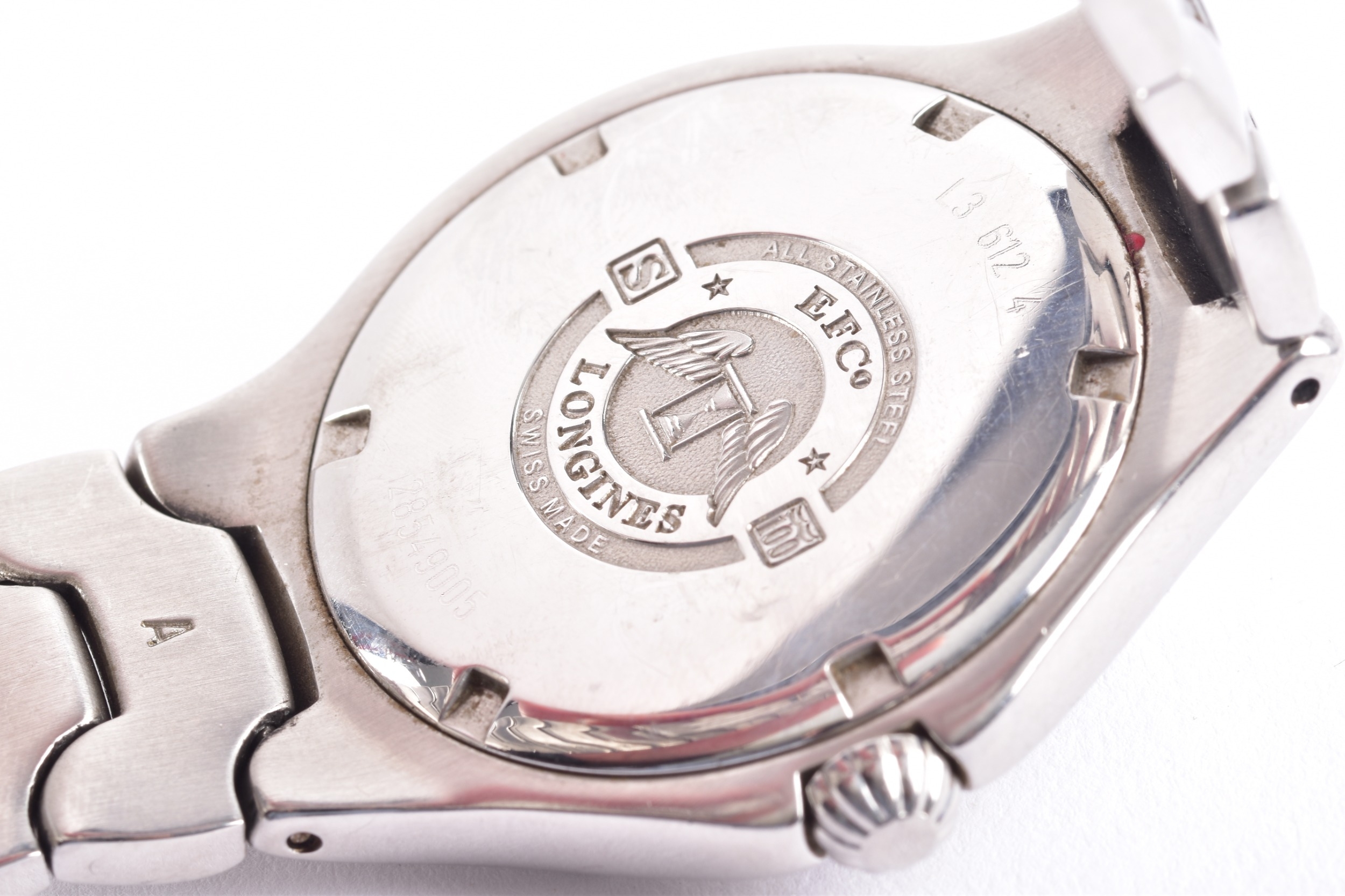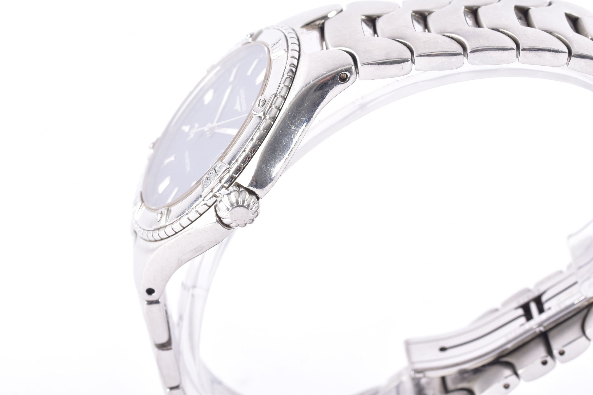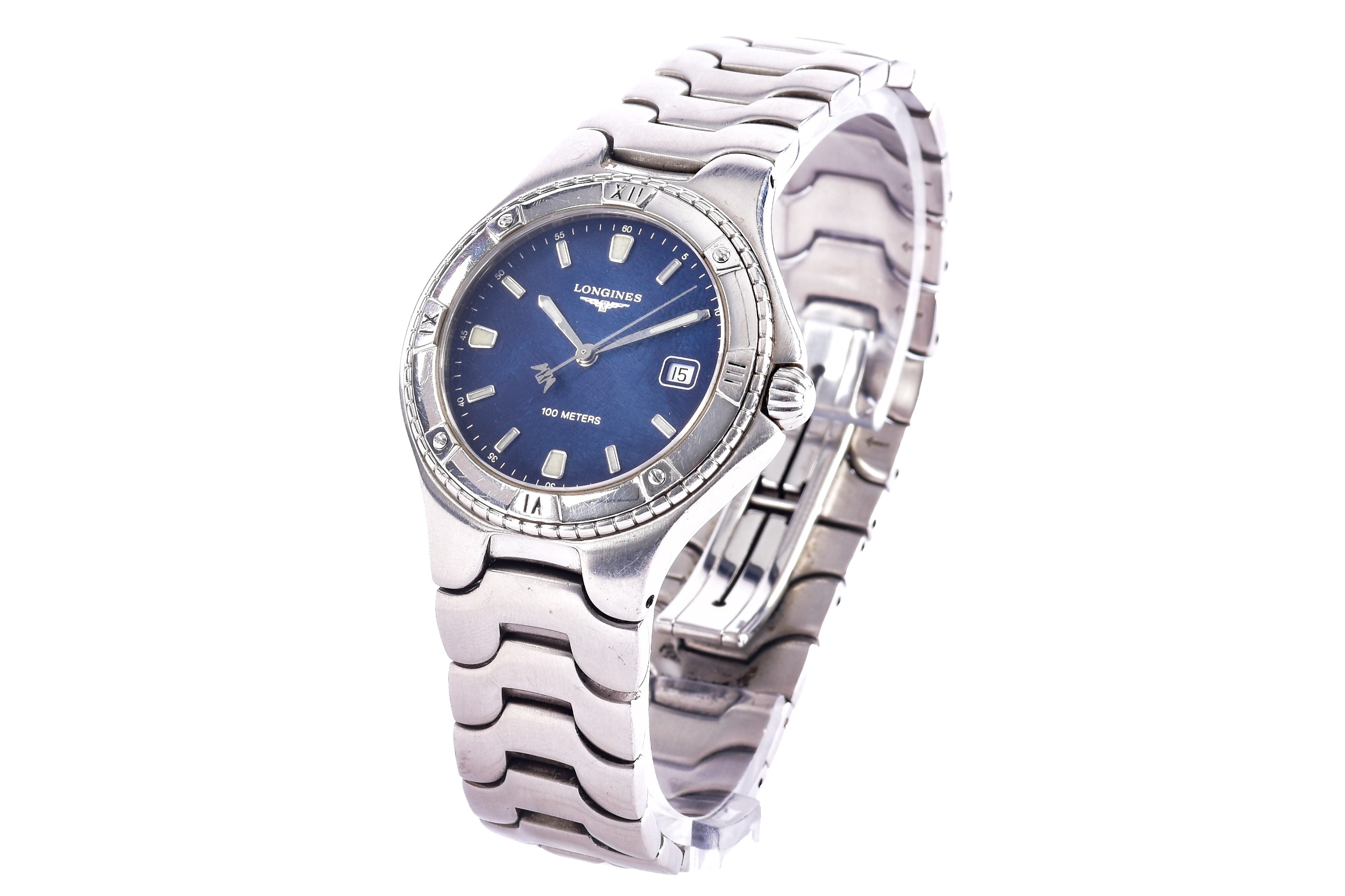 A Longines Conquest S100, quartz stainless steel wristwatch, the blue dial having baton markers and a date aperture at 3, on an original Longines bracelet, the caseback numbered L3 612 4 28549005, case size 37.5 mm, with original box.