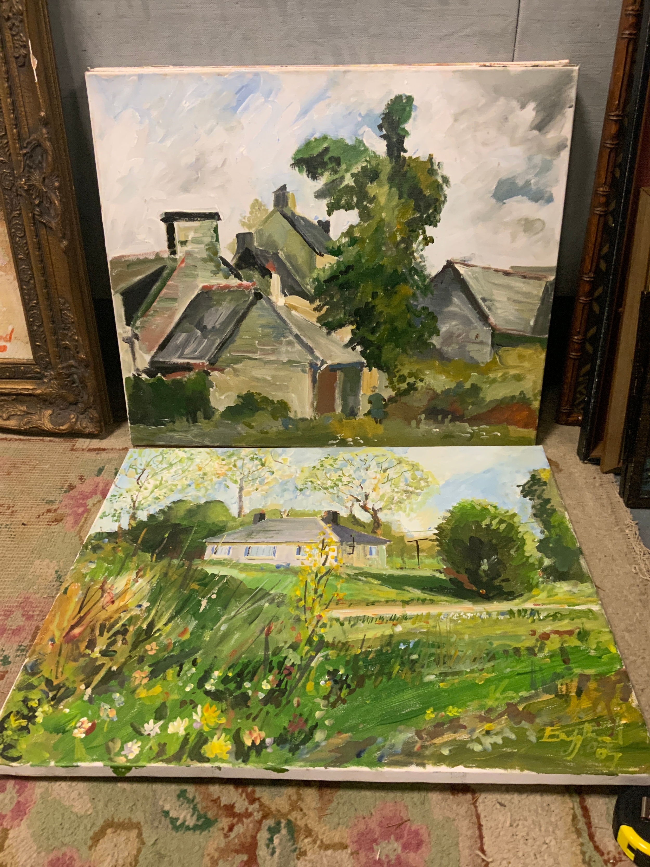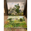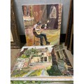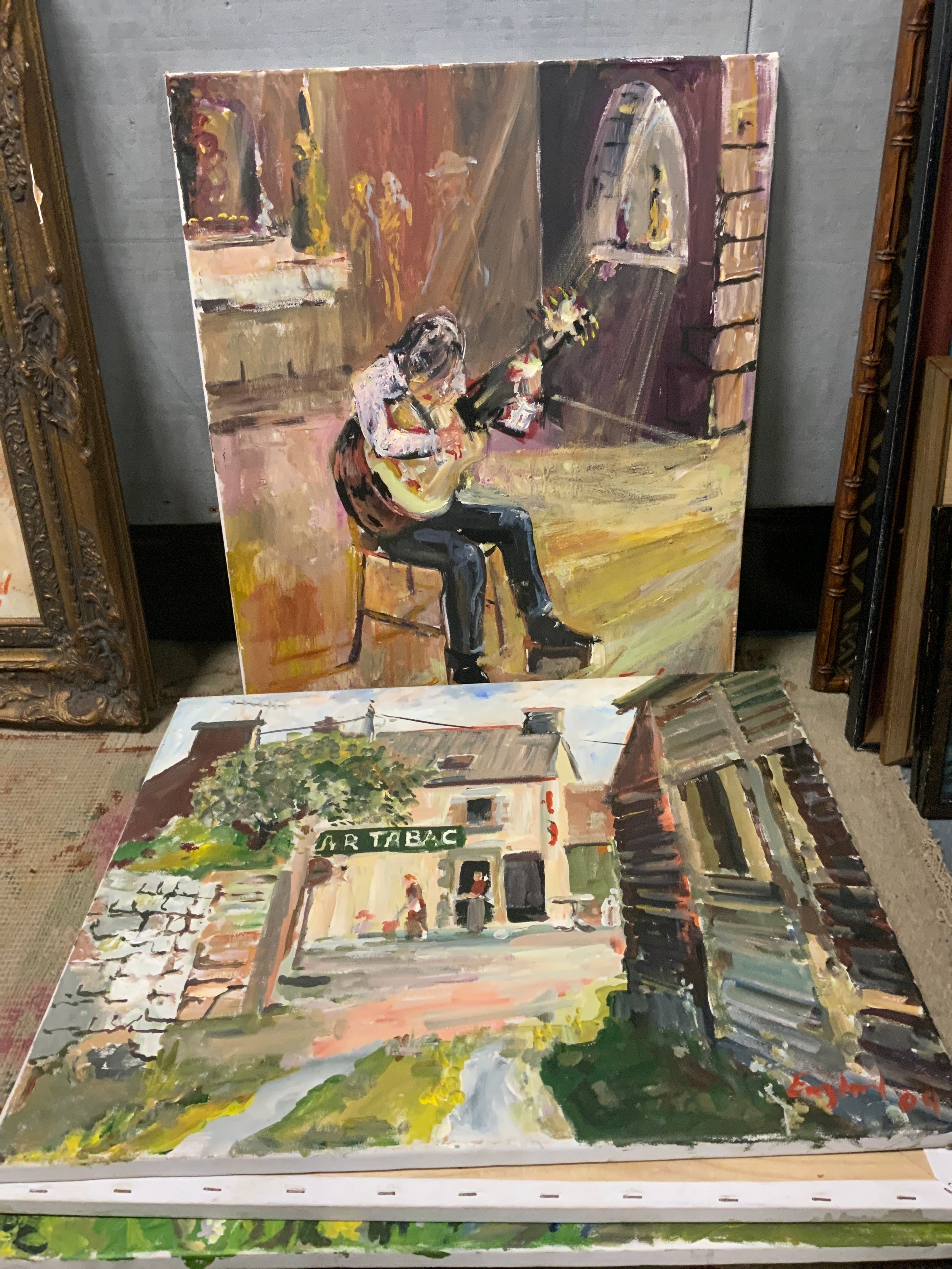 Frederick J England, four unframed oil on canvases, depicting continental French scenes and a musician 50 x 60 cm. (4)