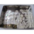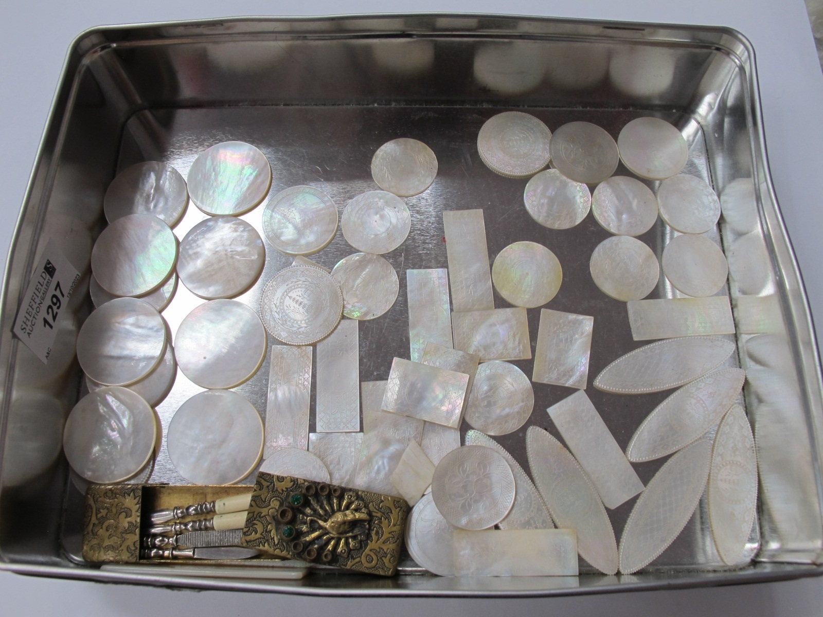 Oriental Mother of Pearl Gaming Counters Carved with Figures, pagodas and foliage, oval circular and rectangular 40 plus 10 blanks plus ETUI
