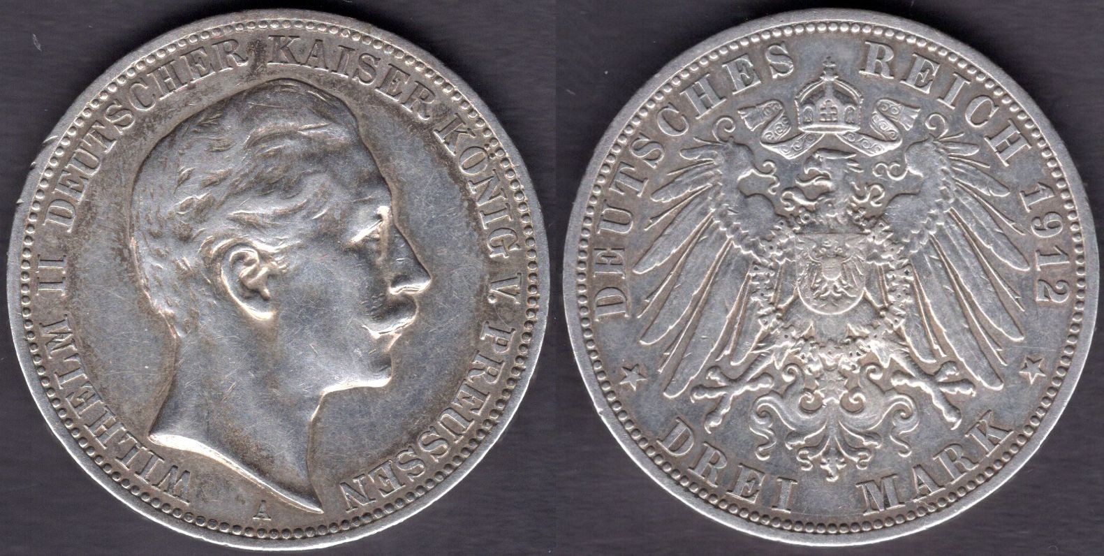 Germany, Prussia, Wilhelm II, 3 marks, 1912A (KM 527), GVF