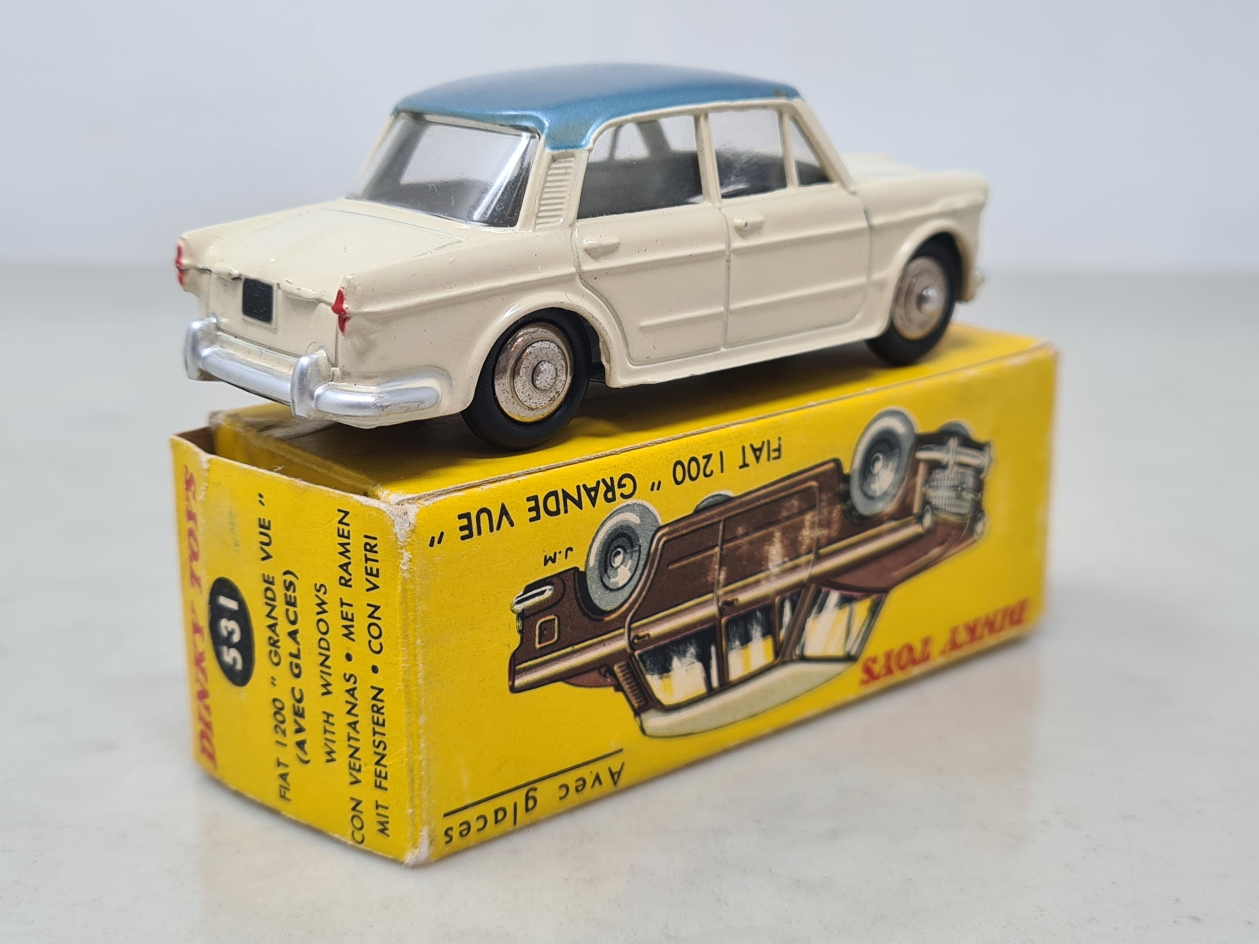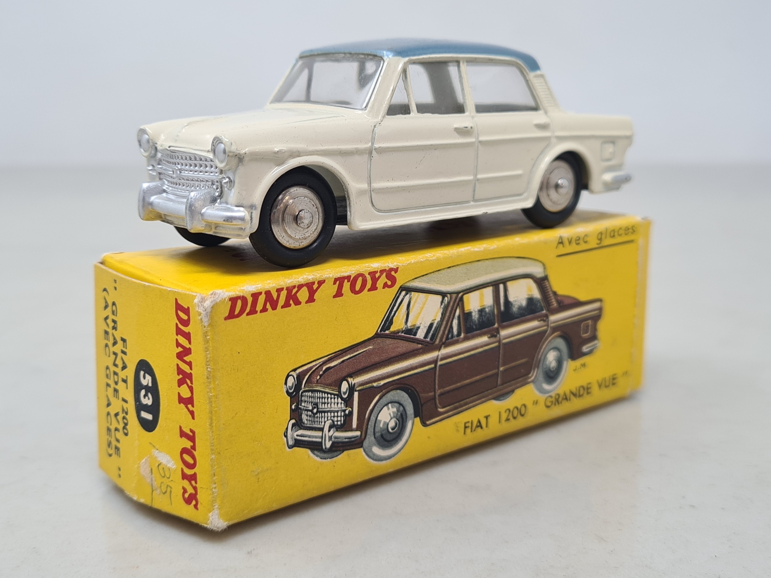 A boxed French Dinky Toys No.531 blue and cream Fiat 1200 Grand Vue, Nr M, box Ex