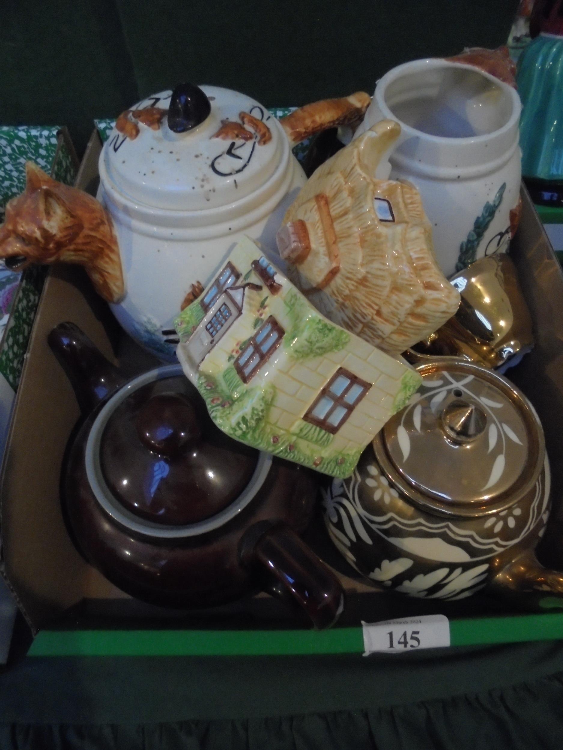 Selection of tea pots, 1 lustre, 1 showing fox with matching milk jug