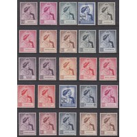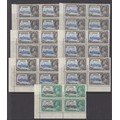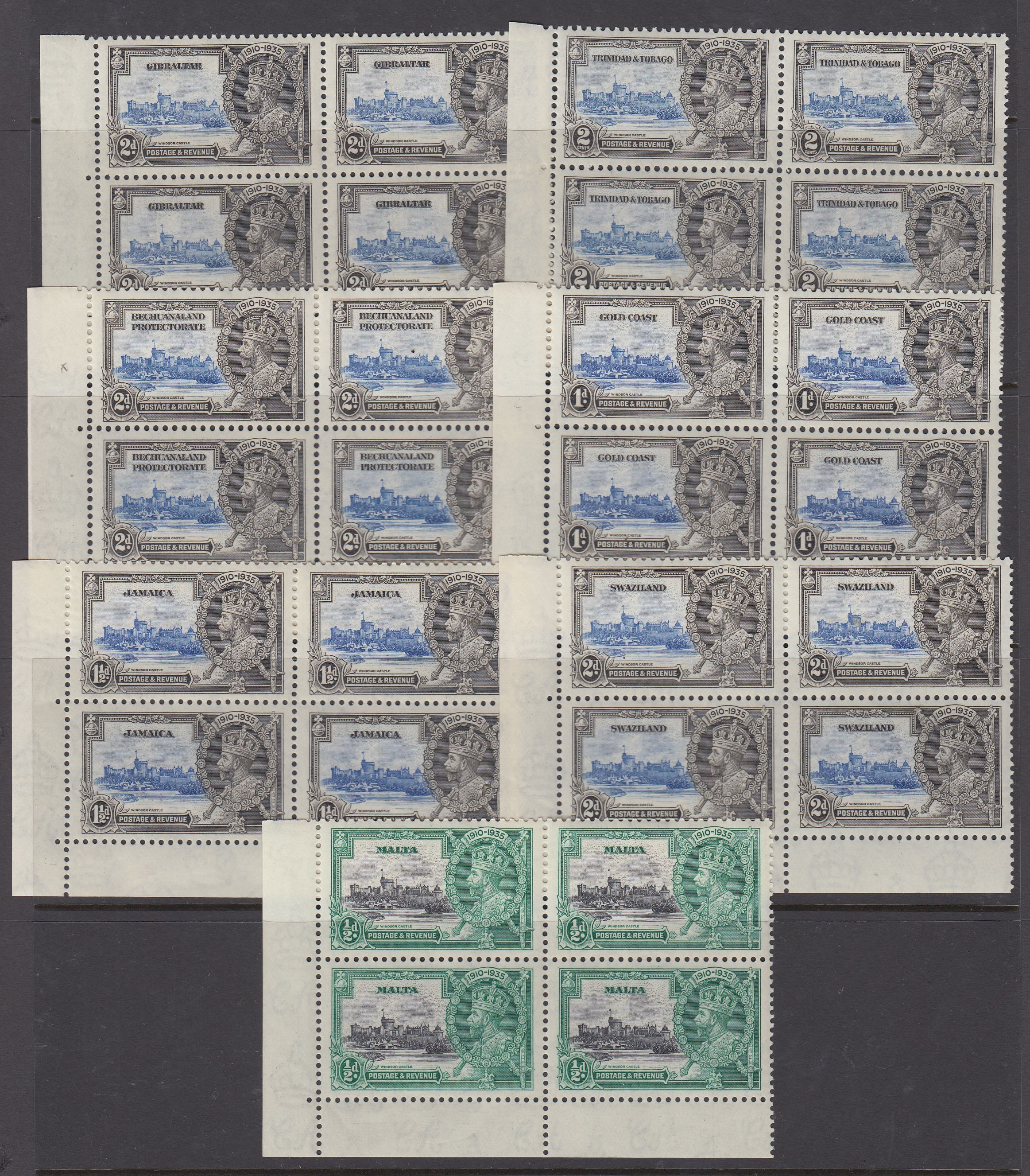 A group of seven SJ mint marginal blocks of four, each showing listed variety ‘Extra Flagstaff’, including Bechuanaland 2d, Gold Coast 1d and Swaziland 2d, noted various tone spots, Cat £620