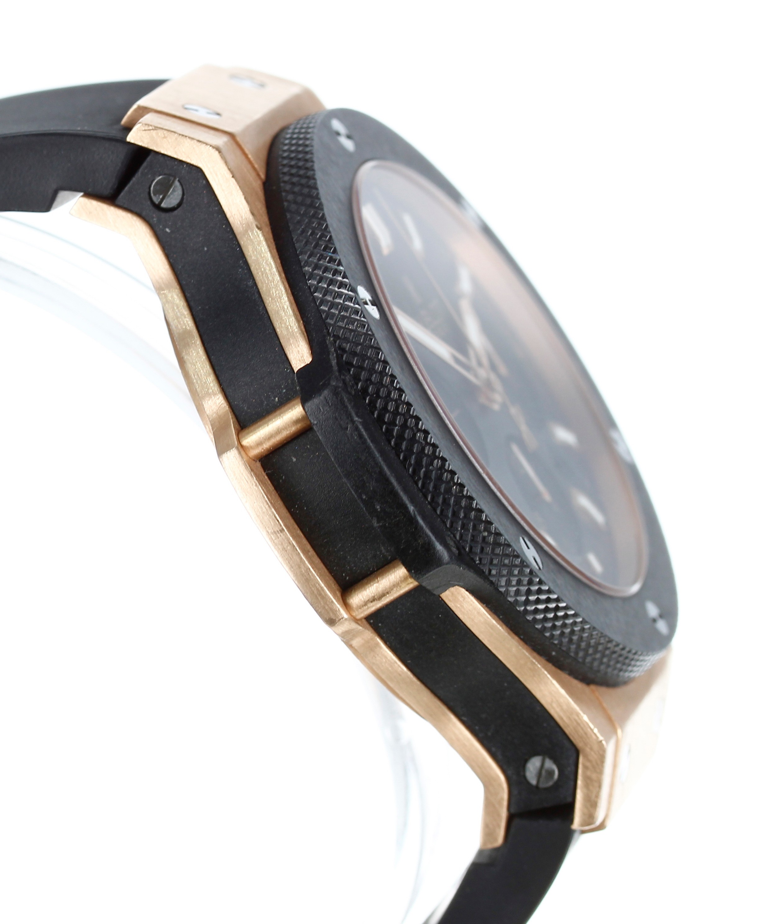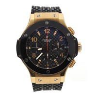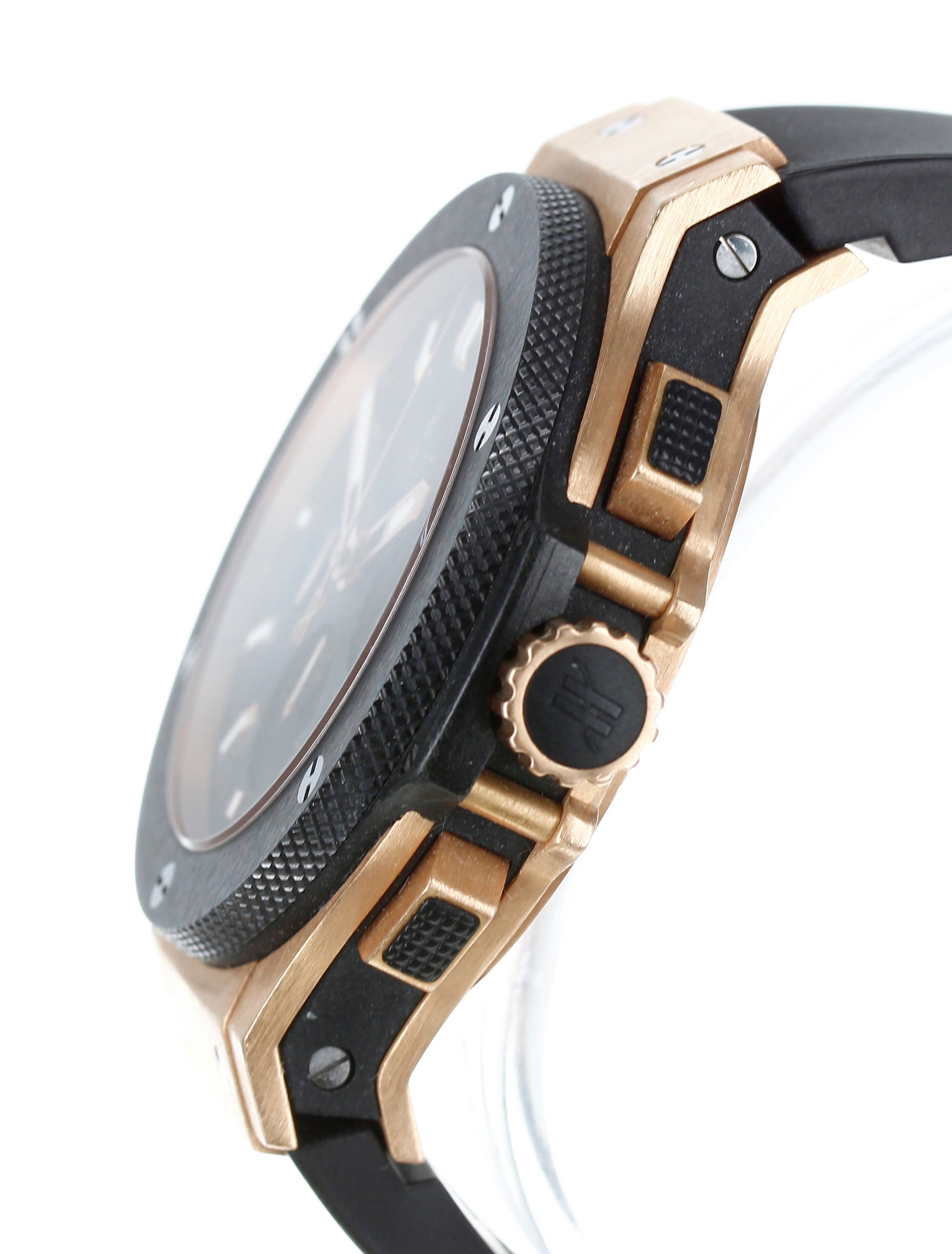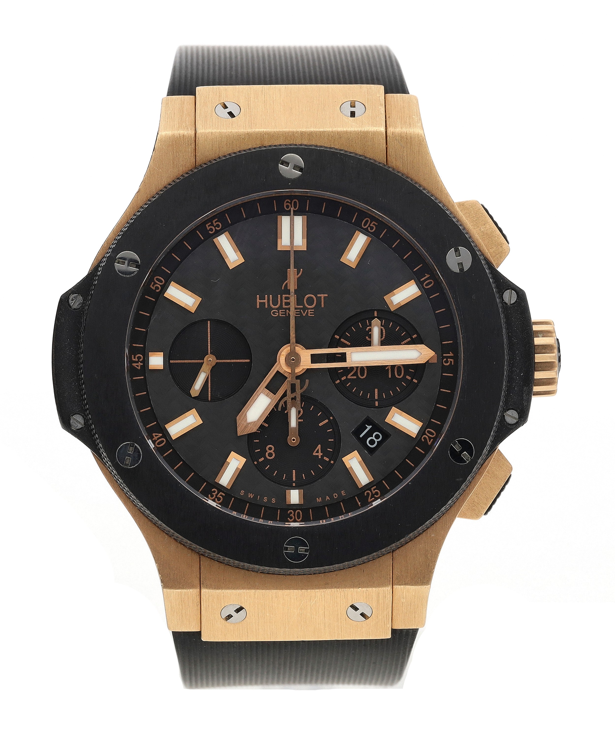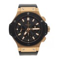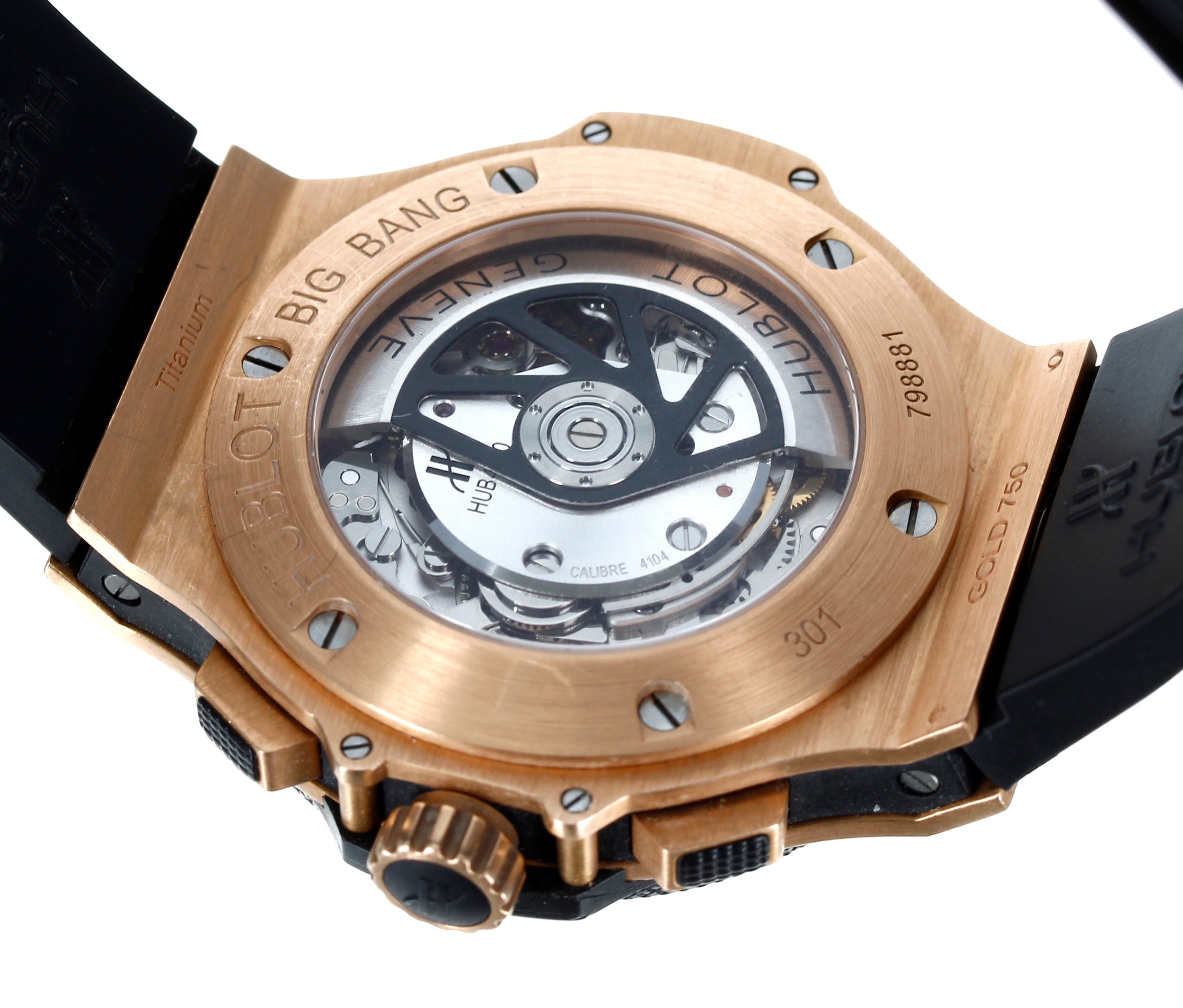 Hublot Big Bang Chronograph 18ct rose gold and titanium automatic gentleman's wristwatch, reference no. 301.PM.1780.RX, serial no. 798xxx, black carbon fibre dial, black ceramic bezel, signed HUB4100 cal. 4104 27 jewel movement, exhibition case, Hublot black rubber strap with signed 18ct and stainless steel folding clasp, 42mm bezel (ref: 201)