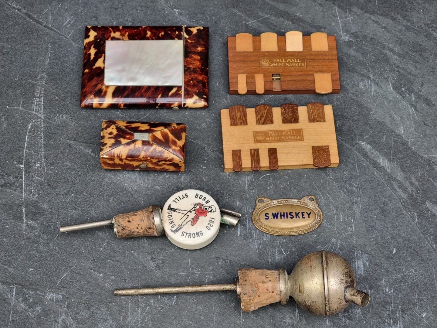 A mixed lot, to include a tortoiseshell, mother-of-pearl and ivory card case, 10.5 x 8cm; and another miniature tortoiseshell casket. (7) DEFRA Ivory Act submission ref: ED8VMQ6W.