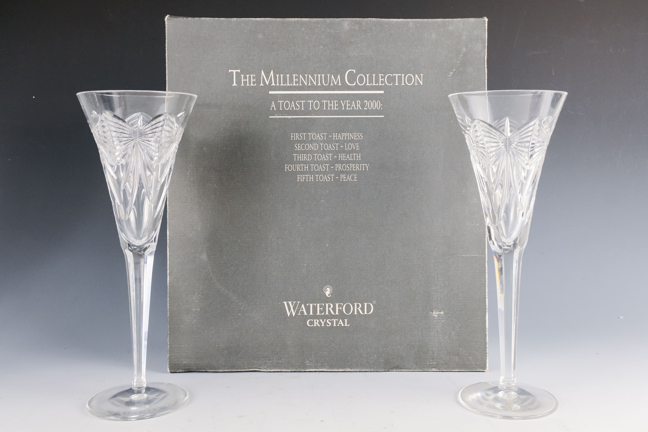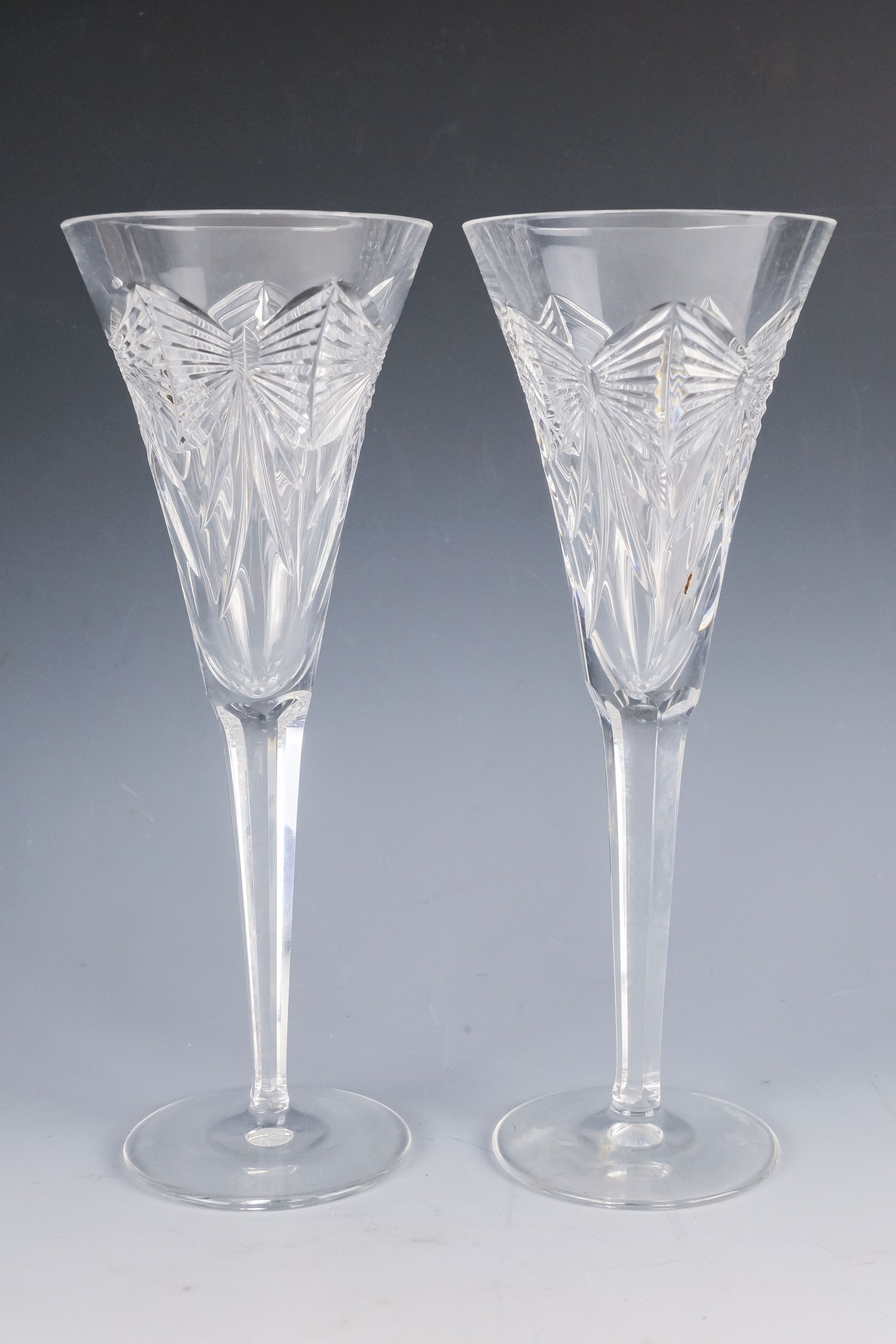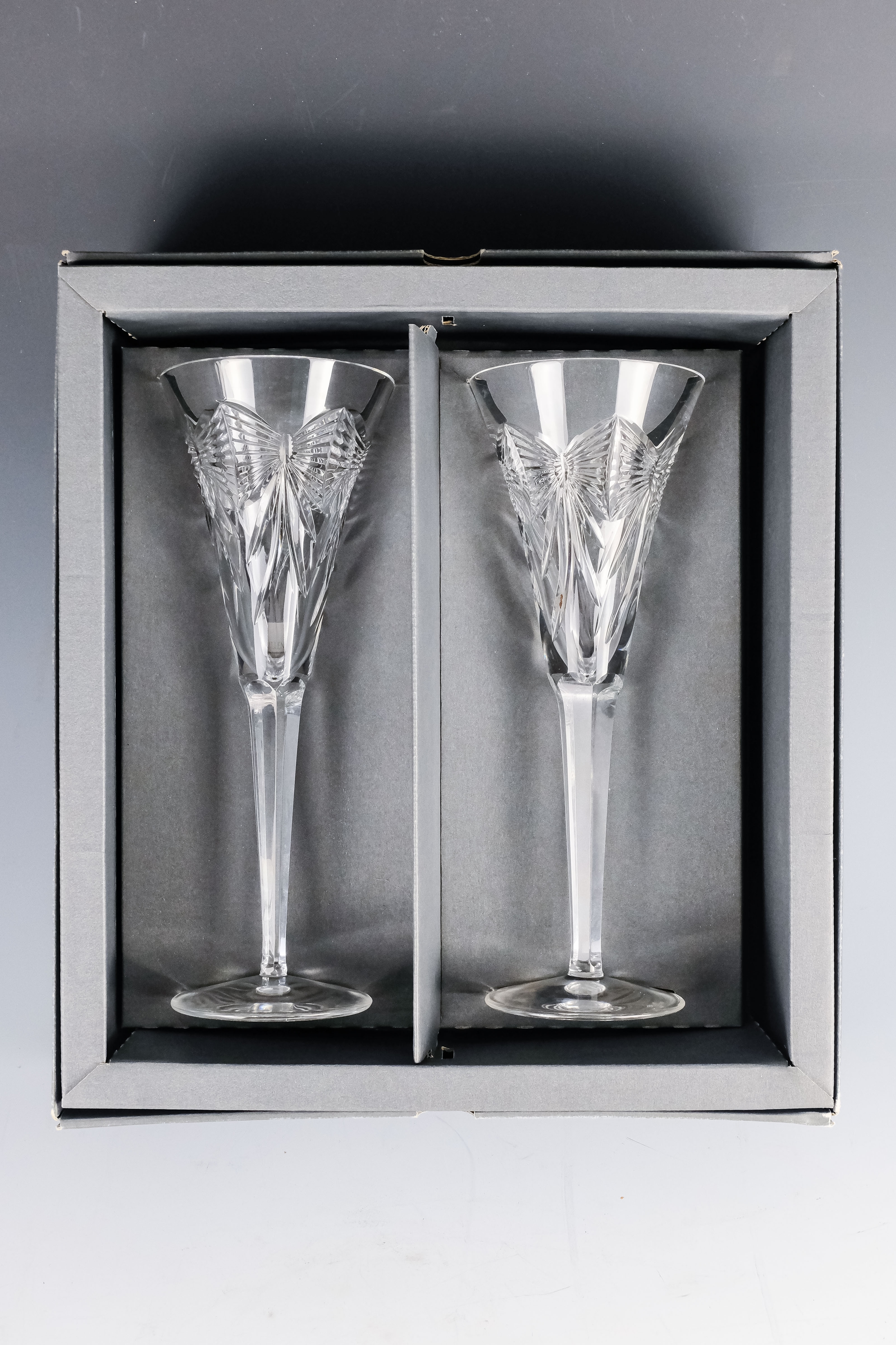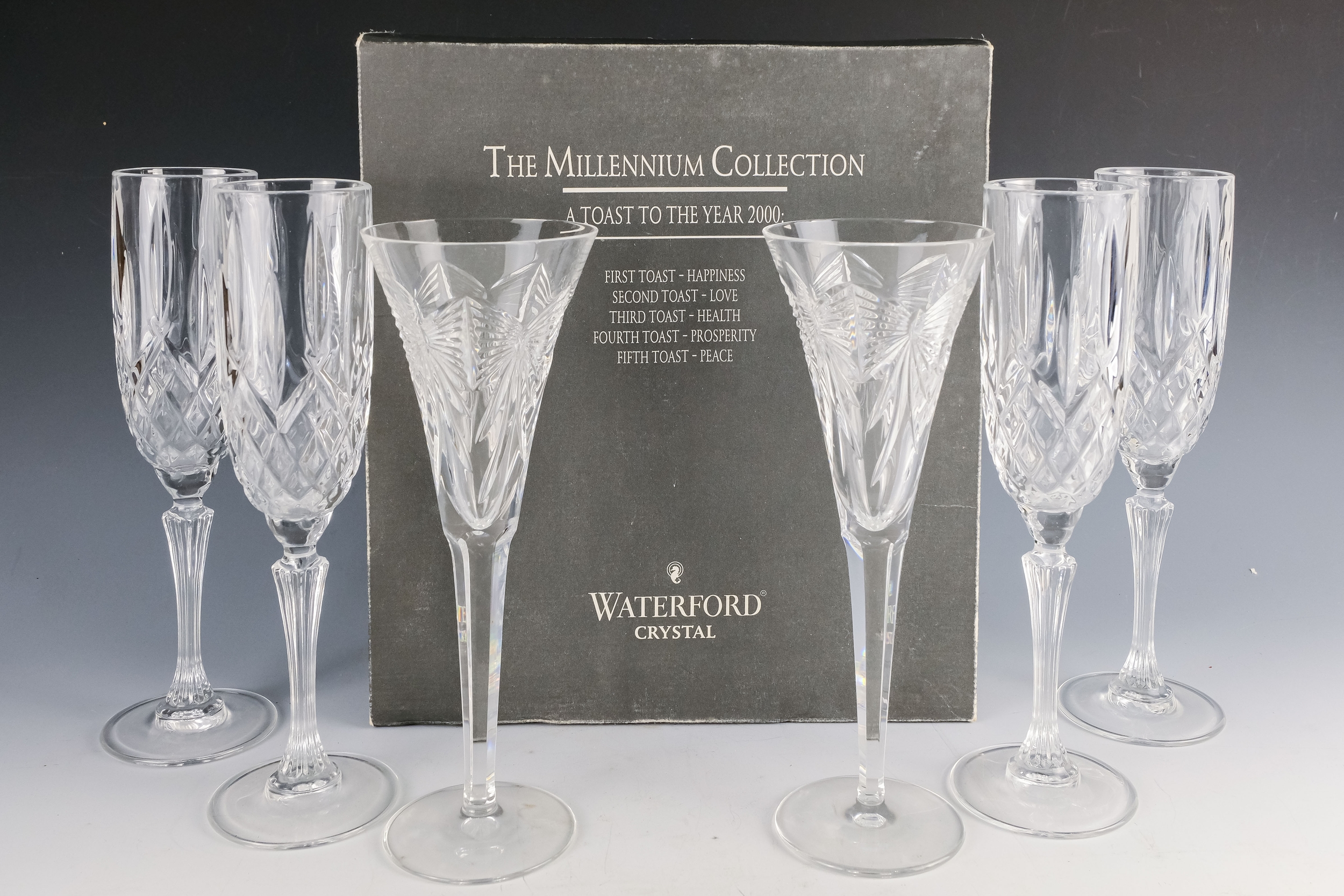 A pair of Waterford crystal glass champagne flutes, boxed - together with four other champagne flutes.