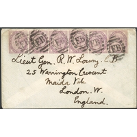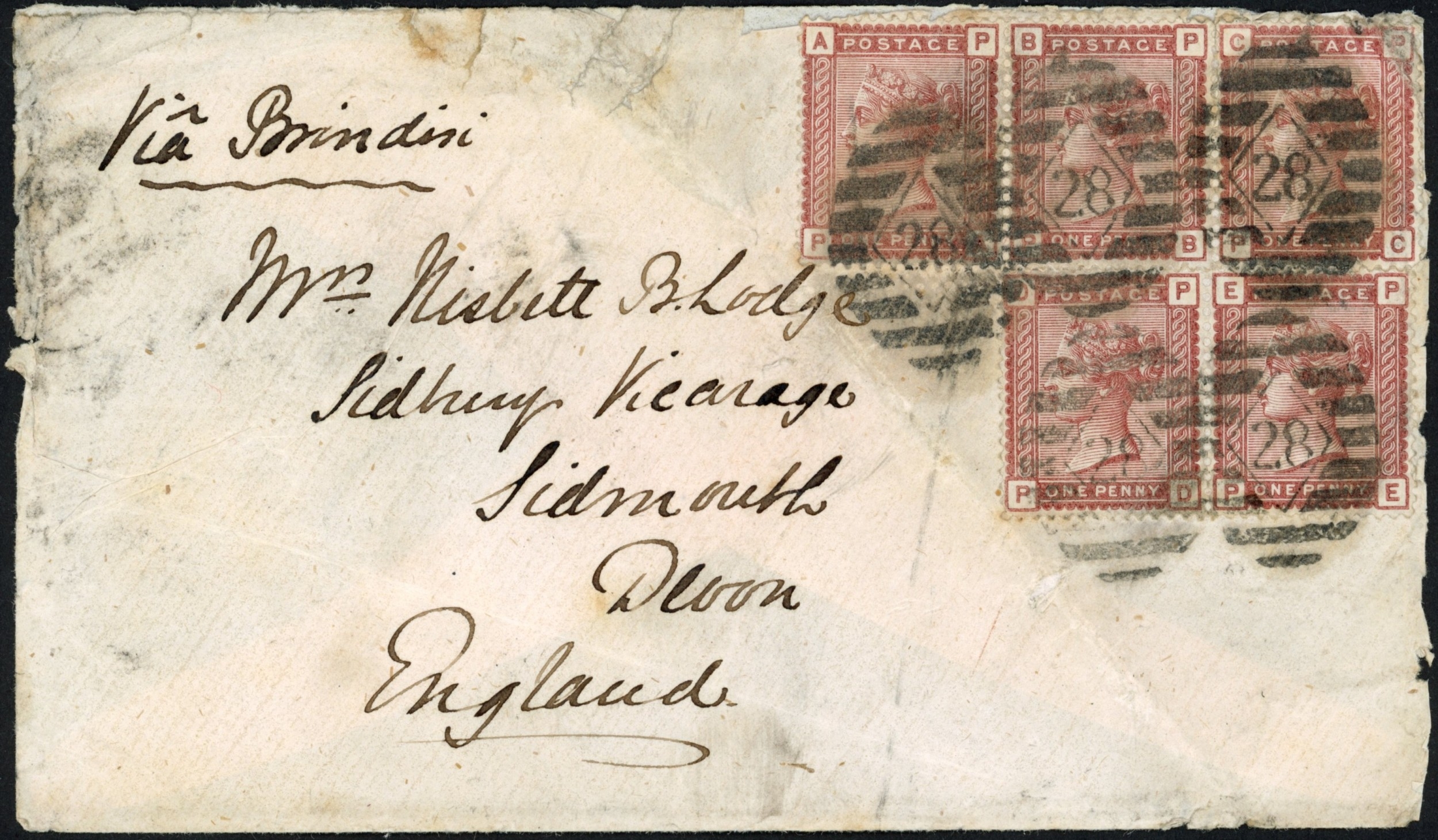 ROYAL NAVY MAILS - RANGOON - SHIP'S BAG USAGE OF G.B. 1d VENETIAN REDS ON COVER TO G.B.: Nov. 1880 env. (some grubby creasing but still attractive) to Sidmouth Via Brindisi addressed to Mrs. Nisbett B. Lodge whose husband Rev. N.B. Lodge, was swerving as Royal Navy Chaplain on HMS Eclipse at this time. The ship's log shows that she was at Rangoon throughout Nov. 1880; this letter is franked by five GB 1d venetian reds tied by fine London barred "28" numerals with 16 Dec. 1880 Sidmouth arrival cds, which fits the shipping timetables for mails sent from Burma via India for Nov. 1880. Rare example of Naval Bag Mail from Burma. [Ex Osborn Sale June 2007 Lot 35 £170+BP]Cross Reference: BURMA, NAVAL MAIL