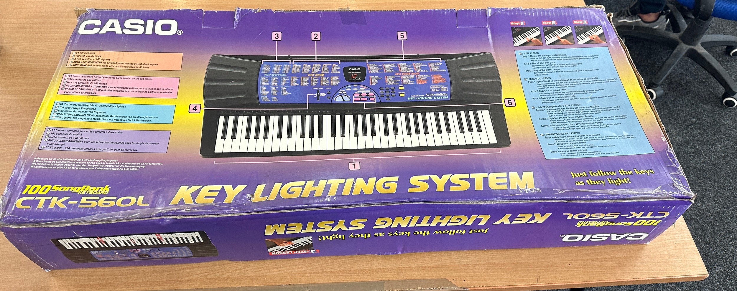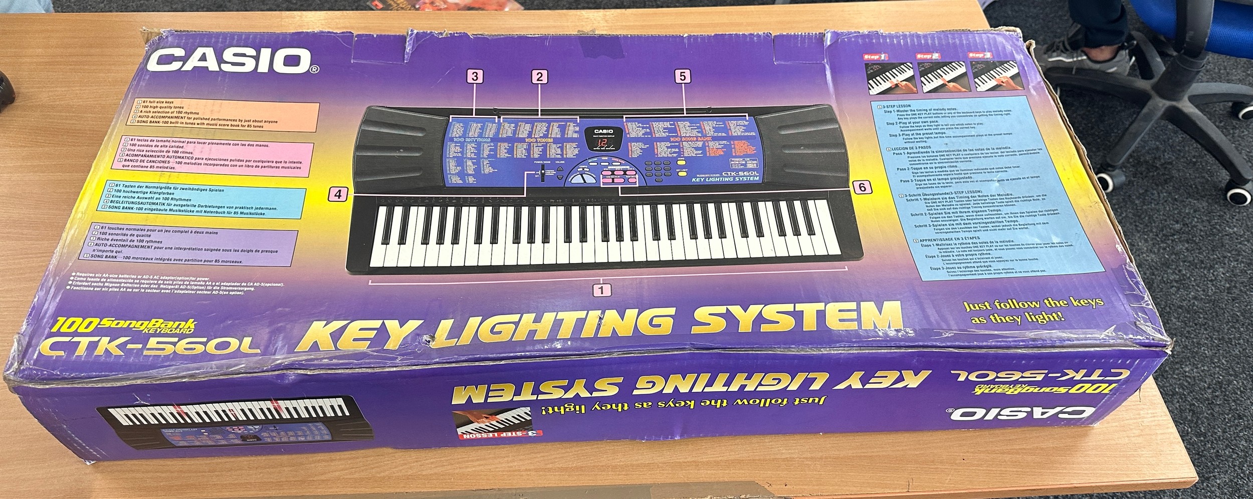 Boxed Casio 100 song bank keyboard, ctk-560l key lighting system and stand