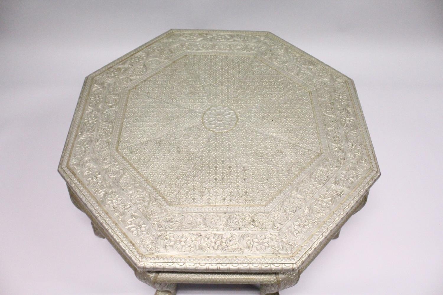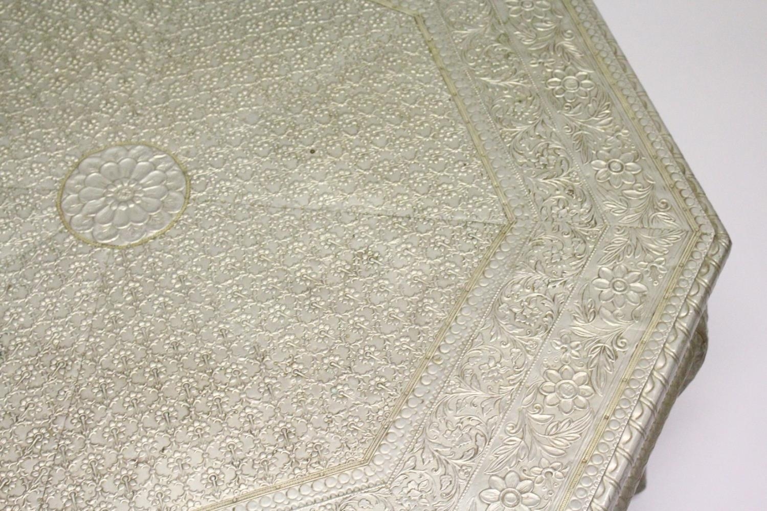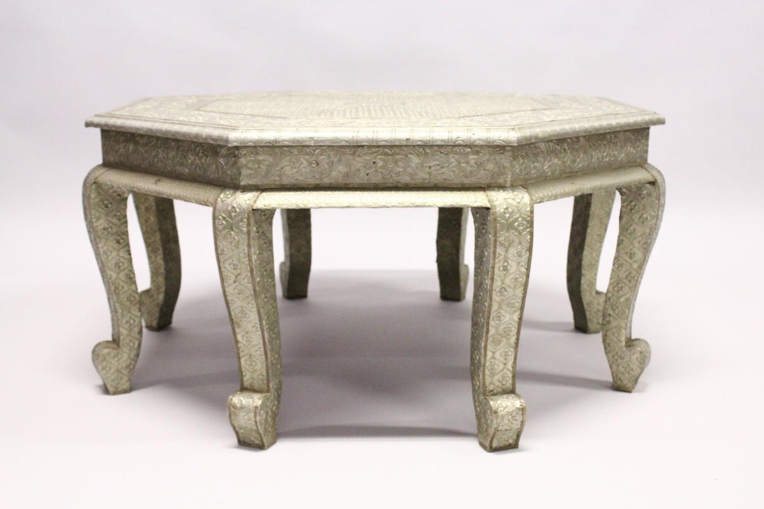 A 19TH CENTURY INDIAN SILVERED OCTAGONAL COFFEE TABLE on eight curving legs.