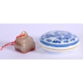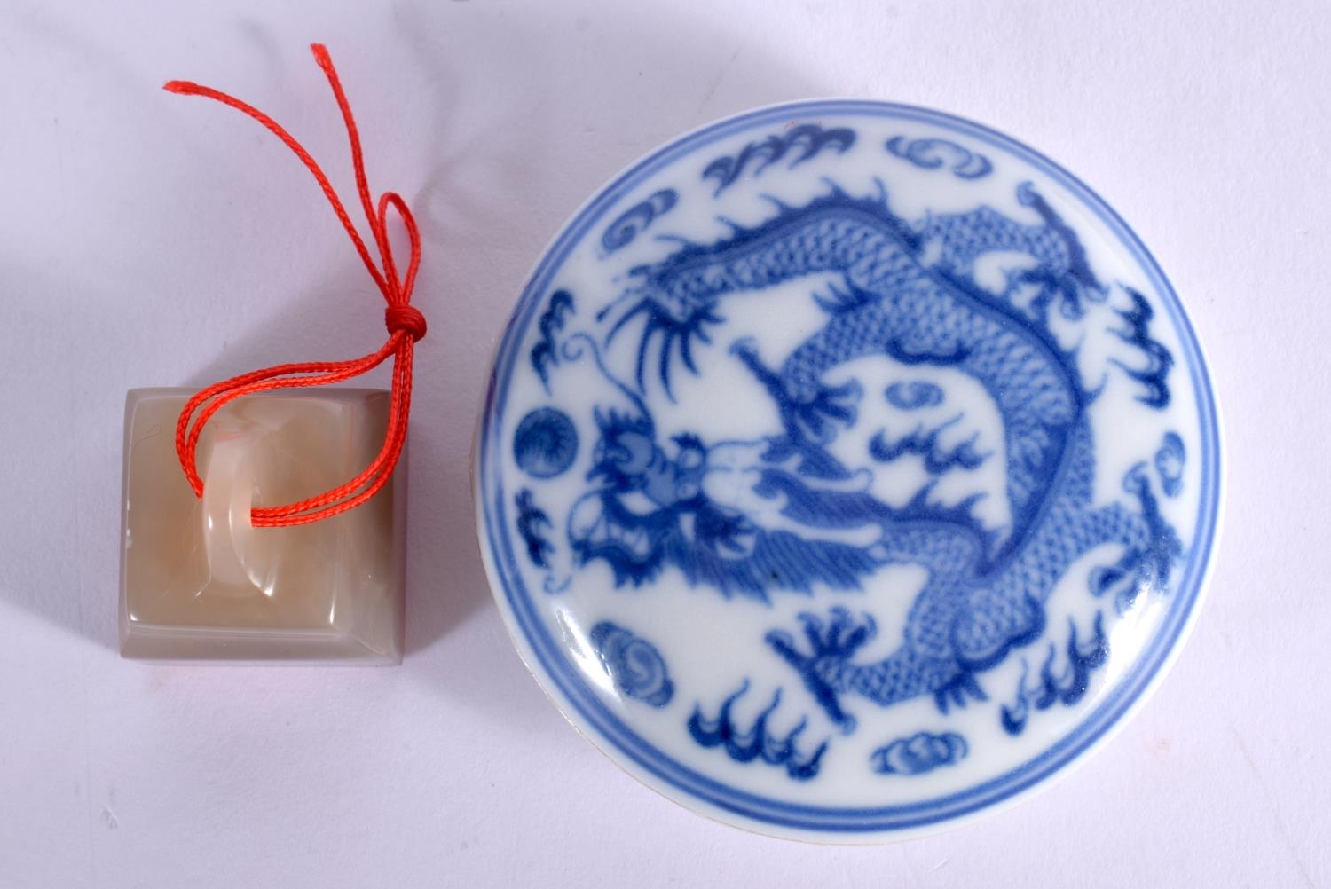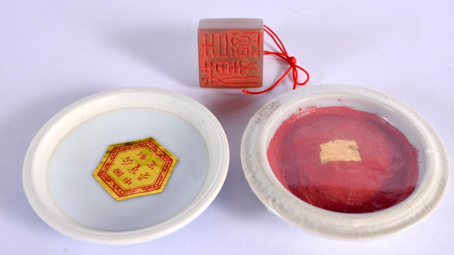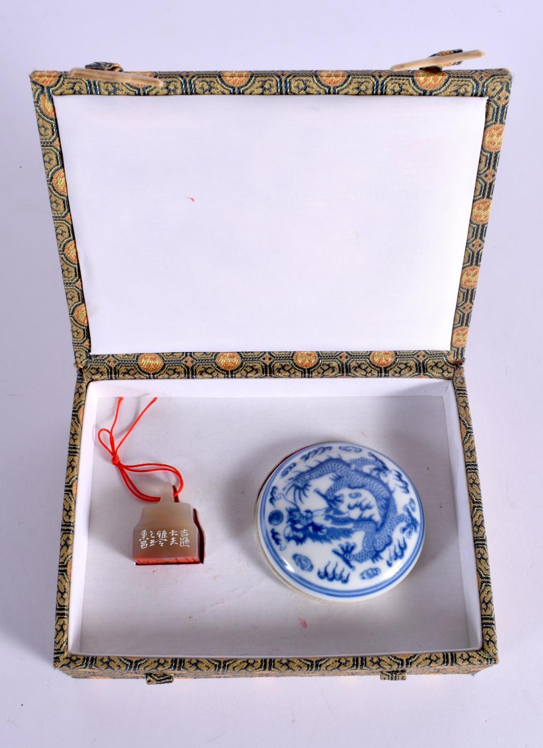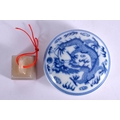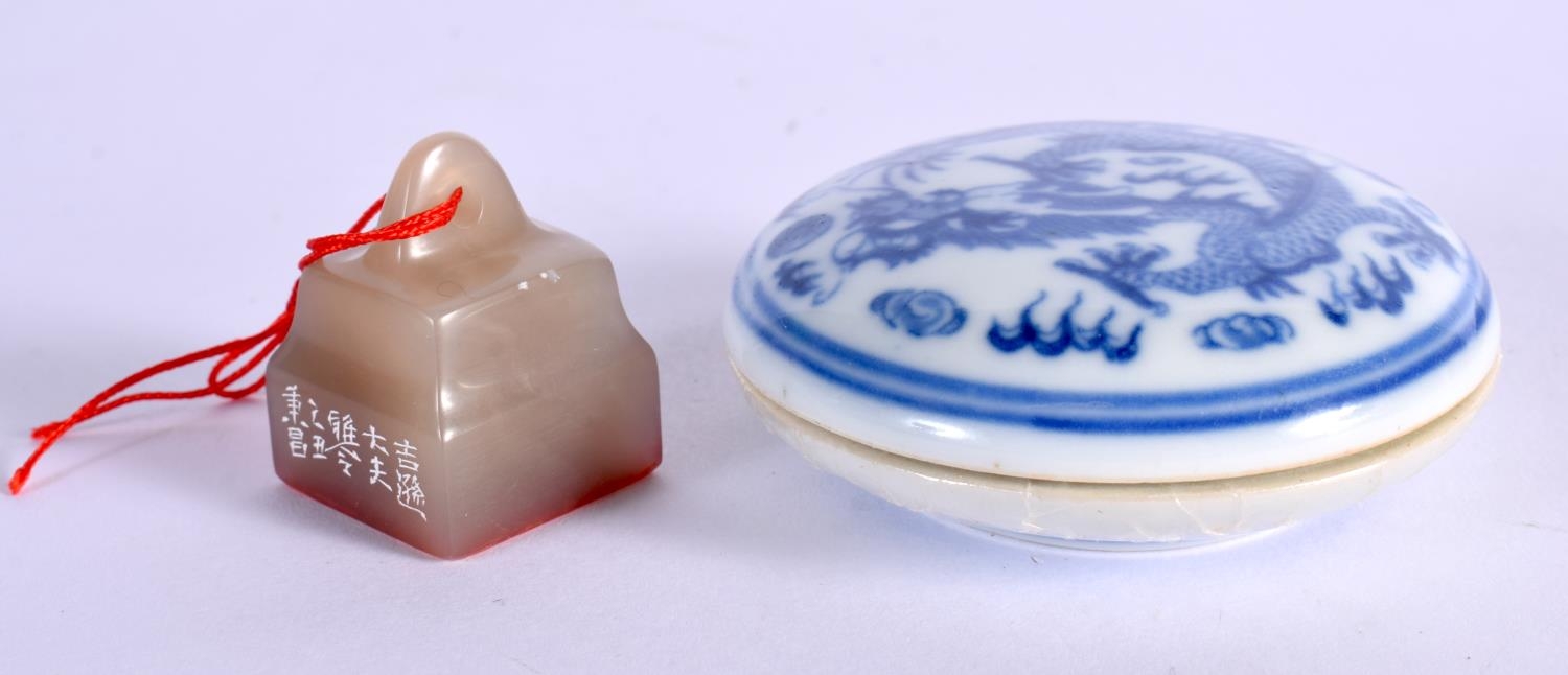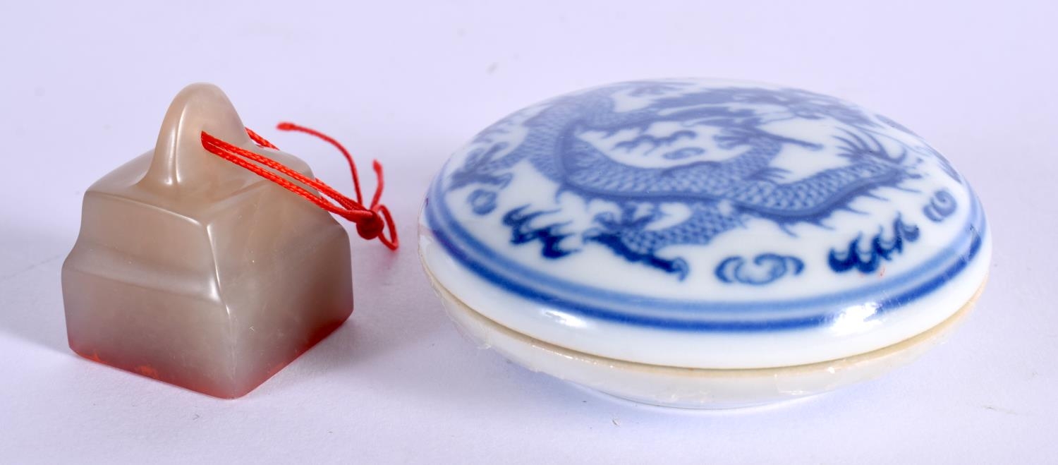 AN EARLY 20TH CENTURY CHINESE CARVED SOAPSTONE SEAL together with a paste box. (2)