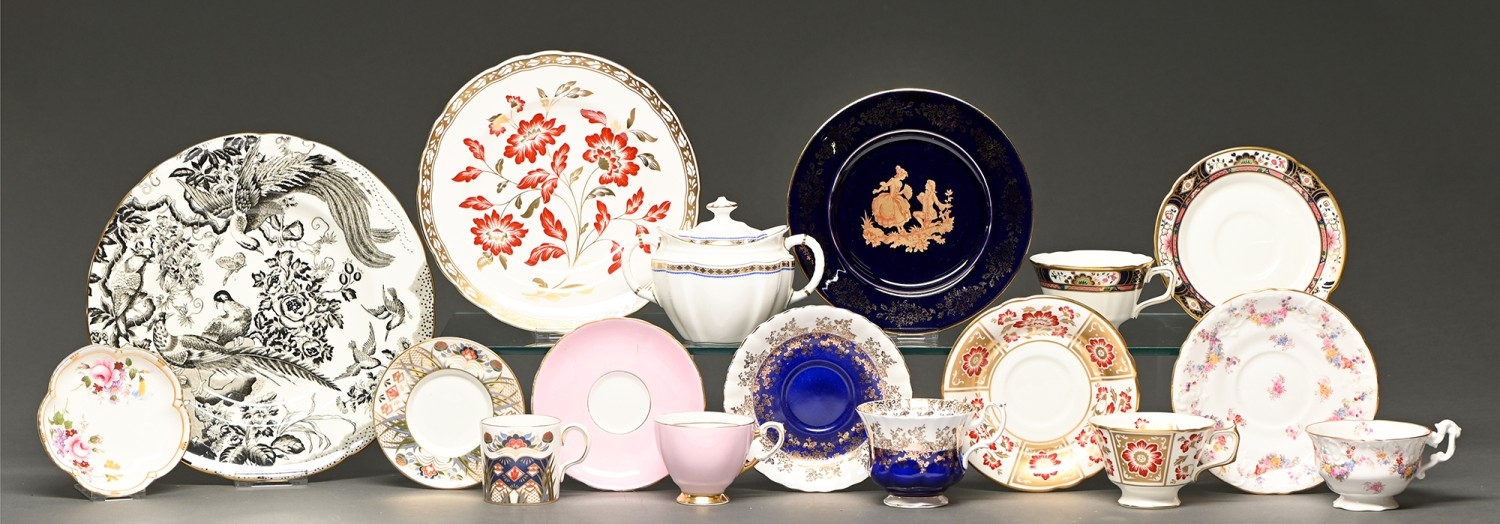 Miscellaneous Royal Crown Derby teaware, late 20th c, the patterns to include Black Aves, Rutland and Chelsea Garden, 26.5cm diam, printed mark and various other bone china teaware (17)