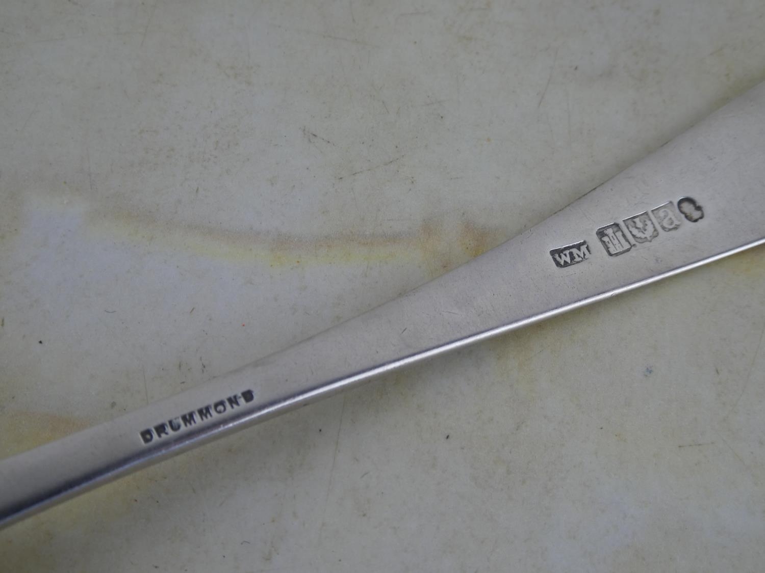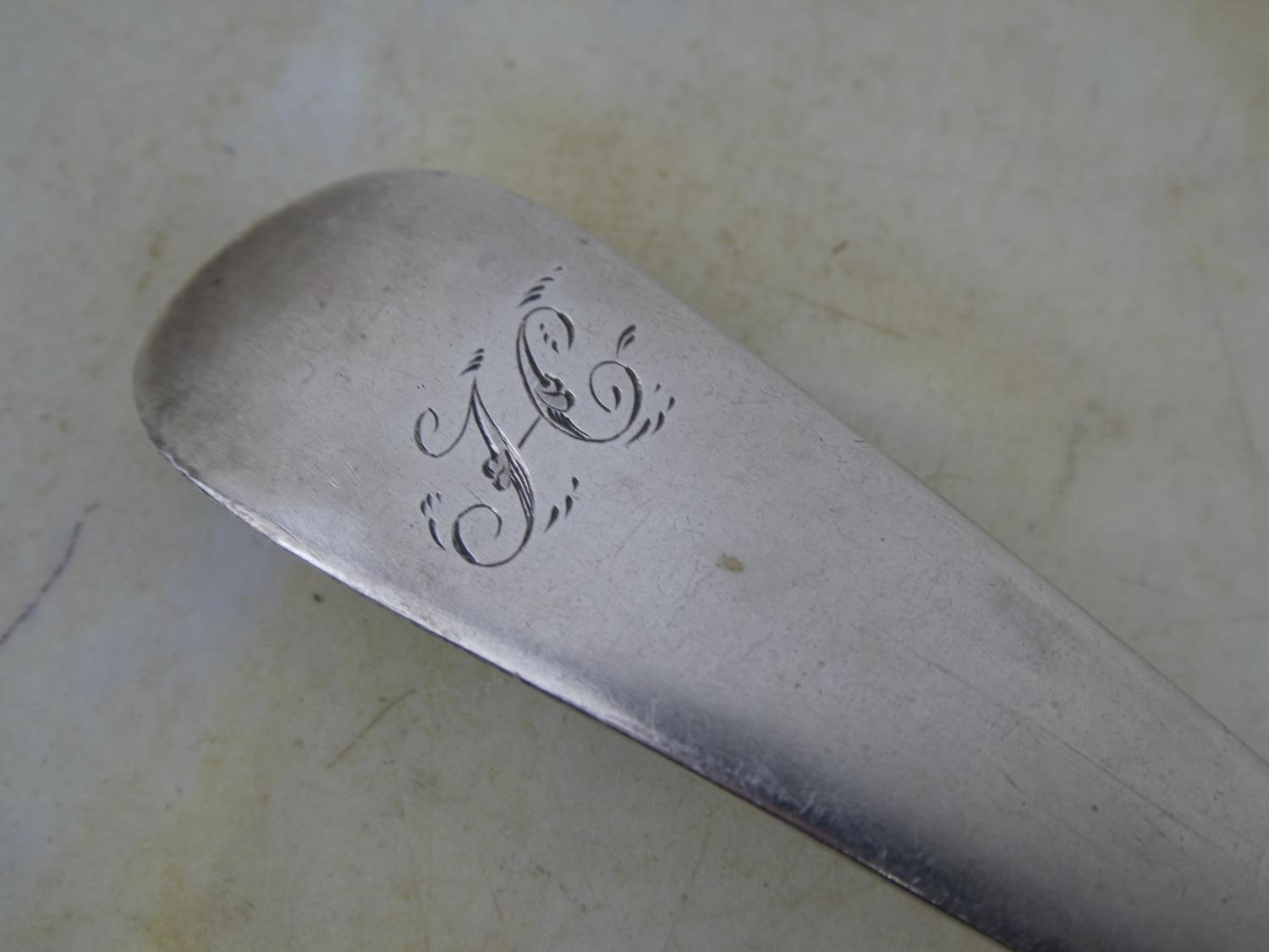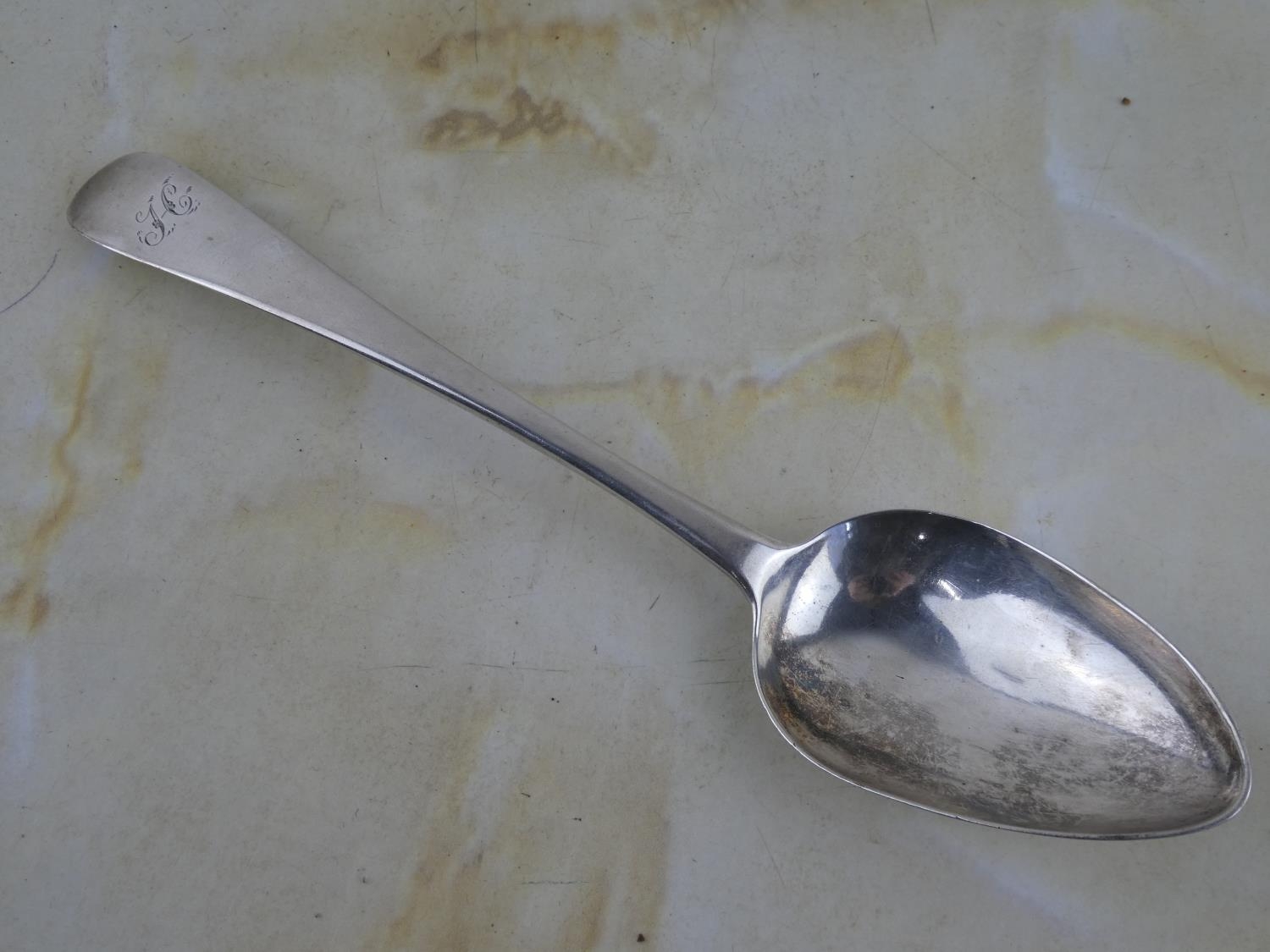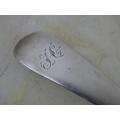 A large antique/ Georgian Scottish silver serving spoon, crested with the letter 'H'.