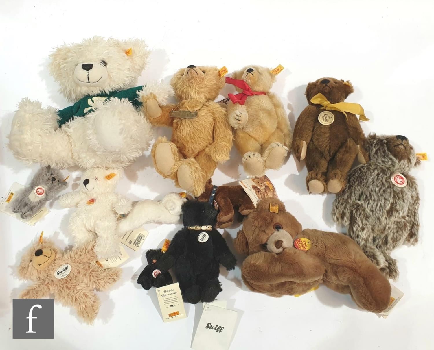 A collection of assorted Steiff teddy bears, to include Centenary Bear USA Anniversary, yellow tag 660337, caramel mohair, height 30cm, 1909 Replica Bear, yellow tag 406201, blonde mohair, Floppy Teddy, Charly Teddy, Jungbar miniature bear, etc. (13)
