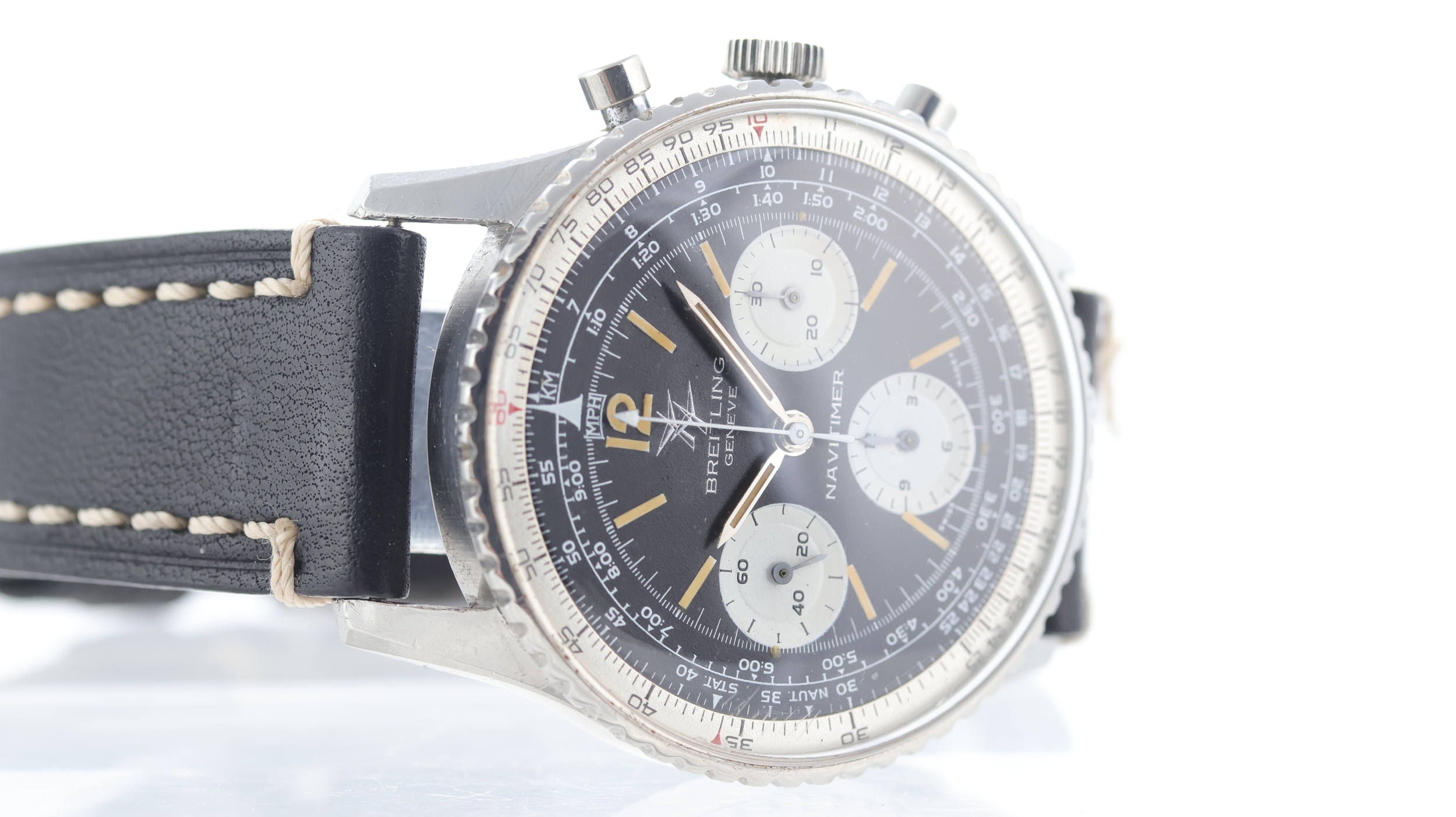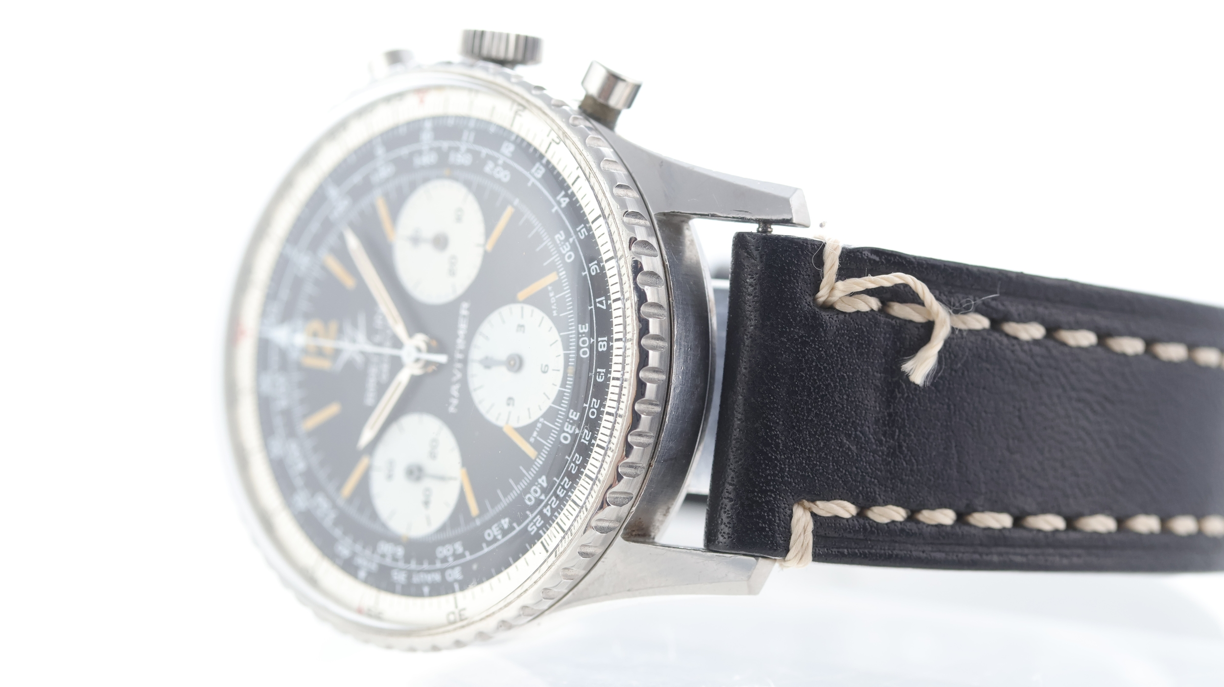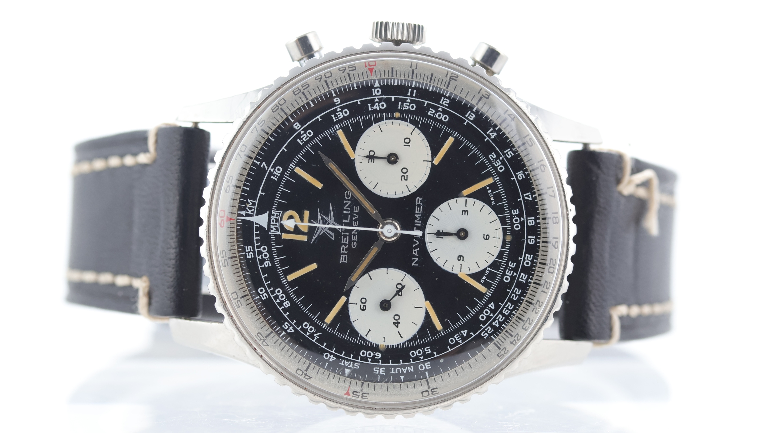 Dial features: Baton hour markers, three white subsidiary dials, white slide rule bezel