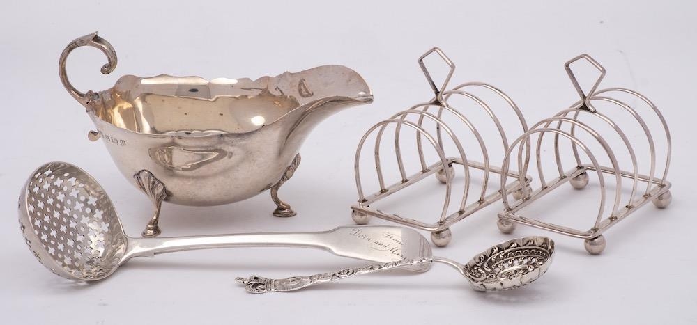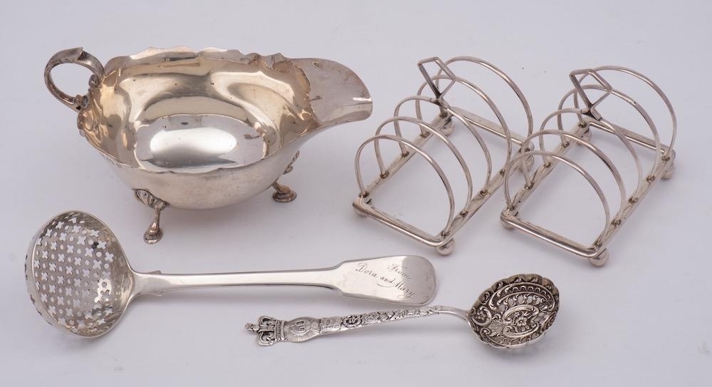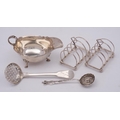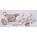 A mixed lot of silver wares: including a pair of George V silver four-division toast racks, maker Adie Brothers Ltd, Birmingham, 1929, a silver sauce boat and two sifting spoons, total weight of silver 196gms, 6.31ozs.